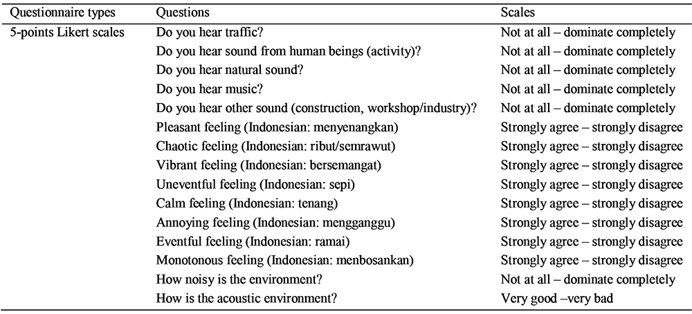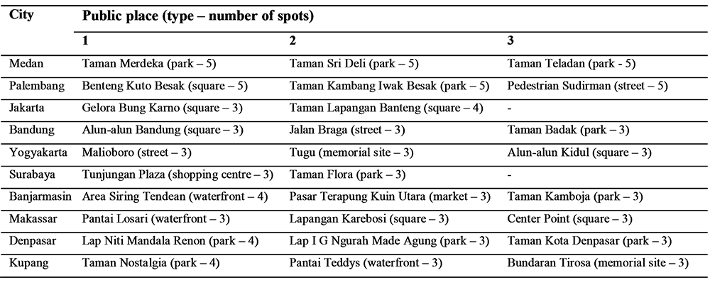 A A A Volume : 44 Part : 2 Proceedings of the Institute of Acoustics The eventful environment that characterises Indonesia's urban sound scape Christina E. Mediastika1, Department of Architecture, Ciputra University, Surabaya, Indonesia Anugrah S. Sudarsono2, Kelompok Keahlian Fisika Bangunan, Institut Teknologi Bandung, Bandung, Indonesia Sentagi S. Utami3, Department of Physics Engineering, Universitas Gadjah Mada, Yogyakarta, Indonesia Isnen Fitri4, Department of Architecture, Universitas Sumatera Utara, Medan, Indonesia Rizka Drastiani5, Department of Architecture, Universitas Sriwijaya, Indralaya, Indonesia MI Ririk Winandari6, Department of Architecture, Universitas Trisakti, Jakarta Barat, Indonesia Akbar Rahman7, Department of Architecture, Universitas Lambung Mangkurat, Banjarbaru, Indonesia Asniawaty Kusno8, Department of Architecture, Hasanuddin University, Gowa, Indonesia NW Meidayanti Mustika9, Department of Architecture, Universitas Warmadewa, Denpasar, Indonesia Yuliana B10. Mberu, Department of Architecture, Universitas Katolik Widya Mandira, Kupang, Indonesia Ressy J. Yanti11, Department of Physics Engineering, Universitas Gadjah Mada, Yogyakarta, Indonesia Zulfi A. Rachman12, Department of Physics Engineering, Universitas Gadjah Mada, Yogyakarta, Indonesia ABSTRACT Noise control is still one method to improve the urban acoustic environment in many countries, including Indonesia. The noise control tries to reduce the sound level in a particular space to increase comfort. In other words, the acoustic environment is designed to be comfortable and uneventful. Previous studies have shown that public spaces in Indonesian cities have a unique sound than cities in developed countries. Here, further studies to investigate whether the soundscapes of these cities are also unique are reported. Soundscape surveys added with sound pressure level (SPL) measurement and audio recording in 28 public places in ten major Indonesian cities indicate that a noise control approach to provide acoustic comfort and uneventful public spaces may not suit Indonesia. The analysis shows that, in general, the soundscape is perceived as an eventful environment, which is compatible with the SPL and audio recording. Furthermore, the results were significant among the ten cities. This study shows that soundscape improvement should focus on developing an environment that is perceived as eventful and comfortable at the same time. Therefore, a different strategy is needed to improve the acoustic environment in Indonesia. 1. INTRODUCTION Previous studies related to the noise of cities in Indonesia have shown that Indonesian cities are considered noisy [1]. This is because city sounds have sound pressure levels (SPL) above the Indonesian standard and are dominated by human activities, traffic, construction, and industry [2]. However, the high noise level is not considered negative by Indonesians, which is quite surprising because noise is considered detrimental in many countries, so it needs improvement [3,4,5,6]. Furthermore, noisy public places are acceptable because Indonesians are mostly expecting communal activities while visiting public places [2]. In contrast, people with different cultures, such as in developed countries, usually carry out individual activities every time they visit public places [7]. Cities in Indonesia, represented by public places such as parks, squares, markets, memorial sites, and waterfronts, have unique sounds compared to cities in developed countries [2]. They are dominated by sounds from human activities, including people talking, children playing, music, etc. All these sounds indicate that Indonesians mostly interact with other people when in public, and the sounds they enjoy are the sounds they make based on their activities. This study focuses on identifying the concept of improving the acoustics of public spaces in Indonesia using soundscapes. This approach was selected because soundscape tries to analyse human interaction with the acoustic environment in a more holistic approach than noise measurement based on SPL [8]. 2. METHODS 2.1. Selection of Public Places Indonesia is a large country that stretches from a city called Sabang on the westernmost side to Merauke on the easternmost side. There are 98 cities in Indonesia [9], but only a few are categorised as large or metropolitan cities with high density, most of which are located on the island of Java. Based on the preliminary study to map the sounds of cities in Indonesia, ten Indonesian cities were selected for this research. The ten cities represent different city sizes, locations (entirely land or seaside), and cultures. They are Medan, Palembang, Jakarta, Bandung, Yogyakarta, Surabaya, Banjarmasin, Ma kassar, Denpasar, and Kupang. All of them are provincial capitals covering the western to eastern parts of Indonesia – namely North Sumatra, South Sumatra, Special Capital Region, West Java, Special Region of Yogyakarta, East Java, South Kalimantan, South Sulawesi, Bali, and East Nusa Tenggara respectively. Twenty-eight public places in ten cities were surveyed. Each city is represented by three public places, except for Jakarta and Surabaya, only two. Twenty-eight public places vary from parks to markets and shopping malls. As such, they comprehensively represent the diverse preferences of public places to be visited by Indonesians of various cultures and economic levels. The study was planned to collect data from 30 public places, as in the initial study. However, the coronavirus pandemic from 2020 to early 2022 forced the local municipality to close several public places to avoid crowds. Two planned public places remain closed during the survey. Thus, this study collected data on 28 public places only, consisting of 11 parks, seven squares, two memorial sites, three waterfronts, three streets, one market, and one shopping centre (Table 1). By the end of the research period, a public place, a mix of parks, squares,