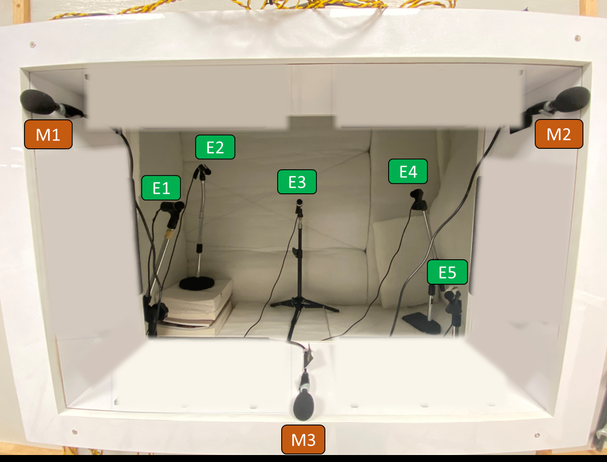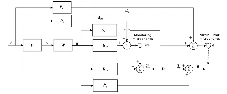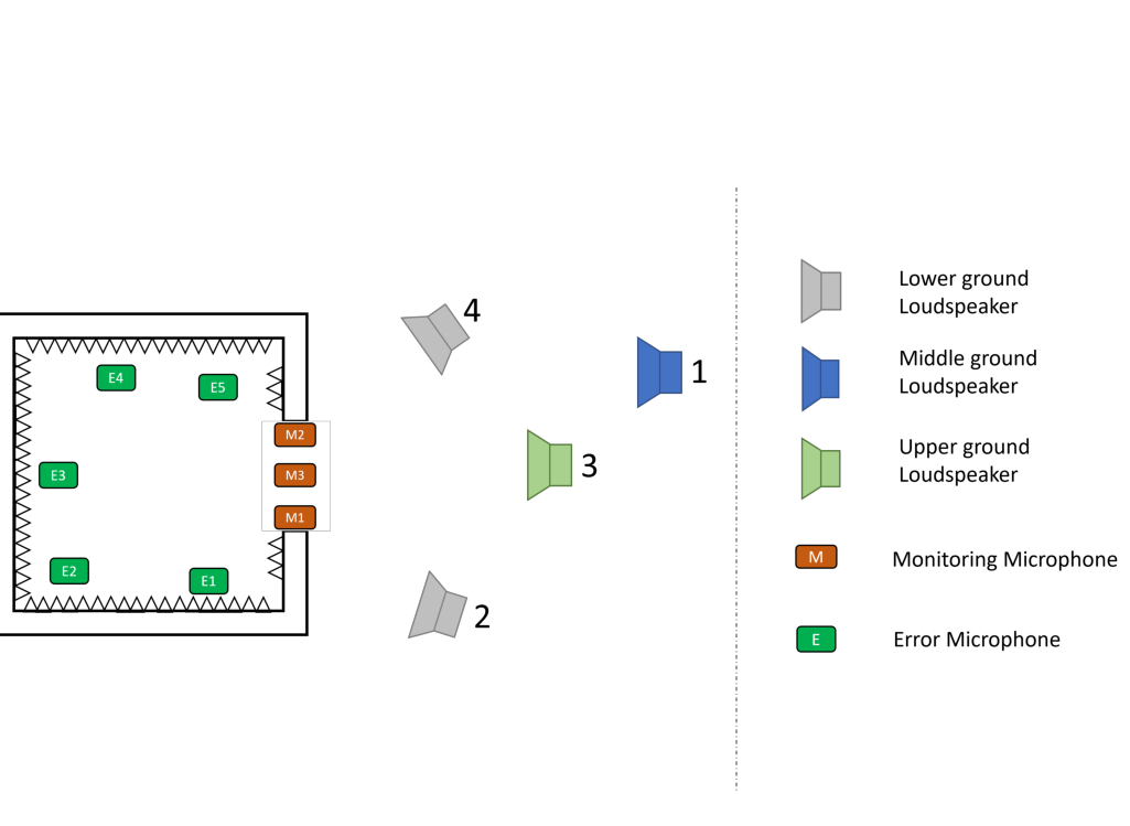 A A A Volume : 44 Part : 2 Robust estimation of open aperture active control systems using virtual sensingChung Kwan Lai School of Electrical and Electronic Engineering, Nanyang Technological University 50 Nanyang Ave, 639798Bhan Lam 1School of Electrical and Electronic Engineering, Nanyang Technological University 50 Nanyang Ave, 639798Jing Sheng Tey School of Electrical and Electronic Engineering, Nanyang Technological University 50 Nanyang Ave, 639798Woon Seng Gan School of Electrical and Electronic Engineering, Nanyang Technological University 50 Nanyang Ave, 639798ABSTRACT For active noise control systems in an open aperture application, virtual sensing system is often needed to overcome design constraint in terms of microphone placement. The virtual sensing system, however, make assumptions to the acoustical field and thus is highly sensitive to any changes in the primary field. Taking the window aperture ANC application for example, incoming disturbance signals could impinge from multiple locations, altering the spatial correlation between the physical and virtual microphones. For instance, in the context of a high-rise apartment window, aircraft noise would propagate downwards from the sky, whereas tra ffi c noise propagate upward from the ground. This paper considers the estimation performance of the remote microphone technique, an example of a virtual sensing method, in an open aperture application when faced with changes in the primary noise source. Additionally, this paper introduces a new method for estimating the spectral density due to multiple sources through the incoherent decomposition method. It has been shown experimentally that this algorithm is able to improve the nearfield estimation of the system.1. INTRODUCTIONThe use of virtual sensing technique in an active sound control application has become increasingly popular to tackle its physical limitation in positioning its error sensors at its desired location [1]. When1 bhanlam@ntu.edu.sga slaty. inter.noise 21-24 AUGUST SCOTTISH EVENT CAMPUS O ¥, ? GLASGOW applied to the open aperture active sound control application [2–5], virtual sensing involves estimating the sound pressure inside a room using pressure signals obtained from an array of static monitoring microphones installed at the edge of the window frame. This process can be achieved through the remote microphone technique, described in Section 2, via a fixed observation filter illustrated in Figure 1. This technique, however, made assumptions about the acoustic environment that will only result a good estimation if the acoustic field remain unchanged [6]. In the open aperture application, these noise sources are non-stationary and could arise from unknown directions. For example, it could be an aircraft noise that arises from the top; tra ffi c noise that propagates from the bottom; or a combination of both in which for either case, degrades the estimation accuracy of the virtual sensing system. This paper, while solely focused on the virtual sensing system, investigates the performance of the remote microphone technique when subject to uncertainties to di ff erent noise sources, followed by proposing a new calibration method, as described in Section 4, in obtaining the observation filter in which improve its robustness.2. VIRTUAL SENSING SYSTEM USING REMOTE MICROPHONE TECHNIQUEFigure 2 shows the block diagram arrangement of a virtual sensing system using the remote microphone technique [1, 7]. The observation filter, O , can be designed either as a filter in the frequency domain or a causal impulse response in time domain to minimise the expected mean square error between the estimated disturbance signal at the virtual microphone, ˆ d e , and the actual disturbance signal, d e . Thus, the optimal matrix of filter in the frequency and time domain is expressed as [8, 9]O opt ( j ω ) = S d m d e S d m d m + β I − 1 = P e S vv P H m P m S vv P H m + β I − 1 (1)andO opt [ n 0 ] = R T d m d e [ n 0 ] R d m d m [0] + β I ′ − 1 (2)respectively, where E [ · ] is the expectation operator and β is a regularisation parameter, S d m d e , S d m d m and S vv are spectral density matrices and R d m d e , R d m d m are the correlation matrices, each defined with a general notation of S xy ( ω ) = E h y ( ω ) x ( ω ) H i and R xy [ n 0 ] = E h x [ n ] y [ n − n 0 ] T i respectively. In this paper, it is assumed that no delay parameter is used, i.e. n 0 = 0, as the causality in the open aperture application is generally ensured by assuming that all noise source only propagate from one side of the aperture. The overall estimation error of the remote microphone technique will be used to evaluateFigure 1: The schematic of the adaptive feedforward control in an open aperture active control system, using virtual sensing based on the remote microphone technique. the accuracy of the virtual sensing system, given bytrace { S ϵϵ } trace S d e d e(3)L ϵ = 10 log 10where ϵ = d e − ˆ d e , assuming stationary noise source throughout the evaluation period. The regularisation parameter β from Equation 1 and Equation 2 improves robust stability and performance of the active control system when subject to uncertainties in the acoustic environment [7, 10], though it is assumed to be 0 here as feedforward adaptive control filter was not implemented in this study.de In Pm Ge Monitoring Virtual Error microphones microphones w Gm GnFigure 2: Block diagram of the virtual sensing control algorithm using remote microphone technique [7].3. NEARFIELD ESTIMATION USING ARRAYS OF MONITORING MICROPHONESTo estimate the e ff ect of the virtual sensing in an open aperture when subject to changing noise source, three monitoring microphones were placed at the aperture frame with dimensions 0 . 6m × 0 . 2m and five virtual error microphones were placed inside the padded box that represents an anechoic room, shown in Figure 3a. Four primary loudspeakers, as shown in Figure 3b, wer