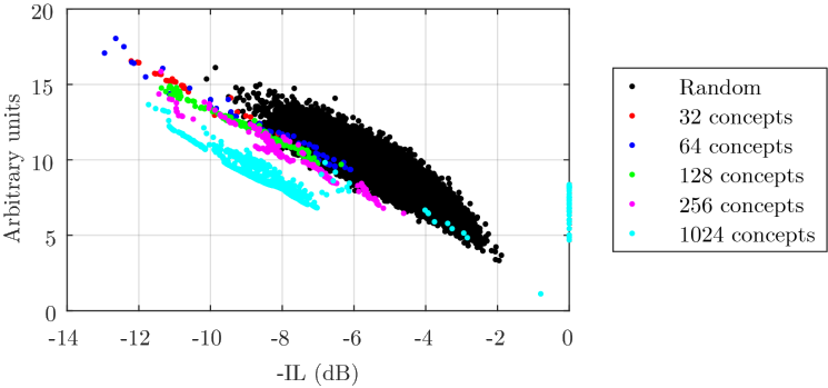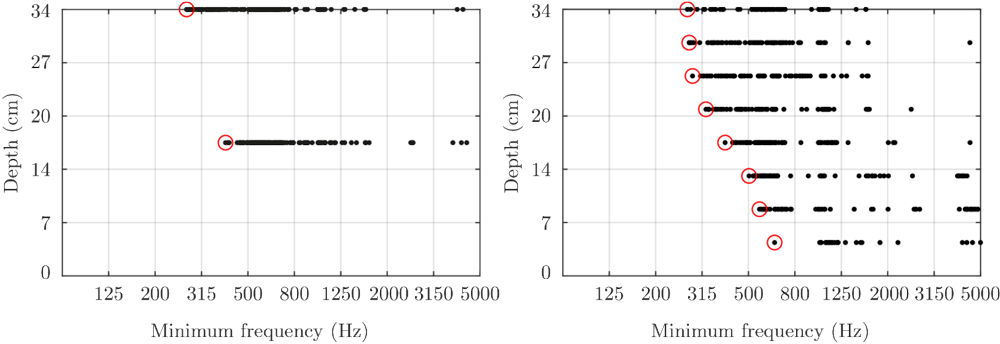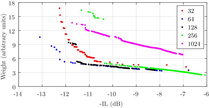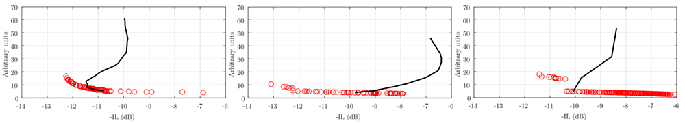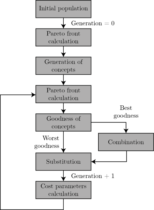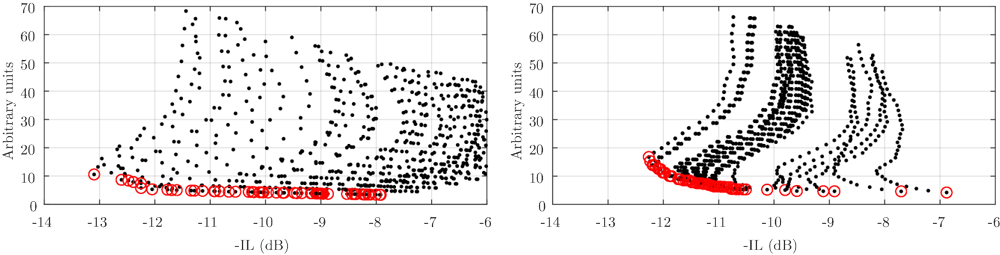 A A A Volume : 44 Part : 2 Proceedings of the Institute of Acoustics Evolutionary optimization processes for acoustic applications where size matters Daniel Benítez-Aragón1, Universidad Politécnica de Valencia, Valencia, Spain Jaime Galiana-Nieves2, Universidad Politécnica de Valencia, Valencia, Spain Javier Redondo3, Universitat Politècnica de València – Instituto de Investigación para la Gestión Integrada de Zonas Costeras, Valencia, Spain David Ramírez-Solana4, Universidad Politécnica de Valencia, Valencia, Spain Juan Manuel Herrero5, Universidad Politécnica de Valencia, Valencia, Spain ABSTRACT In acoustics, the relevance of size, scale and shape of the structures involved in a problem often brings complications when it comes to find the best possible solution. Scenarios such as the design of a room or a sound diffuser are some of the problems that we can find in which shape and size are factors to consider. In recent years, computational optimization methods have been developed to bring a different approach to the solving of these problems. These methods, based on genetic algorithms, provides us with continuous modifications and combinations between the elements involved in a problem that can help us obtain solutions that would be almost impossible to find with regular analytic solving. Our goal is to develop a multi-objective genetic algorithm to optimize various parameters of a design problem, being one of them related to the physical size of the element under study. For this purpose, we will not treat the objects being optimized as individuals, but as groups of individuals with the same proportions but variable scale, called “concepts”. With this method, we should obtain the optimum proportions for the problem faced, not only optimized individuals. 1. INTRODUCTION The purpose of this document focuses on defining optimization processes for acoustic applications whose behaviour are directly influenced by their size and geometry, since they are the most critical aspects of this kind of applications in the majority of the cases. These optimization processes shall be carried out with an evolutionary algorithm, in which new cases are generated iteratively based on the results of the previous cases, i.e. using genetic implementations. This evolutionary algorithm was implemented on a MATLAB code, which is applicable to any acoustic implementation that lies on geometrical properties. This code, based on multi-objective genetic algorithms (MOGA), allowed to find the best individuals for a two cost function problem, which usually are in conflict between each other. By defining the equations that describe the phenomenon, and the physical limits for which it is applicable, the optimization could subsequently be applied. In this article, two cases of study are going to be analysed: sound diffusers and acoustic barriers made of sonic crystals. 2. GENETIC ALGORITHMS Many of the optimization problems that show up in engineering fields are too difficult and complex to solve through traditional and analytical processes. A common alternative to regular optimization is evolutionary optimization. This processes are based on a group of individuals that represents a set of solutions for a specific problem. This group undertakes then several transformations (which includes crossovers and mutations processes), and then go through a selection step which favours the best individuals of the updated group. In order to always keep the population constant, some of the individuals are removed, making sure they are not part of the best samples so far. Once the condition of the optimization is reached, the algorithm offers a selection of the best individuals. For every cycle of transformation and selection, the group of individuals reaches a new generation. This way, after a certain amount of them, the groups is expected to contain individuals that are closer to the ideal solution. To better understand this process, the schematic process of this evolutionary optimization algorithm has been represented in Figure 1. Figure 1: Basic scheme of an evolutionary optimization algorithm. As previously mentioned, an evolutionary optimization problem shall require an initial group of individuals. This groups would be generated randomly, in order to provide enough genetic diversity into the process, which is the easiest and most popular initialization method [15]. This enhances the algorithm and makes it easier to find better solutions. This way, by introducing a certain number of samples, subjects with better acoustic results will be iteratively obtained. For each iteration, a specific set of individuals are removed from the population in order to keep it constant, being replaced by the new samples. The removed ones are not necessarily those with the most unfavourable results but actually any individual apart from the best ones. This way, we assure that the genetic diversity is kept high, which is key for this process. These new individuals were generated by combining pairs of optimal ones, randomly adapting geometric characteristics of both of them, similar to a process of genetic evolution. This way, an important factor to stablish is the cost function or cost parameter, i.e. the variable that determines the quality of the optimization [1]. When applying optimization process to real situations, we find that they usually are multi-objective, i.e. multiple goals must be achieved in order to obtain the best results. And typically, these goals are in conflict with each other [15]. Multi objective optimization focuses then on minimizing a vector f(x) of functions, being x the independent variable compound of n dimension, as stated in the following expression [15]: 3. PARETO FRONT When analysing the group of individuals that takes part into our multi-objective optimization problem, we must find those samples that are considered the best. Due to the multi-objective approach, we would not find only one individual,