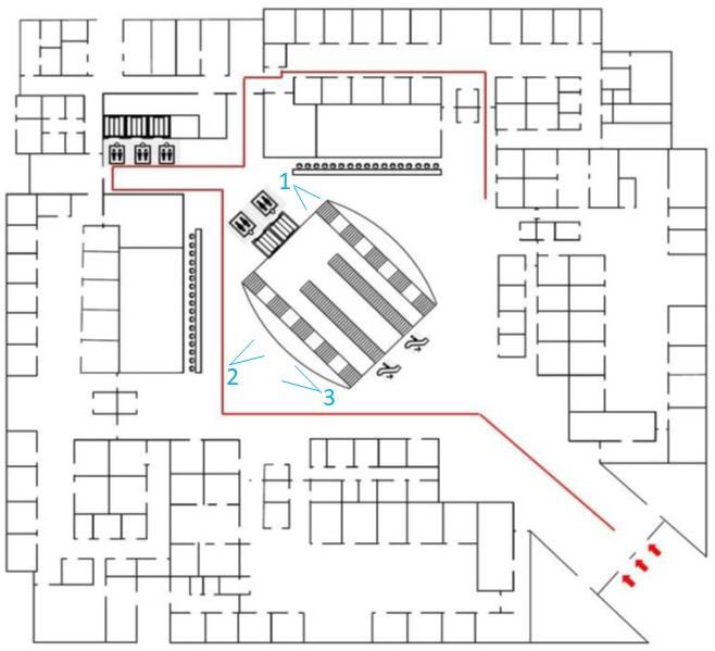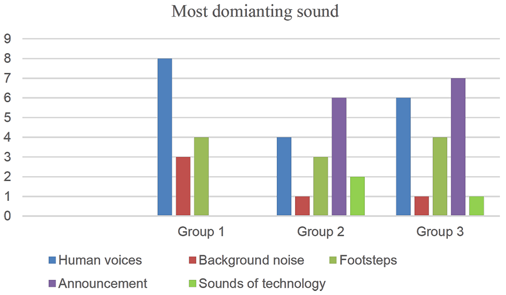 A A A Volume : 44 Part : 2 Proceedings of the Institute of Acoustics The effect of loudness on spatial knowledge acquisition in a virtual outpatient polyclinic Donya Dalirnaghadeh1, Bilkent University, Ankara, Turkey Semiha Yilmazer2, Purdue University & Bilkent University, West Lafayette, USA / Ankara, Turkey ABSTRACT This study aims to find out whether changing the loudness level of sound sources creates soundmarks that aid spatial knowledge in a virtual outpatient polyclinic. Furthermore, it aims to examine the effect of loudness on perceptual attributes of the sound environment. In reference to the crossmodal correspondence of brightness and loudness and the positive perceptions associated with brightness, we explore whether the loudness of a sound source alters the perception of the sound environment. In this study, a virtual simulated outpatient polyclinic has been created with varying additions of a sound with different loudness levels. Twenty-four participants were assigned to one of the three groups: a control group (no change in the sound environment of the polyclinic), a normalized loudness group (addition of an announcement and alarm sound with normalized loudness level to the background), increased loudness (announcement and alarm sound were 3dB louder than the background). The results showed that group 3 was rated as more contented, less annoying, and more energetic and stimulated than the other groups. Additionally, there was a trend towards group 3 performing better than the other groups in spatial knowledge tasks. 1. INTRODUCTION Hearing is more pronounced in healthcare units1 because of a lack of differentiation in repetitive zones and visual cues2,3; thus, the sound environment is vital in healthcare units. Similar to sight, hearing sounds is a long-distance sense that serves to perceive and understand environmental cues that help people orient themselves in a spatial context4,5. The sound environment is among the factors that define building spaces6, but it has rarely been studied regarding its role in spatial knowledge tasks. The traditional wayfinding system relies on environmental cues such as landmarks and signage (spatial cues such as arrows, color coding, and directional texts)7,8. However, this system can be confusing because of the hospitals' complex layouts and the overwhelming number of signs9. Thus, it is essential to look into alternative and cost-efficient methods that help spatial knowledge acquisition. Recent studies suggest that sound has a leading effect on visual elements' noticeability in a way that variations in sound level correspond with changes in visual attention10. Attention is one factor that affects spatial learning 11; thus, adding a sound that attracts users' attention may lead to better spatial knowledge. However, limited studies have looked at the effect of sound on spatial knowledge in hospitals. Thus, in this preliminary study, we aimed to explore whether changing specific characteristics of sound sources in the sound environment would create a more positive soundscape while enhancing spatial knowledge acquisition. This study aims to provide grounds for using the sound environment as a design element to promote spatial knowledge by analyzing the physical and perceptual characteristics of the sound. 2. METHODS 2.1. Virtual environment Recent studies have shown that virtual systems with lower immersion levels, such as desktops, produce comparable results with higher immersion systems in spatial knowledge tasks11. Hence, we simulated the outpatient polyclinic of Bilkent Integrated Health Campus in Ankara to create a virtual environment. This outpatient polyclinic has a large area and complex layout that makes it a suitable choice for study. We used Chief Architect Premier X11 to create a 3D simulation of the space. The scenes were rendered in real-time at a speed of 20 frames per second12. A video of the specified route (recorded in the real environment) was created using the Walkthrough path tool for passive exploration. Similar to previous virtual environments, the route was shown with a plain ceiling with sufficient contrast between the floor and the walls. No light sources were used to avoid directional cues from shadows13. The route was made of uniform and undistinguishable paths and neutral-colored walls, so the walls did not provide wayfinding cues14. Figure 1 presents the schematic plan and the traveled route. 2.2. Participants Twenty-four students from Bilkent University, Turkey, participated in this study. All the participants were familiar with the polyclinic. To prime the participants, we asked them to imagine they were simulated visitors of the outpatient polyclinic in Bilkent Integrated Health Campus. The participants were randomly divided into three experimental groups that varied in the addition of a sound with different loudness levels, with eight people (five women and three men) in each group. Group 1 (control group): No change in the sound environment of the polyclinic. Group 2 (normalized loudness): The sound environment was augmented with an announcement sound that was normalized with the loudness level of the original sound environment. Group 3 (increased loudness): The sound environment was augmented with an announcement sound that is 3 dB louder than the loudness level of the original sound environment. 2.2. Experimental Stimuli To decide which features of the sound environment to augment, data was gathered from the participants in group 1 first. A listening test was conducted by asking the participants to listen to the sound environment of the outpatient polyclinic with headphones, with no visuals. After listening to the sound recording, the participants were asked to answer open-ended questions about the most dominating sounds they heard. They were also asked to indicate their expectations and preferences and which sounds identify an outpatient polyclinic. The intention was to determine whether any soundmarks or