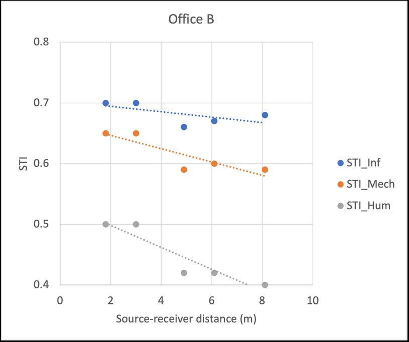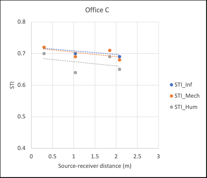 A A A Volume : 44 Part : 2 Assessing human activity noise in workspaces using machine learning and numerical modelsDomenico De Salvio 1 , Giulia Fratoni, Dario D’Orazio, Massimo Garai Department of Industrial Engineering, University of Bologna, Italy Viale del Risorgimento 2, 40136 Bologna, ItalyABSTRACT Acoustic comfort of workspace environments is deeply dependent on the balance between indoor background noises. For example, colleagues’ speaking might a ff ect task performances by downgrading privacy and productivity. Conversely, HVAC noise can reduce the employee’s distraction since such continuous mechanical noise is detrimental to speech comprehension. Therefore, in the analysis of workspaces’ acoustic comfort, di ff erent background noise sources identification becomes essential. In this regard, machine learning techniques are resourceful for clustering sound pressure level patterns among the unlabeled data. A previous work by the authors provided reliable results on separating noise sources via Gaussian Mixture Model and K-means clustering. Nevertheless, such method was applied to a single workspace, and thus it needs further investigation on a wider sample of environments. For this reason, in the present work long-term monitoring was carried out in various active workspaces extending previous results and confirming the procedure’s robustness. Moreover, simulations of the acoustic conditions by summing up the human activity contribution to the mechanical noise allowed obtaining more reliable speech intelligibility criteria at the workstations. Refining the numerical models’ setup through background noise levels obtained through machine learning analysis enhance the assessment of workers’ privacy condition in realistic scenarios.1. INTRODUCTIONThe comfort of workers deeply depends on their exposure to noise. Concerning this, the recent ISO 22955:2021 focuses its recommendations on the measurement of the ambient noise on workstations. The workers’ exposure is function of the activity carried out within the space. Thus, di ff erent types of activities set di ff erent thresholds to comply with [1]. The background noise is a double-edged sword in o ffi ces. It can either increase or decrease the productivity of employees. The problem depends mainly on intelligibility. The more intelligible the signal is, the more a ff ected are workers’ performances [2]. The other way round, continuous noises disrupt the speech signal, improving the ability to focus. Thus, the ability to discern each sound source within a space becomes very important. Previous work has proposed two procedures to identify the human from the mechanical noise through sound level meter long-term monitoring [3]. Both methods exploit two machine learning algorithms:1 domenico.desalvio2@unibo.ita slaty. inter.noise 21-24 AUGUST SCOTTISH EVENT CAMPUS O ¥, ? GLASGOW Gaussian Mixture Model and K-means clustering. Being based on statistical bases, the chance to use these algorithms is strictly connected to the need for large amounts of data. Hence, the application of the procedures is focused on long-term monitoring. The present work deals with the chance to use two clustering methods and identify di ff erent kinds of noise sources through long-term monitoring. Based on previous study, the analysis is broadened through raytracing simulations to assess the variations of the intelligibility parameters. Moreover, a new parameter arising from Gaussian Mixture Model is introduced to describe the type of activity carried out within the o ffi ces.2. THEORY AND CONTEXTThe ISO 22955:2021 sets target values of noise for the workstations depending on the kind of activity. Values are reported in Table 1.Table 1: Target noise levels at workstations L eq , A for each kind of activity according to ISO 22955.Activity Target values (dBA)Activity mainly focusing on outside of the room communication 55Activity mainly based on collaboration between people at the nearest workstation 52Activity mainly based on a small amount of collaborative work 48Activity can involve receiving public 55In this work, three o ffi ces represent the case studies. The activities carried out within are di ff erent in each of them. Following, a brief description of the spaces is presented:O ffi ce A - Open plan with 8-12 workers. The amount of employees can vary during the day. This is a sales o ffi ce. Hence, the activity is mainly focused on outside of the room communication.O ffi ce B - Open plan with 10-12 workers. The amount of employees can vary during the day. This is a design o ffi ce. Hence, the activity can be more or less collaborative.O ffi ce C - Small o ffi ce with a maximum of 2 workers. The amount of employees can vary during the day. The activity carried out has a small amount of collaborative work.This study was conducted after COVID19. Thus, besides the occupancy’s variations, all o ffi ces were treated with screens 120 cm height.2.1. Gaussian Mixture Model The Gaussian Mixture Model (GMM) is an iterative method to describe random distributions as a sum of Gaussian curves. It is frequently used as an unsupervised technique in machine learning. The assumption is that all data points are generated from a mixture of Gaussian distributions [4]. The Gaussian probability density function f ( x i ) of a set of observations x 1 , ..., x n can be expressed as a sum of k Gaussian densities f k ( x i , µ k , σ 2 k ):K Xk = 1 π k f k ( x i , µ k , σ 2 k ) (1)f ( x i ) ≃ where π k are the mixing proportions [ ? ], non-negative quantities that sum to one; that is,0 ≤ π k ≤ 1 ( k = 1 , . . . , K )and K Xk = 1 π k = 1 .The likelihood function for a mixture model with K univariate Normal components is:e − ( xi − µ k ) 2n YK Xn YK Xk = 1 π k 1 q2 σ 2 k . (2)k = 1 π k f k ( x i ) =L ( x ) =2 πσ 2 ki = 1i = 1In the present work, the GMM implements the Expectation-Maximization algorithm to fit the original distribution [5].2.2. K-