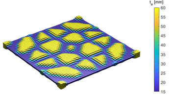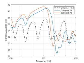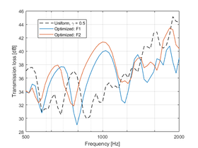 A A A Volume : 44 Part : 2 Topology optimization of single and double panels for improved sound insulation in specific frequency bandsDaniele Giannini 1Department of Civil Engineering - Structural Mechanics Section, KU Leuven Kasteelpark Arenberg 40, 3001 Leuven, BelgiumMattias Schevenels 2Department of Architecture - Architectural Engineering Research Group, KU Leuven Kasteelpark Arenberg 1, 3001 Leuven, BelgiumEdwin Reynders 3Department of Civil Engineering - Structural Mechanics Section, KU Leuven Kasteelpark Arenberg 40, 3001 Leuven, BelgiumABSTRACTIn this work, we investigate the potential of considering a non-uniform material distribution in the design of panel partitions, in order to achieve a superior vibroacoustic performance close to a given target frequency. In order to achieve this goal, we apply numerical topology optimization to find the optimal material thickness distribution for both single and double panels. Two formulations of the optimization problem are employed: in the first one, we suppress the resonance dips in the sound transmission loss by simply pushing the system eigenfrequencies far away from the target frequency. In the second formulation, we directly maximize the sound transmission loss of the system at the target frequency. In the iterative design process, the panels are modelled by mechanical plate finite elements. For double panels, the vibro-acoustic coupling between the panels and the internal air cavity, which is modelled analytically, is accounted for. The sound insulation properties are evaluated by transmission loss computations through hybrid Deterministic-Statistical Energy Analysis (Det-SEA) simulations. The method is applied considering di ff erent target frequencies in the audible range and focusing on practically relevant design cases. For both single PMMA panels and double glazing panels, it is demonstrated how a non-uniform thickness distribution allows for significant transmission loss improvements close to the target frequency, that are in the range of 5-15 dB with respect to uniform panels with the same mass.1 daniele.giannini@kuleuven.be2 mattias.schevenels@kuleuven.be3 edwin.reynders@kuleuven.bea slaty. inter.noise 21-24 AUGUST SCOTTISH EVENT CAMPUS O ¥, ? GLASGOW (a) Single panel layout, where the plate is discretized by finite elements.(b) Double panel layout, where the two plates are discretized by finite elements.Figure 1: Layout of single and double panels.1. INTRODUCTIONSingle and double panels are commonly employed in noise control, e.g., as partitioning elements between rooms and to enclose noisy machines. When focusing on specific frequency ranges, e.g. in presence of narrowband disturbances related for example to rotating machines, further improvements in sound insulation can be obtained by non-uniformly distributing the material within the area of the panels, i.e. considering a varying thickness within the panel area. The suitability of this design approach has been demonstrated for single panels, for which topology optimization [1] has been employed to achieve an e ffi cient design procedure. In [2], the thickness distribution within the panel area has been optimized to achieve a maximum sound Transmission Loss (TL) in specific frequency bands, while employing a hybrid deterministic - statistical energy analysis (Det-SEA) model [3], in which the deterministic (FE) model of the plate is coupled with the sound fields in the source and receiving rooms, modelled as di ff use (SEA) subsystems. Following di ff erent works in topology optimization that focus on eigenfrequencies control to obtain the desired dynamic vibroacoustic performance [4–6], in [7] the thickness distribution in single panels has been optimized to push the structural eigenfrequencies as far as possible from a given disturbance frequency. The optimal layouts were found relying on an in-vacuo mechanical finite element model of a simply supported plate, that allows for a computationally e ffi cient optimization. The sound insulation performance of the optimized layouts were verified a posteriori through Det-SEA simulations, showing the e ff ectiveness of the chosen design strategy in avoiding resonance dips in the TL curve. In this paper, the two di ff erent design strategies presented in [2] and [7] are compared for a selected design case of PMMA single panels, and then extended towards double glazing panels, when considering in the deterministic model of the panel the vibroacoustic coupling between the mechanical plates and the acoustic cavity. The paper is organized as follows. Section 2 describes the vibroacoustic modelling employed for single and double panels. Section 3 introduces the design variables of the topology optimization problem, along with the two proposed formulations of objective and constraints, and the considered solution procedure. The optimized layouts and their vibroacoustic performance are discussed in Section 4, while Section 5 gives some conclusions and remarks.2. VIBROACOUSTIC MODELLING OF THE PANELReferring to Figure 1, the focus of the present work will be both on single panels and on double panels, consisting of two single panels separated by an air cavity. In this Section, the modeling strategy for the di ff erent panel components, and their coupling, will be described: the focus will beESE Sos ———— ee = ee = SS oe = ee ———— oe << on the more general case of a double panel with 3 components (plate-cavity-plate), while the single panel can be treated as a related simplification when only one plate is considered.2.1. Model of the panel components Following what proposed in [8], the out-of-plane displacement fields of the two plates, u 1 ( x , ω ) and u 2 ( x , ω ), and the pressure field within cavity, p cav ( x , ω ), at spatial location x and frequency ω , are approximate using a set of basis functions Φ that correspond to generalized coordinates q :u 1 ( x , ω ) = Φ 1 ( x ) q 1 ( ω ) u 2 ( x , ω ) = Φ 2