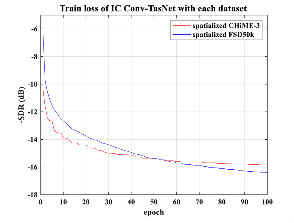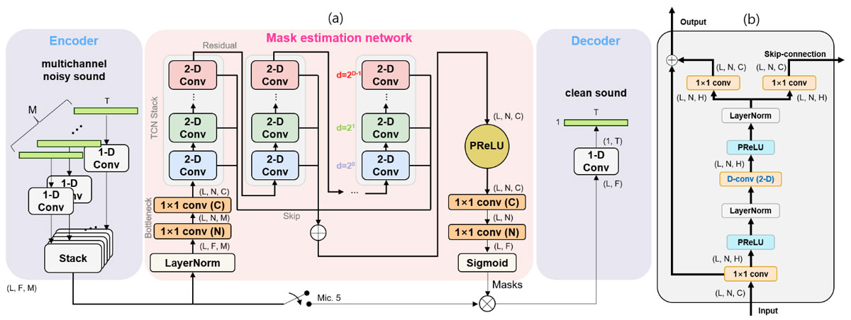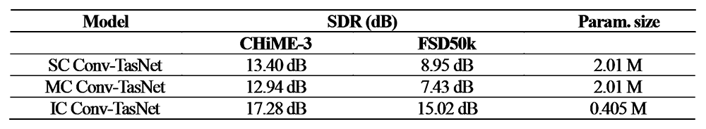 A A A Volume : 44 Part : 2 Proceedings of the Institute of Acoustics Inter-channel Conv-TasNet for source-agnostic multichannel audio enhancement Dongheon Lee1, KAIST, Daejeon, Republic of Korea Jung-Woo Choi2, KAIST, Daejeon, Republic of Korea ABSTRACT Deep neural network (DNN) models for the audio enhancement task have been developed in various ways. Most of them rely on the source-dependent characteristics, such as temporal or spectral characteristics of speeches, to suppress noises embedded in measured signals. Only a few studies have attempted to exploit the spatial information embedded in multichannel data. In this work, we propose a DNN architecture that fully exploits inter-channel relations to realize source-agnostic audio enhancement. The proposed model is based on the fully convolutional time-domain audio separation network (Conv-TasNet) but extended to extract and learn spatial features from multichannel input signals. The use of spatial information is facilitated by separating each convolutional layer into dedicated inter-channel 1x1 Conv blocks and 2D spectro-temporal Conv blocks. The performance of the proposed model is verified through the training and test with heterogeneous datasets including speech and other audio datasets, which demonstrates that the enriched spatial information from the proposed architecture enables versatile audio enhancement in a source-agnostic way. 1. INTRODUCTION Recently, many DNN models for the single-channel speech separation or enhancement task have been proposed [1, 2]. These models learn the characteristics of sound sources to separate them from a single channel mixture of multiple sources. However, if the model is trained for a certain type of sound sources, such as speech, then the model cannot work well for other sources. One possible remedy to this source dependency problem is to use spatial information from multichannel measurements rather than source characteristics. The directional characteristics of a target signal and background noise are different and can be exploited to reduce the noise for the audio enhancement task. The spatial information between sound sources and microphones, or microphones and micro phones, can be utilized in many different ways. Popular choices for binaural signals are interaural phase difference (IPD), interaural time difference (ITD), and interaural level difference (ILD). For multichannel signals, beamforming techniques have been developed to separate or enhance signals in terms of their angles of incidence [3], inter-channel coherence, correlation, and relative transfer functions. However, beamforming techniques require some pre-defined models of acoustic propagation or array manifold, and only linear filtering is possible to separate signals. To exploit spatial in formation, DNN-based multichannel source separation techniques have been developed [4]. The approach proposed in this work also utilizes spatial information from the multichannel input signal to realize source-agnostic audio enhancement. In recent years, deep learning-based audio denoising and enhancement techniques have been extensively studied. The deep learning-based audio enhancement technique aims to generate a clean audio signal by estimating spectrograms [5] or time-domain waveforms [6]. In the spectrogram estimation approach, a DNN model is configured to learn a mapping between input and output spectrograms. Due to its weakness in phase reconstruction, magnitude spectrogram-based approaches have been quickly replaced by complex amplitude-based techniques [7]. However, both approaches use a short-time Fourier transform (STFT) to obtain the spectrogram, which is not optimized for sound enhancement tasks [8]. For this reason, several end-to-end approaches directly utilizing time-domain waveforms as input and output have been proposed [6, 8]. Among end-to-end DNN architectures, Conv-TasNet [9] is a popular one proposed for speech separation tasks, and speech and audio enhancement. Conv-TasNet utilizes a time convolutional network (TCN) [10] composed of depthwise dilated one-dimensional convolutional (1-D Conv) blocks. This can reduce the checkerboard artifact induced by the down- and up-sampling blocks of other architectures like autoencoder and U-Net, which is an important aspect to enhance the quality of enhanced audio signals. Also, its computation time can be reduced by performing parallel convolution. Following the success of Conv-TasNet in the single-channel speech separation task, its extension to multi-channel speech separation tasks was attempted. For example, multichannel Conv-TasNet (MC Conv TasNet) [4] with a multichannel encoder that processes multichannel input data and adds all encoded outputs to single-channel Conv-TasNet (SC Conv-TasNet). However, the spatial information is lost due to the addition of all encoded outputs. Therefore, the multichannel information cannot be fully utilized in the TCN. To accomplish the end-to-end source-agnostic audio enhancement, we use the multichannel architecture, inter-channel Conv-TasNet (IC Conv-TasNet) [11], which was proposed recently for the mul tichannel speech enhancement and still overtakes the performance of existing state-of-the-art models on the CHiME-3 dataset [12]. IC Conv-TasNet enhances speech by extracting many inter-channel features through the combination of point-wise and 2-D dilated convolutions in TCN. In this work, we demonstrate that IC Conv-TasNet can be applied to various source signals and even enhance source signals unseen during the training stage, realizing true source-agnostic audio enhancement independent of source signal types. The rest of this paper consists as follows. In the following section, the structures of SC and IC Conv-TasNet are briefly explained. In the experiment section, the construction of the source-agnostic dataset is discussed. Then we compare train and test results conducted with two datasets (speech target or source-agnostic audio). Fi