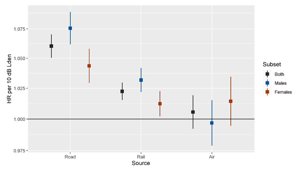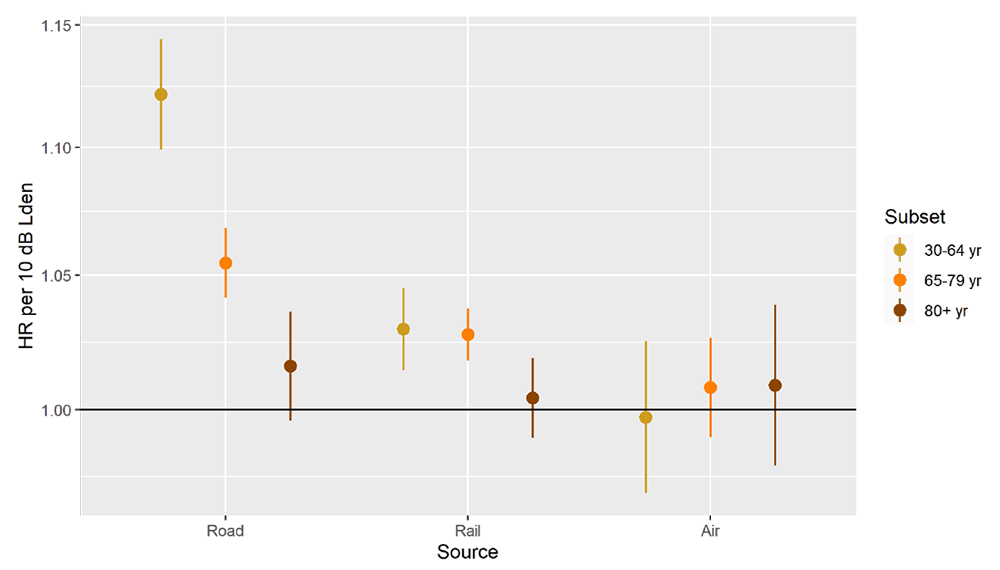 A A A Volume : 44 Part : 2 Proceedings of the Institute of Acoustics Long-term exposure to transportation noise and mortality with diabetes mellitus: a national cohort study Danielle Vienneau1, Swiss Tropical and Public Health Institute & University of Basel, Basel, Switzerland Benedikt Wicki, Swiss Tropical and Public Health Institute & University of Basel, Basel, Switzerland Benjamin Flückiger, Swiss Tropical and Public Health Institute & University of Basel, Basel, Switzerland Beat Schäffer, Empa – Swiss Federal Laboratories for Materials Science and Technology, Dübendorf, Switzerland Jean Marc Wunderli, Empa – Swiss Federal Laboratories for Materials Science and Technology, Dübendorf, Switzerland Martin Röösli2, Swiss Tropical and Public Health Institute & University of Basel, Basel, Switzerland SUMMARY Chronic exposure to transportation noise is related to cardio-metabolic diseases, including diabetes mellitus incidence. In this study, we evaluated the association between source-specific transportation noise and mortality with diabetes mellitus, finding associations with road traffic and railway noise exposure. 1. INTRODUCTION Long-term exposure to transportation noise is related to cardio-metabolic diseases. Previous studies have shown both morbidity and mortality from specific cardiovascular diseases to be associated with these exposures [1-6]. Diabetes mellitus is an important risk factor for cardiovascular disease, but is also a contributing factor for non-cardiovascular morbidity, such as blindness and kidney disease, and mortality [7]. Identified as an important health outcome in the 2018 WHO environmental noise guideline systematic reviews [4, 8], the body of evidence supporting an association between noise and diabetes mellitus incidence is also growing. This study aimed to evaluate the association between road traffic, railway and aircraft noise exposure and mortality with diabetes mellitus in a nation-wide cohort in Switzerland with high quality exposure assessment and 15 years of follow-up. 2. METHODS Over 4.1 million adults in the Swiss National Cohort (SNC) were followed from 2001-2015. Accounting for residential history, source-specific noise calculations were performed for residential locations. Specifically, road traffic, railway and aircraft noise from Swiss-wide models for the years 2001 and 2011 were linked to individuals in the SNC, based on their residential geocode and floor of residence. Noise levels (Lden) at the maximum exposed façade per dwelling were used. The mean exposure in three 5-year periods (2001-2005, 2006-2010, 2011-2015) were calculated, with the residential location updated at the start of each period for movers. ICD10 codes E11-E14 were used to identify mortality with diabetes mellitus, either as the primary definitive cause, concomitant, consecutive or initial disease. Type 1 diabetes (E10) was excluded since its pathophysiology and risk factors are not primarily related to lifestyle factors, and disease onset is typically already in early life. Multipollutant, time-varying Cox regression with age as timescale was applied to determine the mortality risk (hazard ratios, HR, and 95% confidence intervals). Models included each noise source, and were adjusted for individual and area-level covariates plus air pollution (PM2.5 or NO2 from 100 ×100 m European models [9], tested in separate models). HR and 95% confidence intervals were expressed per 10 dB Lden. HRs stratified by sex and age were also derived. 3. RESULTS During follow-up (mean 13.4 years) over 72,000 deaths identified diabetes mellitus on death certificates. Approximately 20% identified diabetes mellitus as the primary cause of death while for 80% diabetes mellitus was a concomitant, consecutive or initial disease. HR in the adjusted model (including PM2.5) were 1.06 (1.05-1.07), 1.02 (1.02-1.03) and 1.01 (0.99- 1.02) per 10 dB Lden road traffic, railway and aircraft noise, respectively. Substituting PM2.5 with NO2 did not change the associations. Associations with road traffic and railway noise were higher in males compared to females (Figure 1), and higher in younger compared to older adults (Figure 2). This pattern tended to be reversed for aircraft noise. Figure 1: Sex-specific hazard ratios for mortality with diabetes mellitus, per 10 dB Lden for each noise source Figure 2: Age-specific hazard ratios for mortality with diabetes mellitus (both sexes combined), per 10 dB Lden for each noise source 4. CONCLUSIONS Using death certificates alone for outcome definition is likely to result missing diabetes mellitus diagnosis for some individuals. However, such misclassification is unlikely to be differential on noise exposure, and would lead to underestimation of the risk rather than produce spurious results. Thus, this study provides new evidence that mortality in persons with diabetes mellitus is associated with exposure to road traffic and railway noise. Interestingly the pattern of risk is similar to that for cardiovascular disease mortality, with the strongest effects seen for road traffic followed by railway noise [10]. This is also the first study on diabetes mellitus clearly demonstrating a link with railway noise exposure. 5. ACKNOWLEDGEMENTS We thank the Federal Statistical Office (FSO) for providing mortality and census data and for the support that made the Swiss National Cohort and this study possible. This work was supported by the Swiss National Science Foundation (grant nos. 3347CO-108806, 33CS30_134273 and 33CS30_148415). The members of the Swiss National Cohort Scientific Board are Marcel Zwahlen (University of Berne), Matthias Egger (University of Berne), Viktor von Wyl (University of Zurich), Oliver Hämmig (University of Zurich), Murielle Bochud (University of Lausanne), Martin Röösli (University of Basel) and Markus Schwyn (Federal Statistical Office). This work was additionally supported by the Swiss National Science Foundation grant no. 324730B_20127