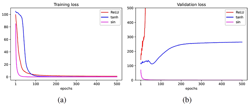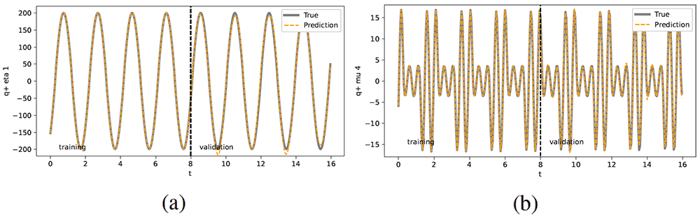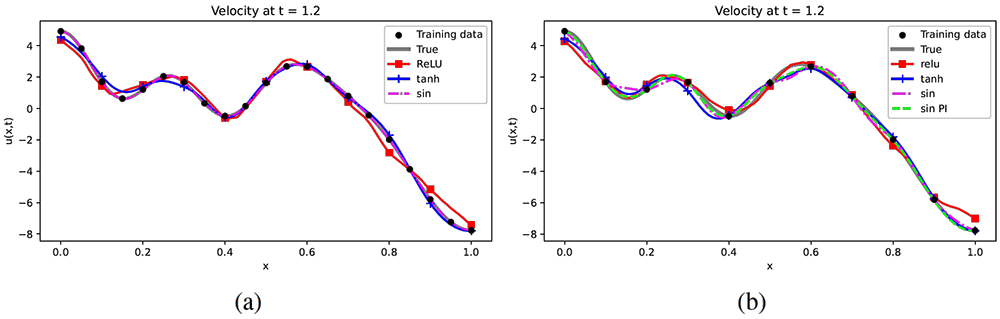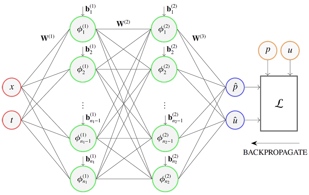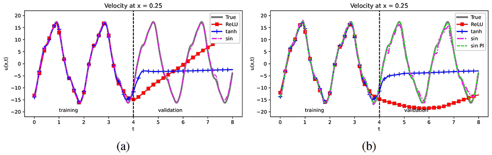 A A A Volume : 44 Part : 2 Proceedings of the Institute of Acoustics Physics-aware learning of nonlinear limit cycles and adjoint limit cycles Defne Ege Ozan1, Imperial College London, London, UK Luca Magri2, Imperial College London & The Alan Turing Institute, London, UK ABSTRACT Thermoacoustic oscillations occur when the heat released by a flame is sufficiently in phase with the acoustic pressure. Under this condition, the linear instability can saturate to a nonlinear self-excited oscillation with a large amplitude. A typical nonlinear regime is a limit cycle, which is characterised by a periodic orbit in the thermoacoustic phase space. In this paper, we develop a physics-aware data-driven method to predict periodic solutions using forward neural networks. The physics is constrained in two ways. First, the training is informed by a physical residual, which penalises solutions that violate the conservation of mass, momentum, and energy. Second, periodicity is imposed by introducing periodic activation functions in the neural network. We test the algorithm on synthetic data generated from a nonlinear time-delayed model of a Rijke tube. We extend our study to learning the adjoint variables of the Rijke system. Adjoint methods offer a cheap and easy way to calculate the gradients with respect to design parameters, We find that (i) periodic solutions of thermoacoustic systems can be accurately learned with this method, (ii) for periodic data, periodic activations outperform conventional activations in terms of extrapolation capability beyond the training range, and (iii) exploiting the physical constraints, fewer data is sufficient to achieve a good performance. This work opens up possibilities for the prediction of nonlinear thermoacoustics by combining physical knowledge and data. 1. INTRODUCTION During combustion processes, the unsteady heat release can couple with sound waves to cause self sustained oscillations to arise. These oscillations, known as thermoacoustic oscillations, are undesired because they can be damaging to the system’s structure [1–3]. Therefore, much research is aimed at suppressing these oscillations [4]. In this context, it is paramount to obtain accurate models of the nonlinear dynamics of thermoacoustic systems. These dynamics are described by partial differential equations, which are time-delayed, nonlinear, and hence time-consuming to solve. Data-driven methods have emerged as computationally cheaper alternatives to the traditional direct numerical simulation methods [5]. In machine learning, data-driven models are often considered to be black box models. However, when modelling applications in thermoacoustics are concerned, there is a vast knowledge of domain-specific physics that can still be leveraged. Physics-aware data-driven methods bridge the gap between the two approaches. By incorporating physical information, data driven models are designed to provide solutions that are compatible with conservation laws [6]. A typical nonlinear regime of thermoacoustic dynamics is a limit cycle [7], which is characterised by a periodic orbit in the phase space [8]. In this work, physics-aware forward neural networks are developed to learn periodic solutions of thermoacoustics. To augment the data-driven learning, we impose the thermoacoustic physics in two ways. First, during training, the networks are informed by a physics residual, which is computed by evaluating the system equations. Solutions that violate the conservation of mass, momentum, and energy are penalised. In other fluids communities, this approach is also known as physics-informed neural networks [9]. Second, we constrain the periodicity of the dynamics. Conventional forward neural networks are in general employed for interpolating data points, but fail to extrapolate periodic functions beyond the training range [10]. We circumvent this problem by implementing periodic functions as nonlinear activations in the network structure [10]. The paper is structured as follows: Section 2 provides the physical model of the Rijke tube. Its adjoint system is derived in Section 3. Section 4 presents the proposed physics-aware data-driven method to learn periodic solutions of thermoacoustics. Section 5 applies the method on synthetic data from the Rijke tube and its adjoint, in which extrapolation capability and robustness are discussed. Conclusions and future directions end the paper. 2. PHYSICAL MODEL We consider a prototypical thermoacoustic system known as the Rijke tube, which consists of a duct with a heat source located inside. The Rijke tube is a typical setup used to study fundamental principles of thermoacoustic instabilities because it is a simple system which captures the qualitative nonlinear dynamics and bifurcations observed in real-life applications [11–13]. The governing equations are derived from mass, momentum and energy conservation. The dynamics are governed by where u and p are the non-dimensionalised velocity and pressure deviations from the mean flow, ζ is the modal damping, is the heat release rate, and δ(x−xf) is the Dirac delta at the heat source location xf [12]. The spatial coordinate x is non-dimensionalised by the tube length such that x ∈ [0, 1]. For the purpose of this study, we consider a heat law given by a sigmoid function as where β is the heat strength, and 𝜏 denotes the time delay between the heat release and the velocity. A similar heat-release law was employed by [14] for the reduced-order modelling of thermoacoustic instabilities. The boundary conditions are fully reflective, p(x = 0) = p(x = 1) = 0. The solution is expressed by a Galerkin decomposition [15] on Ng acoustic eigenfunctions [11–13]: where jπ are the non-dimensional angular frequencies of the purely acoustic modes. By substituting pressure and velocity variables in Equation 1 with their Galerkin decompositions in Equation 3 and projecting the dynamics onto the Galerkin modes, the dynamics of th
