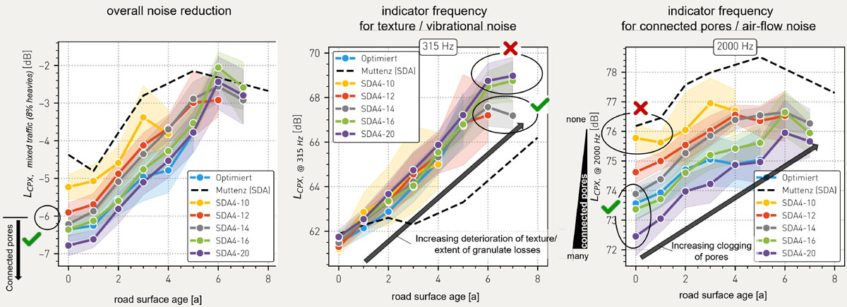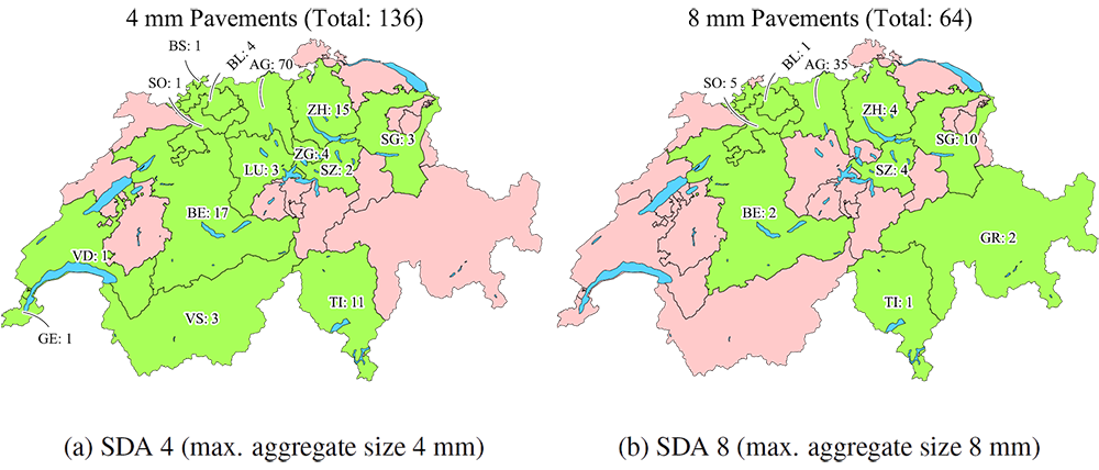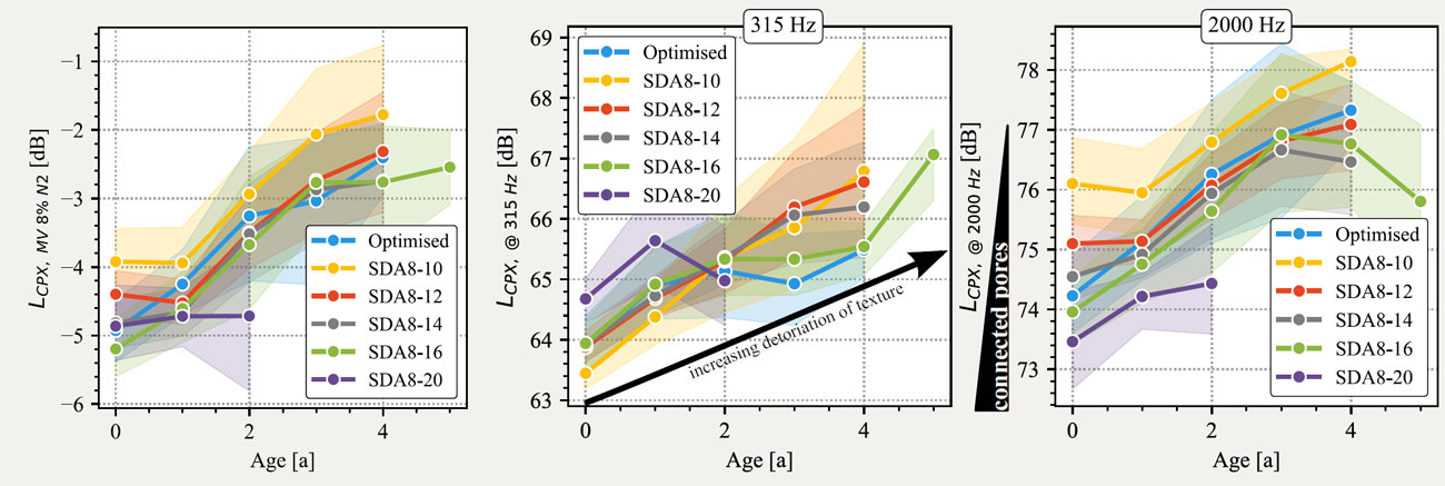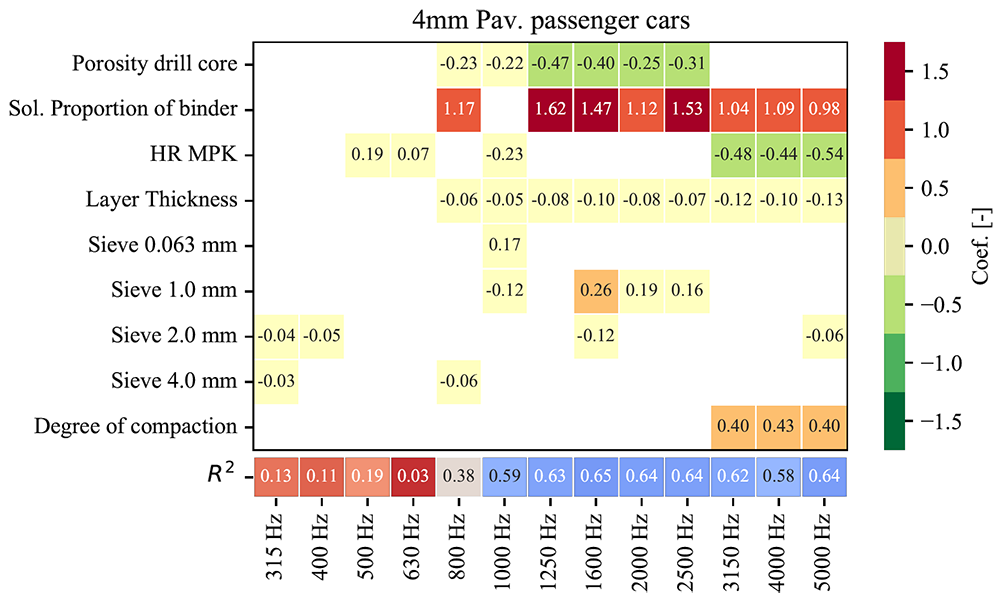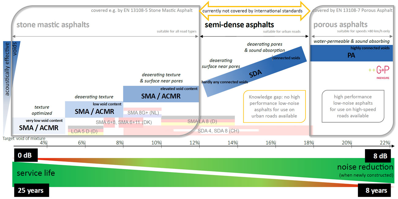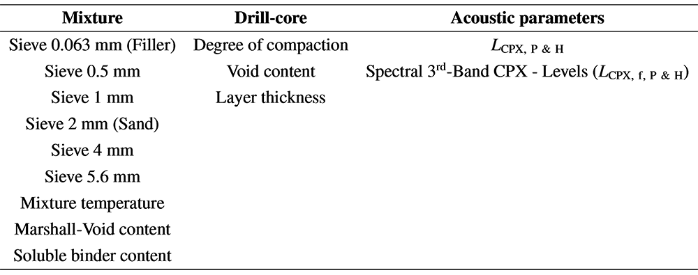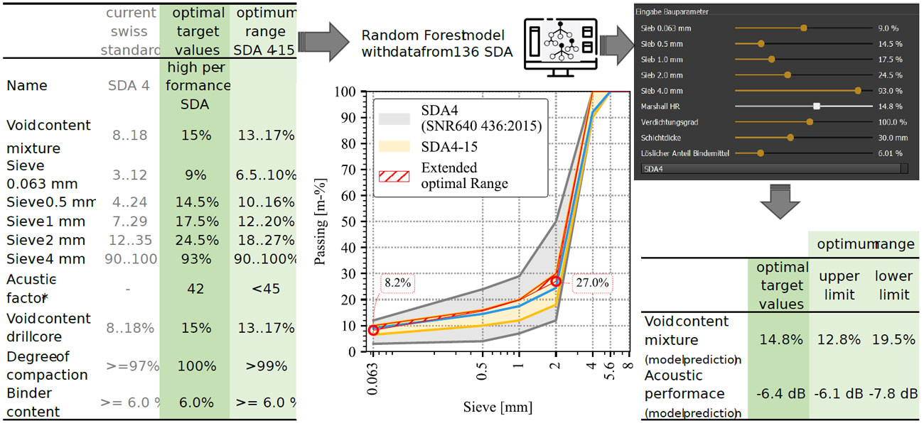 A A A Volume : 44 Part : 2 Proceedings of the Institute of Acoustics Recommendations for the successful design of high performance urban low-noise asphalts – findings from the statistics of 200 mixtures Erik Bühlmann1, Grolimund + Partner AG, Bern, Switzerland Felix Schlatter2, Grolimund + Partner AG, Bern, Switzerland ABSTRACT In many countries, porous asphalts (PA) have become an established measure to reduce road traffic noise on high-speed roads. For urban roads, however, the design of effective low-noise asphalt mixtures remains a challenge, as a pore structure is needed that does not clog at lower speeds. Frequently found solutions are fine textured asphalts in the medium void content range with small pores. The challenge in this particular range is to define mixtures that guarantee a certain acoustic performance. This is exactly where the study comes in: a combined statistical analysis of data from acoustic measurements and laboratory testing of 200 road surfaces is carried out to identify semi-dense asphalt (SDA) mixtures (with a void content between 8-18%) that lead to reliable noise reduction. Multivariate statistical analysis on over 1327 drill core examinations, 775 mixture examinations and 737 acoustic close-proximity (CPX) measurements allowed us to identify the important parameters explaining acoustic performance. With this set of relevant parameters a Random Forest model was developed to determine the optimal target values and parameter ranges as a basis for standardisation. The resulting high performance low-noise SDA mixture is designed to have a noise reduction similar to PA road surface on motorways. 1. INTRODUCTION Porous asphalts (PA) are used successfully in many countries for noise protection on the high-speed road network [1, 2]. The problem with PA, however, is that they are not suitable for use in cities. With lower speeds (<80 km/h), self-cleaning cannot take place and the PA road surfaces become rapidly clogged and lose their noise-reducing effect [3, 4, 5]. Frequently found solutions for lower speed roads are fine textured asphalts in the medium void content range with small pores so that water and dirt cannot easily enter the surface. Several countries have therefore developed semi dense asphalts (SDA) with smaller aggregate sizes for use on urban roads where the number of people exposed to noise is particularly high. The advantage of fine-textured SDA is that their pore structure does not clog as easily at lower speeds. For an improved durability, they have a lower void content than PA (often between 8 and 18%). The challenge in this particular void content range is to define mixtures that guarantee a certain effect mechanism and acoustic performance [6]. Similar to the Swiss experience [7], unfortunately the acoustic measurements on the different SDA technologies used in countries such as NL (SMA 8 G+), D (SMA LA 8, LOA 5 D), DK (SMA 6+8, SMA 6+11) show that they currently do not reliably achieve the noise-reducing effect of PA. This was the result of our international review of the practice of low-noise road surfaces based on data from expert interviews[2]. Hence, detailed knowledge on the relevant performance parameters for successful mixture design of acoustically effective low-noise SDA is urgently needed in order to provide a reliable low-noise asphalt technology for the use on urban roads. This gain in knowledge is furthermore transferable to similar SDA technologies used in other countries. The present study aims to fill this gap. We intend to learn from the statistics of 200 well documented SDA constructed on urban roads in Switzerland how to design an optimal SDA mixture that guarantees a noise reduction similar to PA on motorways. To this end, an extensive dataset of 1327 drill cores analyses, 775 mixture analyses and 737 acoustic close-proximity (CPX) measurements (ISO 11819-2 [8] and ISO/TS 11819-3 [9]) was analysed. In step 1, the success factors for long-term noise reduction are identified in order to derive the optimisation objectives for SDA mixtures. In step 2, the mixture and construction parameters that have a significant influence on the acoustic performance are determined using multivariate statistics. In step 3, the acoustically optimal parameter ranges for mixture design and construction are further investigated studying their bivariate behaviour with acoustics and based on a Random Forest model developed for this purpose. With these optimal parameter ranges set, we provide as a main outcome the statistically optimal target mixture for a high performance low-noise SDA suitable for application on urban roads. 1.1. Definition of semi-dense asphalts (SDA) Before the analyses are presented, we would like to define more precisely what is meant by low-noise semi-dense asphalts. For this purpose, it is helpful to position SDA in relation to the established asphalt standards for conventional dense asphalts on the one hand and PA on the other. From SDA we should be able to expect a comparable noise reduction as for PA on high-speed roads in order to be a suitable technology for noise abatement on urban roads. This requires an appropriate mixture design that guarantees acoustically effective pores connected to the surface. From our existing research on SDA we know that probably as much as half of the mixtures within the SDA category do not have connected pores and therefore do not bring the required noise reduction [6, 10]. Accordingly, high performance low-noise SDAs do likely not extend over the entire void content range between SMA and PA and, therefore, this range needs to be further narrowed down based on scientific insight. 1.2. Problem statement Currently, to our knowledge, there are no standards for SDA mixtures available that guarantee connected pores and the required noise reduction. More knowledge needs to be gained on the optimal design of SDA mixtures that guarantee acoustic performance. To facilitate the transfer of knowledge