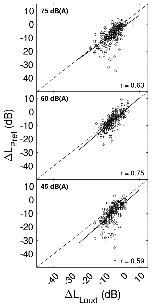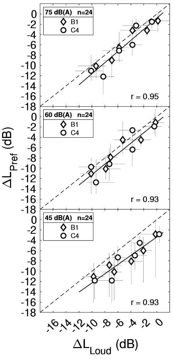 A A A Volume : 44 Part : 2 Proceedings of the Institute of Acoustics Relationships between loudness and preference judgments for fan sounds as a function of the reference sound pressure level Eike Claaßen1, Carl von Ossietzky University Oldenburg, Oldenburg, Germany Stephan Töpken, Carl von Ossietzky University Oldenburg, Oldenburg, Germany Steven van de Par, Carl von Ossietzky University Oldenburg, Oldenburg, Germany ABSTRACT In a prior study, the level of fan test sounds was adjusted in a listening test using an adaptive procedure, until they became equally loud or equally preferred as a reference sound at a fixed level. Depending on the test sound, level reductions of up to 15 dB compared to the 60 dB(A) reference level were necessary to reach equal loudness or preference compared to the reference sound. It turned out that the preference-equivalent levels were highly correlated with the loudness-equivalent levels, indicating that the preference decision and the loudness judgment were closely related to each other. In a follow-up study, the measurements were extended towards a higher reference level of 75 dB(A) and a lower reference level of 45 dB(A). The preference-equivalent levels obtained at 75 dB(A) were again closely related to the loudness-equivalent levels. For the lower reference level of 45 dB(A), the preference-equivalent levels deviate from the loudness equivalent levels by 3.5 dB on average and also the inter-individual variability increased. This result suggests an increasing effect of additional fan-noise characteristics to play a role for the preference decisions on top of the perceived loudness especially at low absolute sound pressure levels. 1. INTRODUCTION Fans are a common noise source in people’s everyday life because they are necessary in many technical applications and systems. To acoustically quantify fan noise, the A-weighted sound pressure level is an established measure, which is also part of standards and regulations. With respect to the pleasantness or annoyance of fan noise, the A-weighted sound pressure level is often limited and psychoacoustic parameters can be beneficial to characterize and predict the evaluation of fan sounds [1], [2]. In order to enhance the A-weighted sound pressure level to better reflect the annoyance and effects of sounds, level adjustments (penalties) can be a useful extension [3], [4], [5]. For a better characterization of the effects of noise, rating levels including level adjustments are also used in some international standards, e.g. ISO1996 [6]. Level adjustments are also proposed for tonal components in noise by the German DIN45681 [7]. In previous studies loudness- and preference-judgments of fan sounds were determined in listening tests [5], [8]. In two experiments, loudness- and preference equivalent levels were measured using an adaptive procedure in which the level of a test stimulus is adjusted until it is equally loud or equally preferred as a fixed reference stimuli. The resulting level differences between the test- and the reference sound at the point of subjective equality (PSE) can be interpreted as a level penalty or level adjustment. The results of the previous study showed strong similarities of loudness- and preference-judgments at reference levels of 60 and 75 dB(A) [8]. Recent listening tests carried out by the authors at a lower reference of 45 dB(A) showed that the preference judgments differ from the loudness judgments considerable.Therefore, this paper shows the relationship of relative loudness- and preference-judgements measured for reference levels of 75, 60 and 45 dB(A) in more detail. 2. METHOD The method in the present study is closely related to that of the prior study [5] but with a reduced set of sounds compared to the prior study. 2.1. Participants Twenty-four participants (12 female, 12 male) with a mean age of 24 years (ranging from 20 to 30) for the reference level of 75 dB(A) and a mean age of 25.1 ranging from 20 to 35) for the reference level of 45 dB(A) volunteered to participate in this study. The data at a reference level of 60 dB(A) is based on a randomly drawn sample of 24 participants (12 female, 12 male) from a previous study [5]. The mean age of the sample was 23.4 years (ranging from 20 to 29). The participants were mainly students from the University of Oldenburg and stated that they do not suffers from any kind of hearing impairment. The participants were compensated with 50 € (10 € per hour). Ethic approval was granted by the committee for research impact assessment and ethics of the University of Oldenburg (ethics application Drs EK/2020/007). 2.2. Procedure The loudness-equivalent levels were determined using an adaptive procedure. In each trial, pairs of sounds consisting of a test sound and a common reference sound were presented in random order. Participants had to decide which sound is perceived louder. Based on the subject’s response, the level of the test signal was varied using an adaptive method while the level of the reference sound remained fixed. The adaptive measurements were realized as using a 2-Interval, 2-Alternative Forced Choice (AFC) method changing the level of the test signal with a on a one-up, one-down rule, which converges at the PSE. At the start of each adaptive track, the level of the test sound was the same as the respective reference sound level. The initial step size of the level change for the loudness experiment was 3 dB. After the second upper reversal the step size was reduced to 1.5 dB. The measurement phase consisted of four reversals with a step size of 1.5 dB for each adaptive track. The PSE was always calculated as the mean value over the last four reversal points of the adaptive track. The procedure for the determination of the preference-equivalent levels (Preference-Task) was essentially the same as in the loudness experiments. The level of the test sound was reduced when the reference was preferred and it was increased w