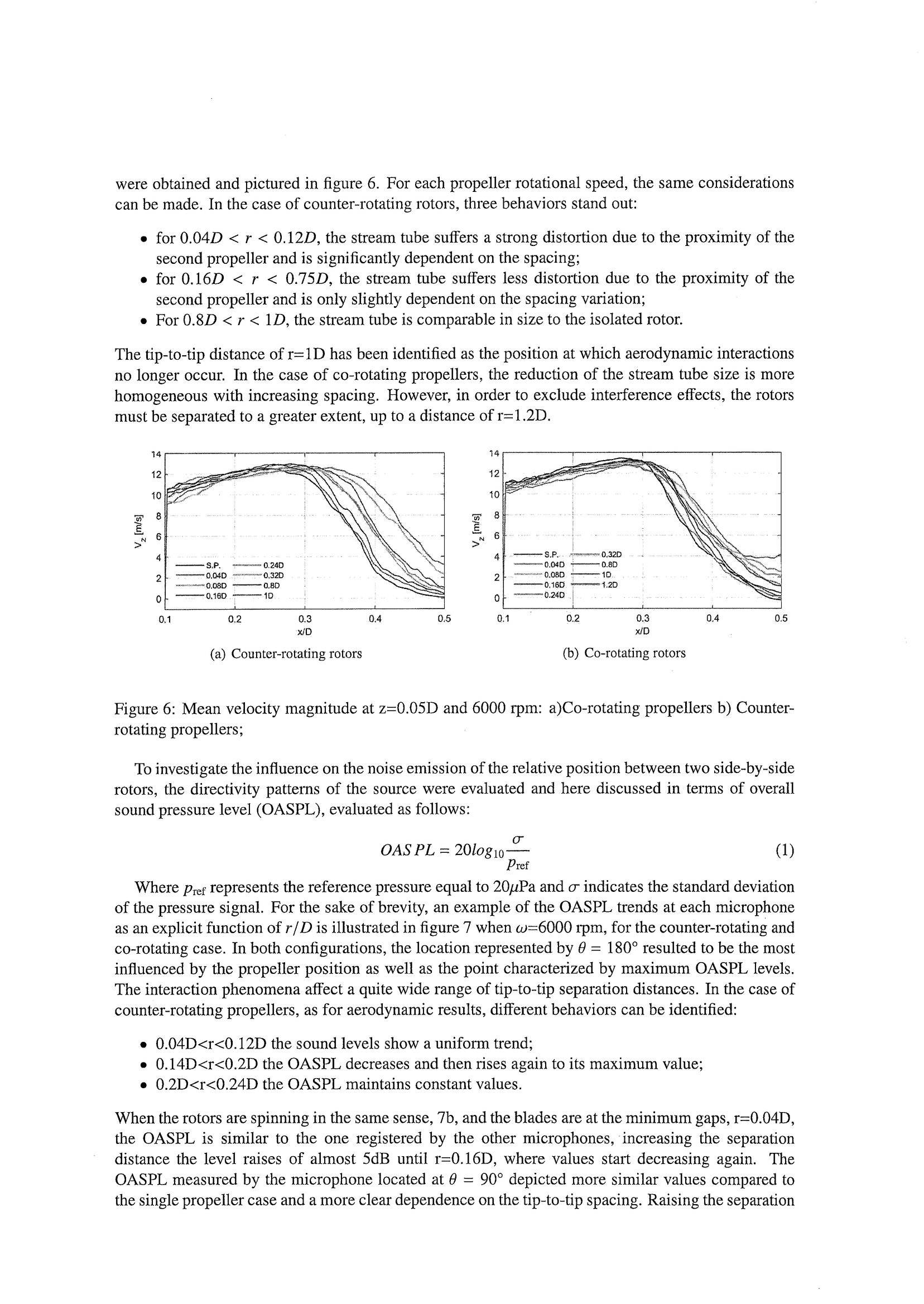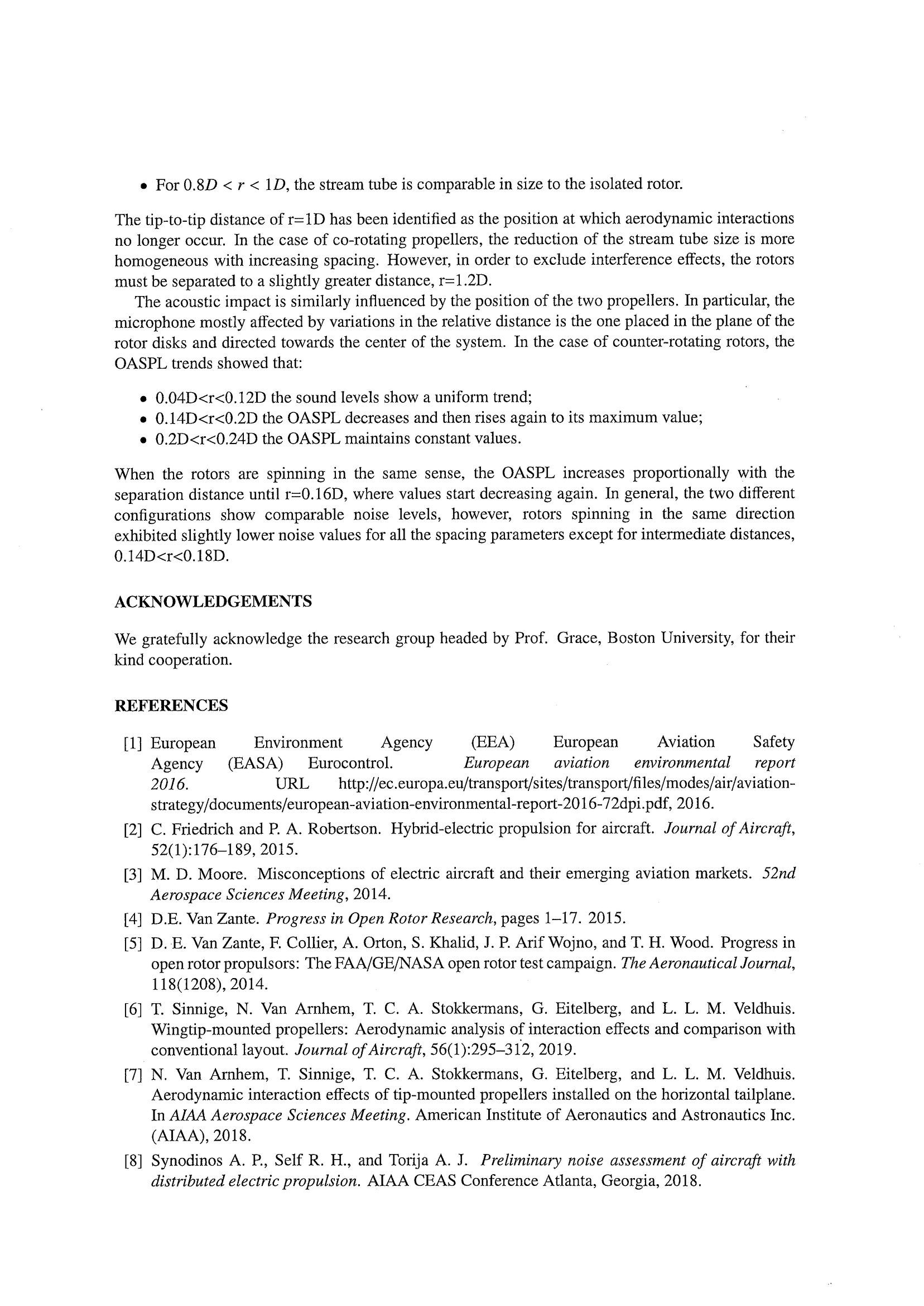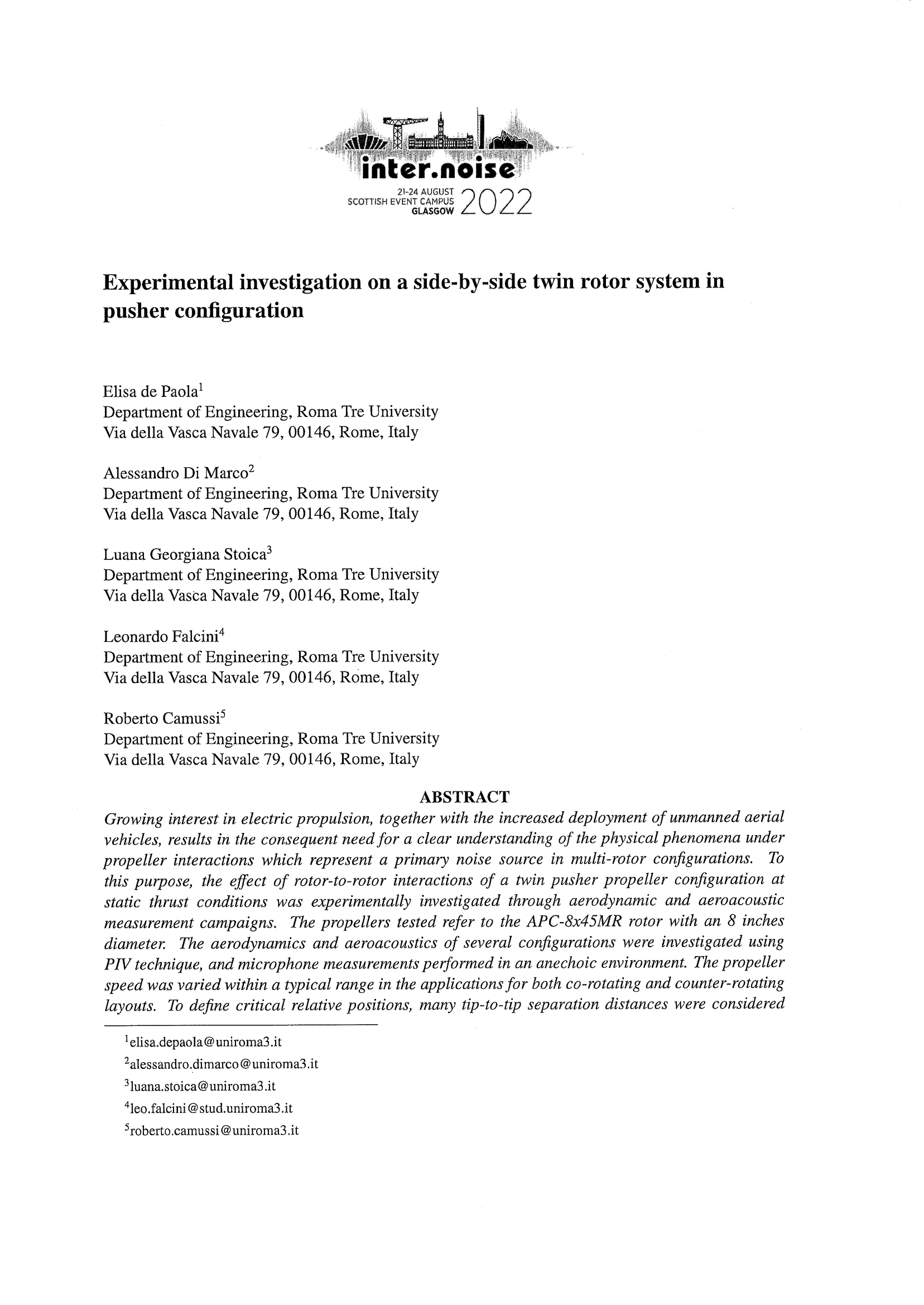 A A A Volume : 44 Part : 2 ‘inter.noise 21-24 AUGUST SCOTTISH EVENT CAMPUS ? O ? ? GLASGOW Experimental investigation on a side-by-side twin rotor system in pusher configuration Elisa de Paola! Department of Engineering, Roma Tre University Via della Vasca Navale 79, 00146, Rome, Italy Alessandro Di Marco? Department of Engineering, Roma Tre University Via della Vasca Navale 79, 00146, Rome, Italy Luana Georgiana Stoica? Department of Engineering, Roma Tre University Via della Vasca Navale 79, 00146, Rome, Italy Leonardo Falcini* Department of Engineering, Roma Tre University Via della Vasca Navale 79, 00146, Rome, Italy Roberto Camussi> Department of Engineering, Roma Tre University Via della Vasca Navale 79, 00146, Rome, Italy ABSTRACT Growing interest in electric propulsion, together with the increased deployment of unmanned aerial vehicles, results in the consequent need for a clear understanding of the physical phenomena under propeller interactions which represent a primary noise source in multi-rotor configurations. To this purpose, the effect of rotor-to-rotor interactions of a twin pusher propeller configuration at static thrust conditions was experimentally investigated through aerodynamic and aeroacoustic measurement campaigns. The propellers tested refer to the APC-8x45MR rotor with an 8 inches diameter. The aerodynamics and aeroacoustics of several configurations were investigated using PIV technique, and microphone measurements performed in an anechoic environment. The propeller speed was varied within a typical range in the applications for both co-rotating and counter-rotating layouts. To define critical relative positions, many tip-to-tip separation distances were considered lelisa.depaola@uniroma3 it ?alessandro.dimarco @uniroma3 it 3}uana.stoica@uniroma3 it *Jeo.falcini@stud.uniroma3.it Sroberto.camussi @uniroma3 it highlighting the general effects. Owing to the deformation exhibited by the rotor wakes due to their proximity, the pressure and velocity signals are analysed to inspect the driving mechanisms responsible for the noise emission. Results provide an insight into the physics involved and show different types of interaction effects on the fluid-dynamic field as a function of the propeller position, allowing the identification of the main critical configurations. 1. INTRODUCTION In the last decades, the demand for air transportation has dramatically risen and the prevision for the next years shows that the air traffic will double within 2034, [1]. Concerns about the growing impact on the environment revived enthusiasm for propeller technologies since efficient propulsion systems are required to achieve a step-change in the performance of future aircraft designs. In this framework, interest in hybrid-electric [2] and fully-electric [3] propulsion made the investigation of propeller—propeller interactions more relevant. In terms of multi-propellers, propeller-blade, and propeller-airframe interactions, the noise problem has been addressed by extensive research principally focusing on CRORs, [4,5], together with the problem of the integration of an isolated rotor over the airframe, [6,7]. Moreover, there exist several concepts of distributed electric propulsion that can be found in the literature, but most of them are analyzed for their applicability in designing boundary layer injection (BLI) configurations [8,9]. Electric propulsion is expected to modify the classical frequency spectrum of the sound emission, being dominated by the fan noise. According to Rizzi et al. [10], the combination of multiple propellers has the potential to alter the relationships currently used between noise exposure and annoyance, concerning their combined amplitudes and phase modulation. Additionally, the use of systems that are flown without a human pilot aboard, known as UAVs, is nowadays rapidly growing in several industries and public applications with the consequent need for noise reduction methods, in consideration of the fact that propellers interactions are the primary source of noise of contemporary multi-rotor configurations. The noise from UAVs is mainly due to propellers, power sources, and the interaction between them. Spatial configuration plays an important role in the specific noise characteristics, and levels will vary for different arrangements. The electric motor tends to have a high-frequency noise and contributes to the overall sound level, as presented by Huff and Henderson who found that strong motor tones can be amplified by propellers loading from anywhere between 5-15dB, [11,12]. Electrical motors can be a significant noise source at harmonics greater than the Sth blade passage frequency, [13]. However, it is not as significant as the one generated by the propeller, [14,15]. The noise emitted by UAV rotors has been experimentally and numerically investigated in many research studies, focusing on the directivity of the isolated propeller, [14], as well as on the effect of the blade geometry and on the rotor-airframe interactions, [16]. Only a few studies can be found in the literature that examined the rotor-to-rotor interactions effect on the aeroacoustic performance of modern UAVs. Intaratep et al. [15] performed acoustic measurements on a commercial quad-copter analyzing the noise from one, two, and four propellers. The radiated noise from multiple propellers did not follow a linear trend with the number of operational rotors, showing to be affected by the phase angle of each tonal source. The acoustics level at static thrust conditions dramatically increases in broadband noise proportionally with the number of rotors operating. A different approach was followed by Tinney et al., [17], to compare the noise due to isolated rotors, quadcopters, and hexacopters operating at static thrust. Time-frequency analysis of the sound field demonstrates modulations of the pressure levels associated with the first few BPFs. Zhou et al. [18] performed an experimental 