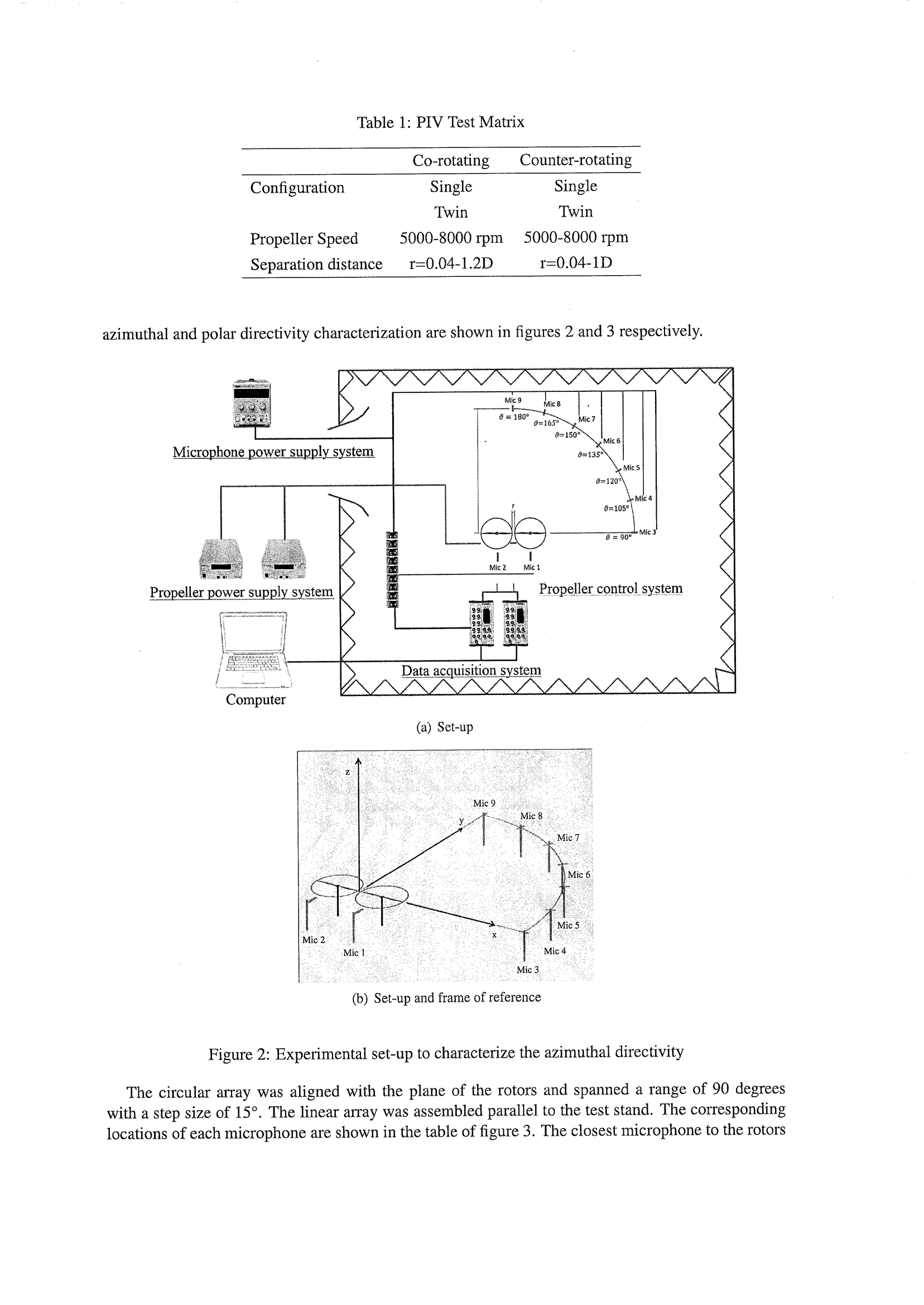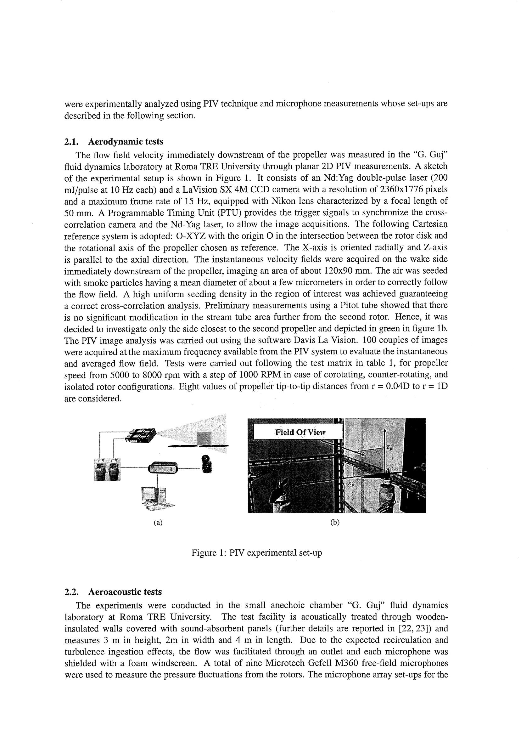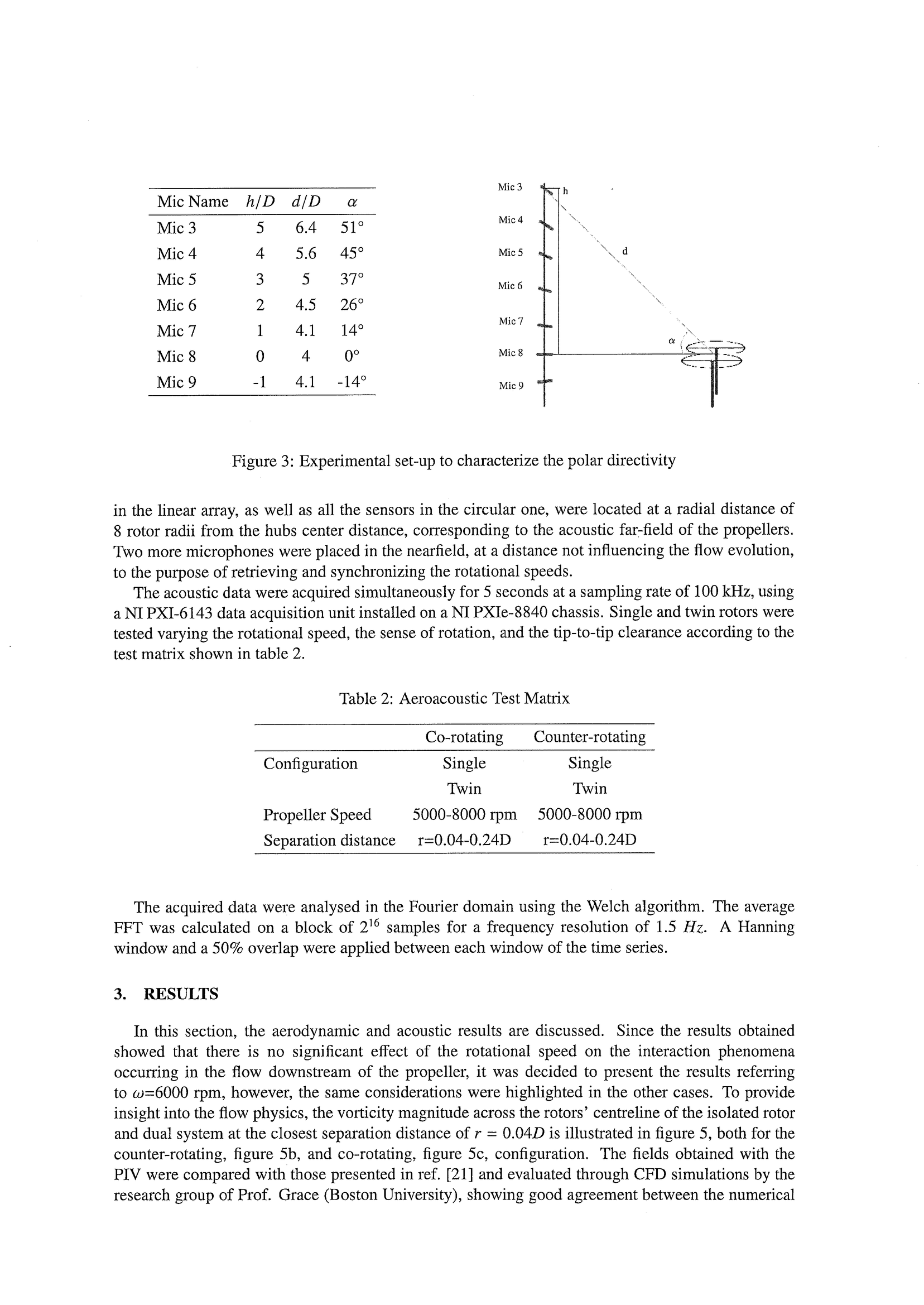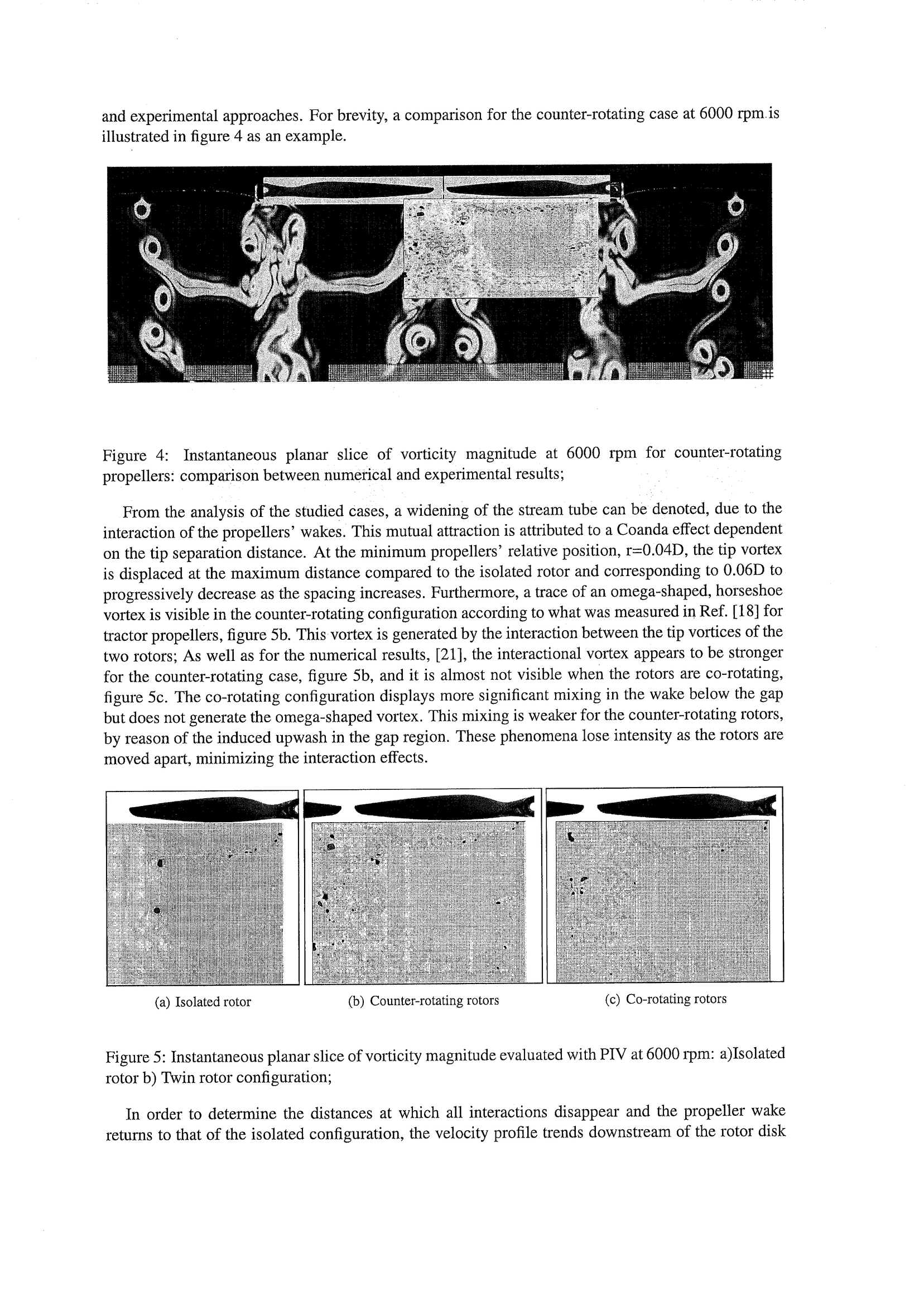 A A A Volume : 44 Part : 2 ‘inter.noise 21-24 AUGUST SCOTTISH EVENT CAMPUS ? O ? ? GLASGOW Experimental investigation on a side-by-side twin rotor system in pusher configuration Elisa de Paola! Department of Engineering, Roma Tre University Via della Vasca Navale 79, 00146, Rome, Italy Alessandro Di Marco? Department of Engineering, Roma Tre University Via della Vasca Navale 79, 00146, Rome, Italy Luana Georgiana Stoica? Department of Engineering, Roma Tre University Via della Vasca Navale 79, 00146, Rome, Italy Leonardo Falcini* Department of Engineering, Roma Tre University Via della Vasca Navale 79, 00146, Rome, Italy Roberto Camussi> Department of Engineering, Roma Tre University Via della Vasca Navale 79, 00146, Rome, Italy ABSTRACT Growing interest in electric propulsion, together with the increased deployment of unmanned aerial vehicles, results in the consequent need for a clear understanding of the physical phenomena under propeller interactions which represent a primary noise source in multi-rotor configurations. To this purpose, the effect of rotor-to-rotor interactions of a twin pusher propeller configuration at static thrust conditions was experimentally investigated through aerodynamic and aeroacoustic measurement campaigns. The propellers tested refer to the APC-8x45MR rotor with an 8 inches diameter. The aerodynamics and aeroacoustics of several configurations were investigated using PIV technique, and microphone measurements performed in an anechoic environment. The propeller speed was varied within a typical range in the applications for both co-rotating and counter-rotating layouts. To define critical relative positions, many tip-to-tip separation distances were considered lelisa.depaola@uniroma3 it ?alessandro.dimarco @uniroma3 it 3}uana.stoica@uniroma3 it *Jeo.falcini@stud.uniroma3.it Sroberto.camussi @uniroma3 it highlighting the general effects. Owing to the deformation exhibited by the rotor wakes due to their proximity, the pressure and velocity signals are analysed to inspect the driving mechanisms responsible for the noise emission. Results provide an insight into the physics involved and show different types of interaction effects on the fluid-dynamic field as a function of the propeller position, allowing the identification of the main critical configurations. 1. INTRODUCTION In the last decades, the demand for air transportation has dramatically risen and the prevision for the next years shows that the air traffic will double within 2034, [1]. Concerns about the growing impact on the environment revived enthusiasm for propeller technologies since efficient propulsion systems are required to achieve a step-change in the performance of future aircraft designs. In this framework, interest in hybrid-electric [2] and fully-electric [3] propulsion made the investigation of propeller—propeller interactions more relevant. In terms of multi-propellers, propeller-blade, and propeller-airframe interactions, the noise problem has been addressed by extensive research principally focusing on CRORs, [4,5], together with the problem of the integration of an isolated rotor over the airframe, [6,7]. Moreover, there exist several concepts of distributed electric propulsion that can be found in the literature, but most of them are analyzed for their applicability in designing boundary layer injection (BLI) configurations [8,9]. Electric propulsion is expected to modify the classical frequency spectrum of the sound emission, being dominated by the fan noise. According to Rizzi et al. [10], the combination of multiple propellers has the potential to alter the relationships currently used between noise exposure and annoyance, concerning their combined amplitudes and phase modulation. Additionally, the use of systems that are flown without a human pilot aboard, known as UAVs, is nowadays rapidly growing in several industries and public applications with the consequent need for noise reduction methods, in consideration of the fact that propellers interactions are the primary source of noise of contemporary multi-rotor configurations. The noise from UAVs is mainly due to propellers, power sources, and the interaction between them. Spatial configuration plays an important role in the specific noise characteristics, and levels will vary for different arrangements. The electric motor tends to have a high-frequency noise and contributes to the overall sound level, as presented by Huff and Henderson who found that strong motor tones can be amplified by propellers loading from anywhere between 5-15dB, [11,12]. Electrical motors can be a significant noise source at harmonics greater than the Sth blade passage frequency, [13]. However, it is not as significant as the one generated by the propeller, [14,15]. The noise emitted by UAV rotors has been experimentally and numerically investigated in many research studies, focusing on the directivity of the isolated propeller, [14], as well as on the effect of the blade geometry and on the rotor-airframe interactions, [16]. Only a few studies can be found in the literature that examined the rotor-to-rotor interactions effect on the aeroacoustic performance of modern UAVs. Intaratep et al. [15] performed acoustic measurements on a commercial quad-copter analyzing the noise from one, two, and four propellers. The radiated noise from multiple propellers did not follow a linear trend with the number of operational rotors, showing to be affected by the phase angle of each tonal source. The acoustics level at static thrust conditions dramatically increases in broadband noise proportionally with the number of rotors operating. A different approach was followed by Tinney et al., [17], to compare the noise due to isolated rotors, quadcopters, and hexacopters operating at static thrust. Time-frequency analysis of the sound field demonstrates modulations of the pressure levels associated with the first few BPFs. Zhou et al. [18] performed an experimental 
