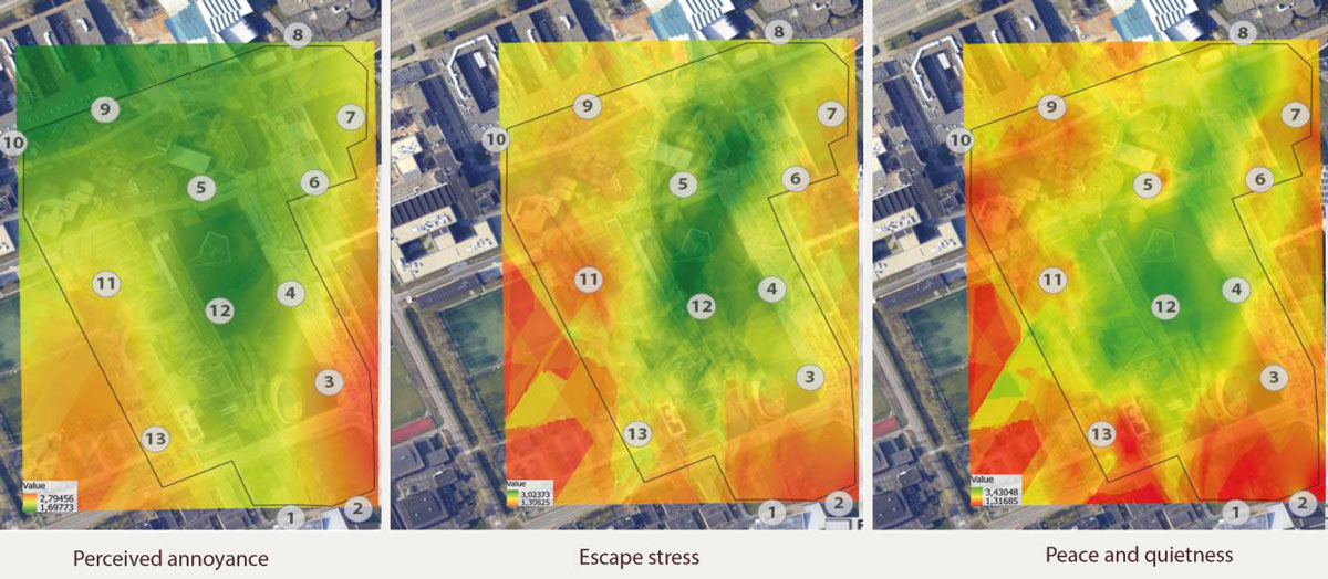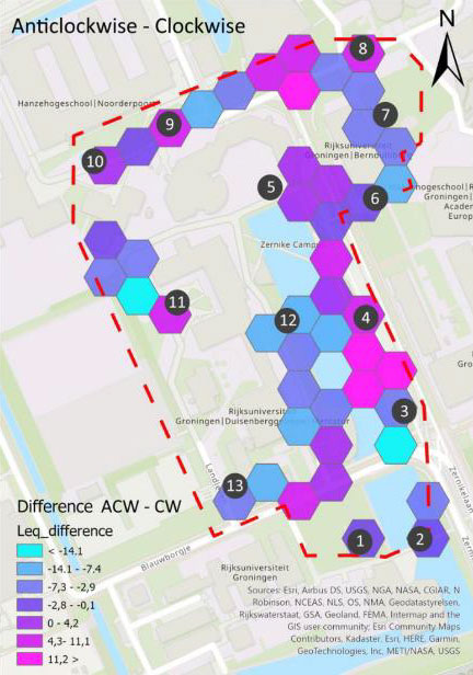 A A A Volume : 44 Part : 2 Proceedings of the Institute of Acoustics Combining mobile measurements of noise and soundscape evaluation in a university campus after a renovation plan Efstathios Margaritis1, University of Groningen, Groningen, The Netherlands Ferry van Kann2, University of Groningen, Groningen, The Netherlands ABSTRACT This paper contributes on the popular topic of smartphone-based noise mapping and in general participatory sensing. It has a dual aim as on one hand it provides a methodological framework on the spatio-temporal variability of noise and soundscape and in parallel it investigates the role of green space and water features on soundscape preference with respect to certain activities. The study was organised in Zernike University Campus in Groningen, Netherlands around 13 predefined locations, equipped with seating facilities. A big part of the study area was recently redesigned as part of the Zernike promenade. Students, enrolled in the course of Environment and Engineering, used the ArcGIS 123 Survey and the NoiseCapture mobile applications for soundscape and noise data collection respectively. Statistical analysis and GIS tools were used to investigate the noise and soundscape variability in different time periods from morning to evening. Additionally, the effect of green space and water features on soundscape quality and users’ preference is identified exploring the links with activities related to socializing and relaxing. The contribution of the above-mentioned technologies in participatory planning and urban design interventions is discussed parallel to the educational benefit of these tools in the achievement of the course learning objectives. 1. INTRODUCTION Over the years the topic of soundscape has gained more and more attention in multidisciplinary fields expanding from the traditional area of acoustic ecology [1]. Despite the technological progress with new approaches integrating VR, deep learning or image analysis techniques, it still remains a challenge to integrate the theoretical and analytical tools presented through the soundscape ISO series (12913-a,b,c) in the planning process. This should not undermine the fact that certain progress has been made in the field of participatory planning using mobile apps to assess the acoustic and visual environment (e.g Hush City [2], Noisetube [3]). It is also true that previous studies assessing the soundscape in a University campus did not always consider the landscape composition (e.g presence of green and blue elements), mainly emphasising on the socio-acoustic perspective [4] or a perceptual investigation restricted on the correlation between physical and psychoacoustic parameters [5]. It is very promising however that recent studies have indeed confirmed that a proper built environment in a University Campus can trigger creative encounters in public spaces [6]. Having this in mind, the current research also focuses on the public space of a University Campus. It contributes in the field of participatory sensing and VGI [7] with an aim to describe a robust methodology for noise and soundscape analysis using a smartphone-based data collection protocol [8] and innovative visualization techniques. The applied practices build on the ongoing discussion in three interlinked directions as presented below: Diversification of participatory tools and methods that are applicable in soundscape analysis and design. Soundscape and new technologies as a pedagogical tool in Higher Education combined with the corresponding learning objectives. Soundscape assessment as a dynamic diagnostic tool able to be incorporated in sustainable urban design. 2. METHODS 2.1. Study area and measurement point selection Zernike Campus is located at the north-west part of the city of Groningen and is the country’s fastest growing campus with 198 companies and start-ups in 2018 and the majority of 34,000 students studying in the University of Groningen. The closest highway (N370) runs 150m away from the southern border of the case study area with a dense vegetation in between. The Campus has undergone a big regeneration project (Upgrade Zernikelaan) - finalized in October 2021 - with an aim to make it more accessible and attractive for its users. For this research, the most significant locations are part of the new Zernike Promenade, a wide park along the Duisenberg pond with more than 200 trees, a bike and a footpath forming a connection of almost 1600 meters along the Campus. Coupled with the adjustment communal areas it provides an ideal recreational space with varied functions that is worthwhile to be investigated from an acoustic perspective concerning its efficiency and public acceptance. An overview of the Duisenberg pond is shown in Figure 1. Figure x1: Perspective of the area around Duisenberg pond before and after the renovation project (Zernike promenade). The entire acoustic project run as part of the 3rd year course of Environment and Engineering, where students are called to familiarize themselves with the physics of sound propagation and aspects related to soundscape theory and assessment. The sample locations for analysis were selected taking into account the Zernike promenade and contextual factors of dominant use and visibility as presented by [9] in the SSID Protocol. The criterion of dominant use corresponds to the available so called “passive zones” in the Campus, which aim at promoting activities such as sitting, resting and socializing. Meanwhile, visibility in this study refers both to blue and green spaces in an attempt to account for the visual stimuli. In total 13 measurement locations as shown in Figure 2 (right) were selected with one of them acting more as a reference point valuable mainly in the stage of spatial analysis. Figure 2: Study area (left) and identification of the 13 sampling locations in Zernike campus (right), including the arrows specifying the perceived gaze direction of the participants
