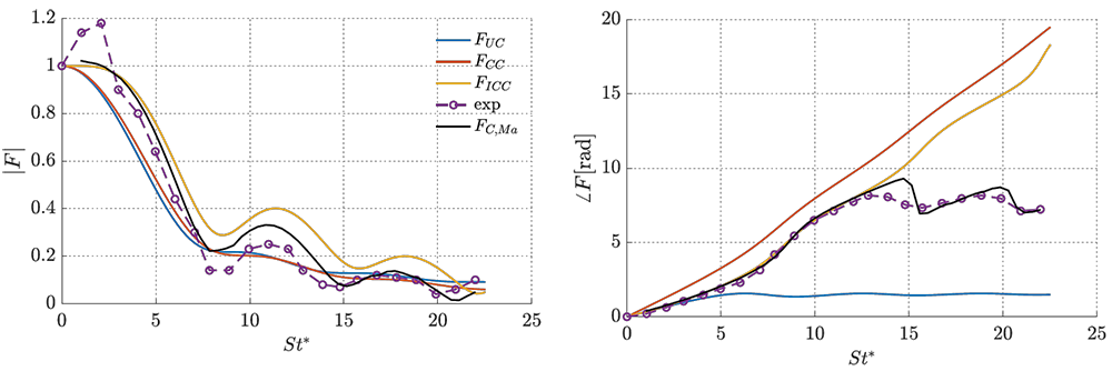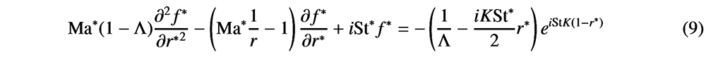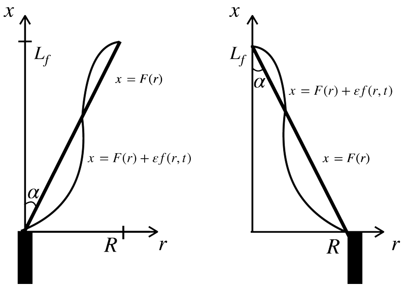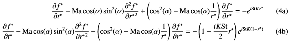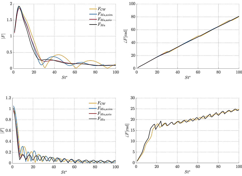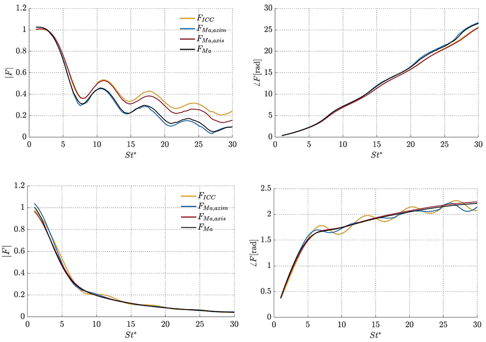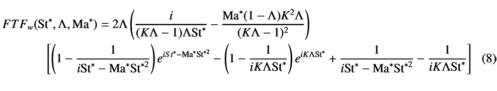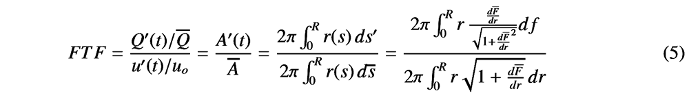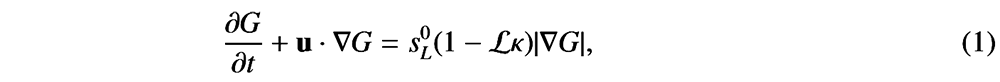 A A A Volume : 44 Part : 2 Proceedings of the Institute of Acoustics Impact of stretch on the flame dynamics of laminar premixed flames Edoardo Scoletta1, Technical University of Munich, Garching, Germany Wolfgang Polifke2, Technical University of Munich, Garching, Germany ABSTRACT Flame transfer functions (FTF) of laminar premixed flames are analytically investigated and modelled. The study is based on the linearised G-equation, which is used to kinematically track the flame front. In order to incorporate combustion properties, the laminar consumption speed is considered to vary with the flame front stretch. Written in dimensionless form, the G-equation reveals that the FTF depends on three dimensionless parameters: a Strouhal number (St*) that accounts for the convective time of the flow perturbation along the flame-front, the flame aspect-ratio (Λ) and the dimensionless Markstein length (Ma), adimensionalized by the injector radius. It is shown that the latter term is responsible for an additional mechanism that acts as damper or amplifier of the flame perturbation, respectively, for thermodiffusively stable or unstable flames. A LOM FTF is derived both for Conical and V-flames which accounts for this effect and includes a different scaling term for each configuration. The obtained FTFs are compared to previously proposed analytical models from the literature, discussing the conditions where stretch effects are not negligible. 1. INTRODUCTION One of the main challenges in the context of thermoacoustic instabilities is represented by the predictions of unsteady heat released of flames [1]. Among the different methods to determine FTFs, analytical approaches have the benefit of highlighting fundamental physics and capturing the main parameters. Specifically, when these parameters are non-dimensional groups, universal characteristics are identified and, if used as basis of low-order models (LOM), they permit to make predictions when operating conditions change. Analytical analyses on flame dynamics are based on the "level-set approach" (also called G-equation) [2], where the flame-front position is tracked via an iso-surface. Previous works by Schuller et al. [3] and Preetham et al. [4] have identified two Strouhal numbers as the main parameters describing the frequency response of laminar premixed flames. They represent interplaying effects of interference between spatially uniform and non-uniform disturbances. The goal of the present study is to further enhance the modelling, in particular it is examined the impact of not considering constant laminar consumption speed, but depending on the flame front stretch [5]. The investigation is not completely new: Wang et al. [6], Preetham et al. [7] have already included stretch effects, but their analyses were limited to V-flames. The present work expands on conical flame geometry and the simultaneous variation of all three depending parameters, leading to a more complete description of regimes. 2. METHODOLOGY The linearized G-equation is used to kinematically described the flame motion subjected to flow perturbations [2]: where for the 2D cases considered here, G(x,r, t) = x − F(r) − ε f (r, t) = 0 represents the level-set tracking flame-front, as illustrated in Figure 1. The velocity field is modelled as in Eq.(2), postulating a convective velocity perturbation. Radial velocity perturbations will also be included ("incompressible-convective perturbation model") for the conical flame as it is considered responsible for specific features of the frequency response, e.g. local maxima in the gain of conical flames [8]: where Here the ratio between burner mean velocity and convection speed K = uo / uc is introduced as perturbations do usually not convect with the same speed as the mean flow [9, 10]. The consumption speed is assumed varying linearly with stretch, here considered only due to curvature. The hydrodynamic strain component of stretch is instead neglected, as Preetham et al. [7] showed its minor importance on the final FTFs. Both configurations of stabilised flames considered (conical and V-flame) are axisymmetric surfaces. Hence their mean curvature, as the sum of curvature terms along the axisymmetric and azimuthal direction, is: After substituting Eq.(3), Eq.(2) in Eq.(1), one obtains the zero-order equation F(r), i.e. mean flame position and the first-order approximation f(r, t), which describes the front displacement. To simplify the number of depending parameters, the zero-order equation is considered with constant flame angle (dF / dr = 1/ tan(α)), this implies that for conical flames, tip curvature is neglected. This is considered a reasonable approximation because the flame length error introduced is negligible and also because the flame tip should be described differently as its displacement speed can be much higher than those on the flame sides [11]. Variables are then non-dimensionalised: f ∗(r, t) = f (r, t) / Lf, r ∗ = r / R, t ∗ = uot / Lf and the equations for the front displacement for each configuration written in dimensionless form in Eq.(4a) for V-flame and Eq.(4b) for conical: where St = ωLf / uo and Ma = L / R Afterwards (4a), (4b) are divided by cos2(α), obtaining three non-dimensional numbers: Λ = cos2(α), St∗ = St/Λ (related to the amount of time taken for a flame-front disturbance to propagate the flame length, Preetham et al. [4]) and Ma∗ = Ma / cos(α). The Π-criterion is also fulfilled: the flame dynamics originally depending upon five parameters is reduced to three (St∗, Λ, Ma∗), as there are two fundamental units [L] and [T] used for the kinematic description. Figure 1: Sketch of the flames in the axisymmetric ref.system, (left) V-flame, (right) conical flame 3. RESULTS AND DISCUSSION In the present work the effect of varying consumption speed on the flame dynamics is under investigation. Thus Eqs.(4a),(4b) are written in the most complete form including curvature due to two cont
