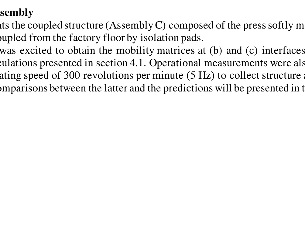 A A A Volume : 44 Part : 2 Application of in-situ blocked forces for characterising structure borne vibration of heavy industrial machinery Florian Cabaret 1 , Jacob McCormick 2 , Kian Samami 3 , Oliver Farrell 4 Farrat Isolevel Ltd Altrincham WA15 8HJ, United Kingdom Andrew Elliott 5 , Joshua Meggitt 6 University of Salford, Acoustics Research Centre Salford M5 4WT, United KingdomABSTRACT Industrial machinery can generate excessive vibration, potentially reducing their productivity and disturbing their surroundings. Thus, it is essential to control vibration in industrial envi- ronments and accurate predictions are required to adopt mitigation measures in the initial de- sign stages. It is first necessary to perform measurements on the vibration source to character- ise its operational behaviour, and the obtained properties can be expressed in terms of its blocked forces according to ISO 20270:2019. The data can be obtained from the source mounted on a specific receiver, but still deliver intrinsic quantities that remain valid for any different receiver structures. Although good agreements have already been achieved between predictions and on-board validations from light weight structures, proving the theory is well understood, it has not yet been tested extensively on heavier assemblies which will be the focus of this work. A source characterisation case study is presented in this paper for a typical heavy industrial installation, known as a press, softly mounted on an inertia block isolated from the surrounding factory floor. A description of how the passive properties of the press were ob- tained and vibration predictions at different positions of the coupled assembly will also be given.1. INTRODUCTIONThe vast majority of companies offering insulation solutions for industrial machines rely on de- signs that are several decades old and fairly similar for all types of machines, rarely taking into ac- count their specificities in terms of dynamic behaviours. Therefore, solutions simply based on expe- rience, most likely uneconomical and unoptimized, are offered to an industry in constant search of1 fc@farrat.com2 jm@farrat.com3 km@farrat.com4 of@farrat.com5 a.s.elliott@salford.ac.uk6 j.w.r.meggitt@salford.ac.ukworm 2022 performance, quality and sustainability. This situation offers real prospects for development and state of the art vibro-acoustics approaches can be used to address the above-described problems.To predict the vibro-acoustic response of any industrial system, the source of vibration must firstly be characterised. While an acoustic source can easily be described independently from its environ- ment using its sound power, a vibration source presents a structural power that depends on the type of structure it is attached to. This has caused a certain number of limitations that have been addressed with the popularisation of the blocked force method for source characterisation [1]. The blocked force is an intrinsic source property and can be obtained by means of in-situ measurements taken on the structure attached as in real operation, where no unpractical conditions such as free-free or fixed boundaries need to be established. This method is now commonly used and has been successfully applied to relatively small scale assemblies such as a spindle from a tire-suspension assembly [2], an air generation and treatment unit (AGTU) to be installed on a train [3], or a small air compressor attached to an inertia block [4]. The responses on the receiving structure can then be evaluated by combining the blocked force with the frequency response functions of the combined system; itself obtained from the individual assembly sub-systems through a process known as dynamic sub-struc- turing [5][6]. Dynamic sub-structuring has proven to be extremely powerful thanks to its capability to associate measured and simulated FRFs of individual elements which would be part of the same assembly to predict its overall behaviour once coupled. In the context of heavy industrial machinery design, dynamic sub-structuring offers design engineers the ability to lower the design iterations and optimise the isolation solutions before its physical installation.This paper presents a case study where the in-situ blocked force together with the sub-structuring method (so-called component-TPA) are applied on a heavy industrial machine resiliently mounted to an isolated foundation. The blocked forces are firstly calculated at the feet of the press and used to derive the level of vibration on and off the foundation, and compared to those directly measured when the source is operating. Finally, various sub-structuring approaches, considering three sub-elements of the assembly (vibration source, resilient mounts and receiver) are applied to predict the level of vibration experienced at two locations of the structure and are compared with actual operational measurements.2. THEORYThe assembly used as part of the experiment is composed of five elements (see Figure 1), namely: the vibration source (S), isolation mounts (I 1 ), inertia block (IB), isolation pads (I 2 ) and receiver (R). An industrial press was used as a vibration source. It was softly mounted on a concrete foundation (inertial block) providing mass, damping and increasing the system stability as a result of increased stiffness and lower centre of gravity. This inertia block is decoupled from the surrounding factory floor with isolators, which provide a soft connection reducing structure-borne vibration transmitted to the environment.Figure 1 describes the elements of the assembly and their interfaces, presenting the excitation and response positions used for the experimental measurements. (a) is the location of the internal forces within the source, (b) represents the source-isolation mounts interface, (c) is the isolation mounts- inertia block interface, (d) is the inertia block-isolators interface, (e) is the isolators-receiver interface and (f) is the 