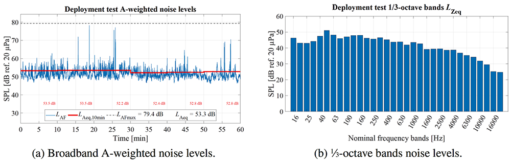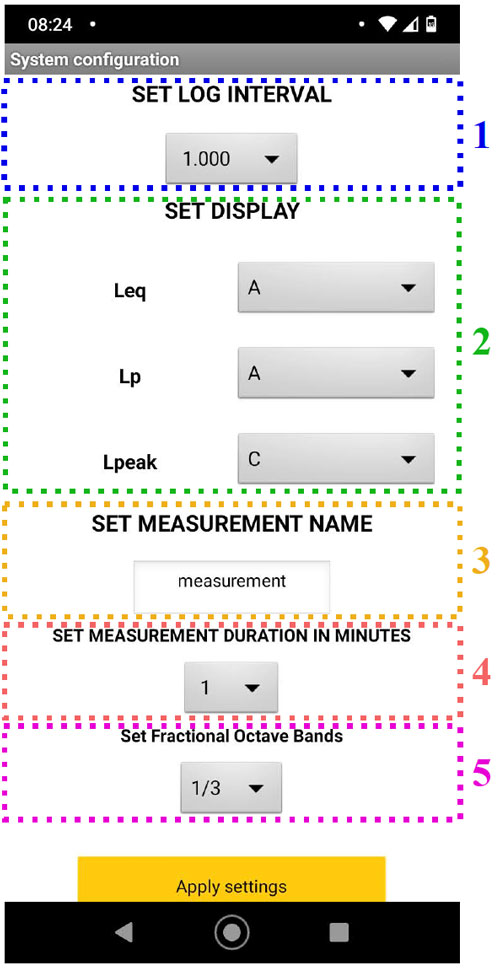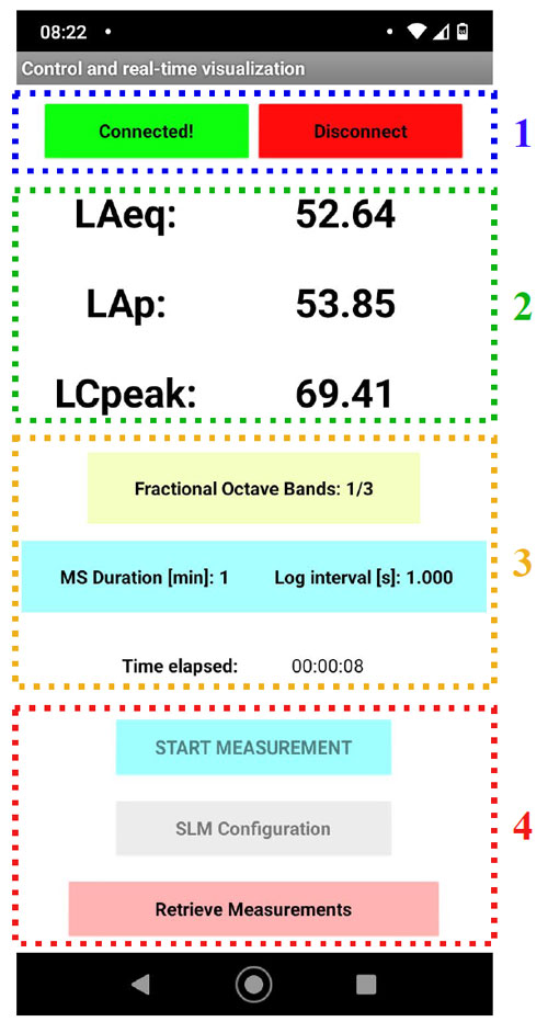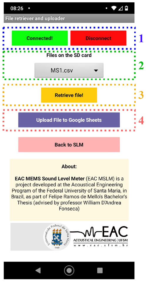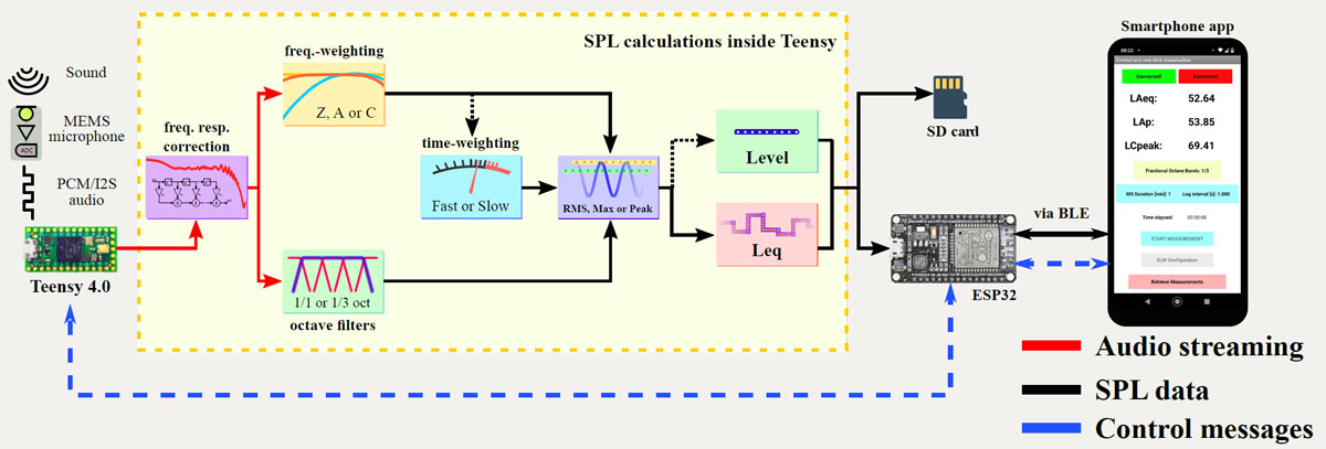 A A A Volume : 44 Part : 2 Proceedings of the Institute of Acoustics Autonomous noise monitoring system based on digital MEMS microphones: development of a smartphone application for remote communication Felipe Ramos de Mello1, Acoustical Engineering, Federal University of Santa Maria, Santa Maria, Brazil William D’Andrea Fonseca2, Acoustical Engineering, Federal University of Santa Maria, Santa Maria, Brazil Paulo Henrique Mareze3, Acoustical Engineering, Federal University of Santa Maria, Santa Maria, Brazil ABSTRACT Noise monitoring is a useful diagnostic tool for making better decisions in noise control projects and understanding the sonic behavior of a place. Traditionally, sound pressure levels are measured using a sound level meter (SLM), usually for a limited time frame. However, recently much interest has arisen in developing wireless sensor networks that work continuously, especially using cost-effective embedded systems. In this sense, digital micro-electrical-mechanical (MEMS) microphones are a great promise in creating such devices due to their low-cost, high-quality, and integrated analog to digital converter. This paper presents a noise monitoring system based upon digital MEMS microphones, Arduino compatible microcontrollers (Teensy and ESP32), and an Android app. The app connects with the system via Bluetooth for configuration and control. Once a measurement is set up and running, the system acts autonomously, saving data into an SD card. By the end of the assessment, it is possible to wirelessly retrieve the saved data and upload it to an online spreadsheet. The device was deployed in an office and measured for one hour, with all data being successfully retrieved. Ultimately, the system could be applied to indoor noise monitoring and used to assess the effectiveness of noise control projects, for example. Keywords: Smart cities, Internet of Things, Teensy 4.0. 1. INTRODUCTION In modern days, a great percentage of the population lives in cities and urban centers [1]. Therefore, a higher concentration of people are living and working in buildings, circulating in public spaces, and using motor vehicles for transportation. This, in turn, leads to an increase in noise levels, which interferes with life quality and can cause serious health problems in humans and animals [2]. On top of that, noise complaints are becoming more frequent, yielding city managers to come up with strategies to regulate and inspect noise emission [3–5]. In this regard, agencies and public departments have created laws, rules, and guidelines to establish acceptable community noise levels (e.g., WHO, European Commission, Conama). In Brazil, for example, the standard ABNT NBR 10151:2019 establishes procedures for measurement and evaluation of sound pressure levels (SPL) on inhabited areas (both external and internal), as well as limits for SPL as a function of land use and occupation [6]. The majority of those guidelines use LAeq, Lden, and Lnight measurements as their main evaluation parameters. For instance, WHO’s Environmental Noise Guidelines for the European Region recommends a yearly average of 70 dB LAeq,24h for all leisure noise sources combined and correlates health outcomes such as cardiovascular diseases, effects on sleep, and cognitive impairments to Lden, and Lnight values [2]. Usually, to evaluate environmental noise, measurements are carried out on demand by an acoustician, or technician, using a standardized Sound Level Meter (SLM, according to IEC 61672 [7]). This approach is expensive1, time-consuming, and not feasible for high space discretization. In addition, someone must carry out the evaluations in person, which constraints both the assessment period and the number of evaluation points. Furthermore, in Brazil is common to use those kinds of measurements to calibrate sound maps and environmental noise simulations. 1 Standardized SLMs can cost from $1500 to $20000. To overcome the aforementioned disadvantages, much interest has arisen in developing Wireless Acoustic Sensors Networks (or WASN) for noise monitoring, especially using low-cost devices (see these works [8–10]). This field of research considers two types of devices ([11]): Those that measure only sound pressure levels; and Those that are capable of source identification and/or separation. This paper presents a cost-effective prototype for autonomous noise monitoring based on digital MEMS microphones and readily available electronic components. The device is capable of measuring Equivalent Continuous Sound Pressure Levels with A, C, and Z frequency-weightings, instantaneous time-weighted SPL (Fast and Slow), as well as SPL in Fractional Octave Bands (1/1 and1/3), storing everything into an SD card. Additionally, it has a wireless connection, allowing for communication with smartphones, for example. Finally, to configure, control, and retrieve data from the device, an Android application was developed. The app can read files from the device’s SD card and send them to an online spreadsheet for data visualization and further analysis. The system is intended for continuous indoor noise monitoring (such as in condominiums, buildings, schools, etc.), enabling communities to closely inspect their noise levels and act accordingly and can also be used as a portable SLM. Furthermore, this research aims to contribute to the implementation of WASNs in Brazil, as the country has no published work or projects in this regard (at least to the authors’ knowledge). Ultimately, this is a follow-up to the paper entitled MEMS digital microphone and Arduino compatible microcontroller: an embedded system for noise monitoring, presented at Internoise 2021 [12]. The next sections are organized as follows. Section 2 describes the hardware used, software, and algorithm validations. Section 3 detail the used components and their interconnections. Section 4 outlines the Android application development and its features. Section 5 shows the 