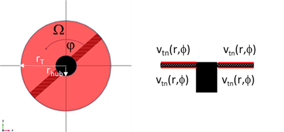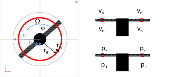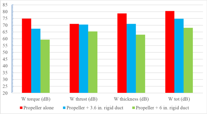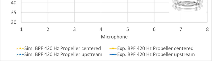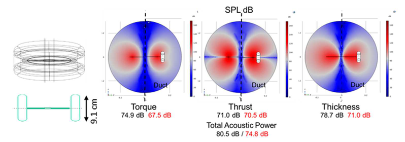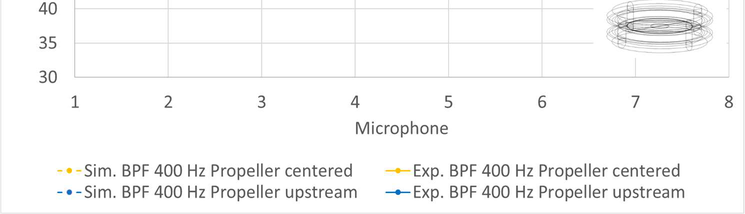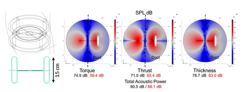 A A A Volume : 44 Part : 2 Fundamental noise characterization of a ducted propeller in hover Frank Simon 1 DMPE - ONERA - Université de Toulouse F-31055, Toulouse, France Noah H. Schiller 2 , Nikolas S. Zawodny 3 , Nicole A. Pettingill 4 , Matthew B. Galles 5 NASA Langley Research Center Hampton, Virginia 23681, USA ABSTRACT Unmanned aerial vehicles (UAVs) are currently being used for reconnaissance missions, tactical surveillance, and infrastructure inspection. When legislation allows it, these devices will provide additional services close to inhabited areas, which could lead to noise complaints. On most UAVs, the propellers are the dominant source of noise. As a result, researchers have studied the impact of propeller shape and blade count on noise. Much of this work, however, has focused on isolated propellers. While different UAV concepts are equipped with ducts for aerodynamic and protection reasons, few studies focus on the acoustic benefit of ducts, as is achieved, for example, on turbofan aircraft. The objectives of this paper are: first, to simulate the noise radiation of a UAV propeller in static conditions based on its location in a hard wall duct; second, to analyze the contribution of the different acoustic source components (i.e., thrust, torque, and thickness); and third, to validate the approach with experiments conducted in the NASA Small Hover Anechoic Chamber over a range of propeller rotation rates. For the propeller and duct geometries considered in this experiment, it is shown that the best attenuation is achieved when the propeller is centered axially in the duct because of interference between upstream and downstream radiated waves. 1. INTRODUCTIONUnmanned aerial vehicles (UAVs) are being developed for various applications including reconnaissance, tactical surveillance, infrastructure inspection (e.g., bridges, buildings, and rail networks), and even inventory management in distribution centers. In the future, UAVs could also be used to provide personal services (e.g., delivery and even personal transportation) in populated areas. All of these applications would benefit from quieter vehicles. While many UAVs have electric motors that may generate high frequency tonal noise, propellers are typically the dominant noise source producing both tonal and broadband noise [1, 2]. Researchers have therefore considered various strategies to reduce propeller noise including varying the blade shape, propeller airframe spacing, propeller layout, and blade surface texture [3-8]. Ducts can also be used around the propellers to modify the acoustic radiation. For example, Martin and Boxwell [9] measured the noise radiated by a 2-bladed propeller surrounded by a 25.4 cm diameter rigid duct. The acoustic test, conducted in hover-type conditions, showed that the duct can increase the broadband noise relative to an isolated propeller if the duct leading edge radius is too small. The duct, however, was found to have little impact on the tonal noise at the blade passage frequency (BPF). In contrast, Malgoezar et al. [10] tested a 30 cm diameter duct in an anechoic wind tunnel and found1 frank.simon@onera.fr 2 noah.h.schiller@nasa.gov, 3 nikolas.s.zawodny@nasa.gov, 4 nicole.a.pettingill@nasa.gov, 5 matthew.b.galles@nasa.gov| itt Tech| ata inter.noise 21-24 AUGUST SCOTTISH EVENT CAMPUS ? O ? 2 GLASGOW that the duct reduced the tonal noise at the BPF relative to an isolated propeller, particularly with low- speed (i.e., 10 m/s) background flow. The background flow also reduced the broadband noise of the ducted propeller relative to the no-flow test. The purpose of this study is to provide a fundamental numerical assessment of the impact of the duct on acoustic propagation and scattering at the propeller BPF. The objectives of the paper are: first, to simulate the tonal noise at the BPF for a ducted propeller in hover conditions; second, to analyze the contribution of different tonal source components (steady loading and thickness noise); and third, to compare predictions with experiments conducted in an anechoic chamber with low-speed background flow. 2. THEORETICAL “RING SOURCE” APPROACHTo assess the effect of a duct on acoustic radiation at the propeller BPF, this study relies on a propeller noise formulation implemented in an acoustic finite element model. The formulation captures steady loading and thickness noise radiated from an isolated propeller but does not account for changes in the flow characteristics or loading conditions due to the duct. Instead, the blade shape, operating conditions, thrust, and torque are all inputs to the model. Asymptotic approximations can be used to understand the 3D structure of the pressure field produced by a spinning sinusoidal distribution of steady loading and thickness sources. These formulations highlight the presence of creeping evanescent waves in the near field that do not radiate efficiently to the far-field, but still interact with the duct [11,12]. These types of formulations often provide directivity but not absolute source pressure, which depends on the loading and design of the propeller. The formulation by Garrick and Watkins [13], describing near-field pressure as a function of thrust and torque, is used in this study. Specifically, the effective ring approximation is used, which assumes the thrust and torque are concentrated on an annular ring instead of distributed over the propeller disk. The annular ring is placed at an effective propeller radius , usually 0.8 of the blade radius, as depicted in Figure 1 (a). The pressure field due to the thrust and torque components can be defined as:R, ∓ 12 (1) and 12 !" # R, (2)where ! is the harmonic number, " is the blade count, is the azimuthal angle, R, $%& 4( ) is the free-space Green’s function with ( defined as the distance between the observer and an elemental radiator on the annular ring, * is the acoustic wavenumber, and is the propeller axis.(a) (b)Figure 1: (a) Top view o