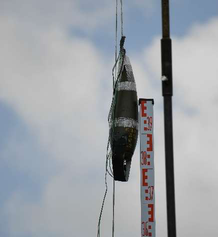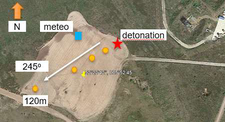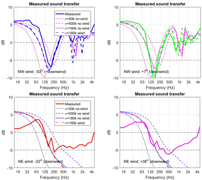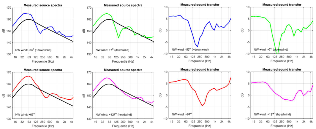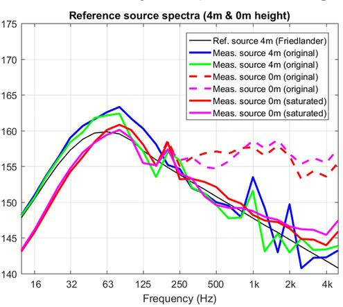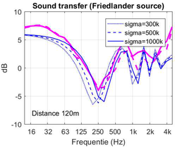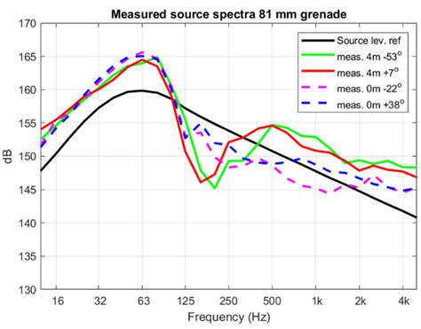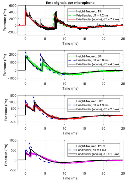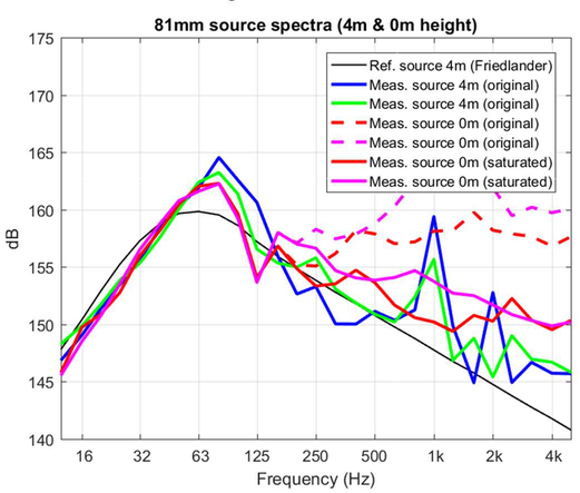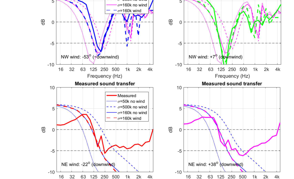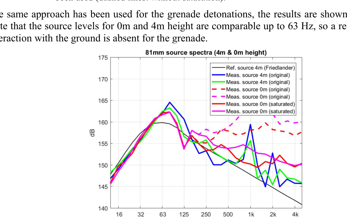 A A A Volume : 44 Part : 2 Sound propagation for a low height impulsive source over an absorbing ground Frits van der Eerden 1 , Frank van den Berg, Ad van Heijningen TNO − Acoustics & Sonar department Oude Waalsdorperweg 63, 2597 AK, The Hague, The NetherlandsABSTRACT Noise contours around military training areas are calculated by using: a) the measured source strength for the impulsive sources and b) the calculated sound propagation using a representative set of meteorological situations. For high-energy impulsive sounds the source strength is measured at distances beyond 100 meters, where peak levels are below 154 dB. A linear model is used to correct for the sound propagation from the source to the measurement position. In this way a linear source strength is determined that can be used with linear sound propagation models. Previous results showed that the source strengths at higher frequencies (above 250 to 500 Hz) were overestimated when the impulsive source is on the ground. Apparently, the calculated sound propagation over an absorbing ground, used to determine the source strength, is accounting for too much ground absorption effect. Note that the actual meteorology and ground absorption are measured during the measurements. In this paper an impulsive reference source is used at two heights and the sound propagation is measured and calculated at increasing distances. It is shown that the measured ground absorption effect saturates for higher frequencies. Next, an unknown impulsive source was measured and the effect of saturation was demonstrated.1. INTRODUCTIONIn general the noise contours for an area of interest can be determined using known acoustic sources and a calculation model for the sound propagation. For The Netherlands Ministry of Defence (MoD-NL) the impulsive sources used at military training areas are measured according to one of three techniques, depending on the peak level of the shockwave. For small arms the measurement distance for the microphones around the weapon is about 10 meters [1]. For larger weapons a distance of more than 100 meters is used [2]. The source strength is corrected for the sound propagation (or sound transfer) using a model that accounts for the actual meteorology and ground effect, such as the parabolic equation model [3]. By using a larger distance the measured peak levels are below 154 dB so that a linear sound propagation model can be used and also the source strength can be further used with linear models. Many measurements were carried out for large weapons, such as muzzle blasts from artillery fire and grenade detonations. For a muzzle blast the source height can be for example 2 meters, but for grenade detonations also zero height is used. It was seen that the source strengths at higher frequencies (above 250 to 500 Hz) were overestimated using this procedure when the source is on an absorbing ground.1 Frits.vandereerden@tno.nlJai. inter noise 21-24 AUGUST SCOTTISH EVENT CAMPUS ? O ? . GLASGOW In Figure 1 (left hand side) a source spectrum for a relatively high-energy impulsive source is drawn, with a logarithmic scale for the frequency, usually in one-third octave bands. The figure also shows a source spectrum with an overestimation at higher frequencies.SEL (dB) source spectrum too high source spectrum correct Frequency (Hz)Figure 1: Left: Sketch of a source spectrum with correct levels and with too high levels dueto incorrect calculation of the sound transfer. Right: Measured and calculated sound transfer between source and microphone position.Frequency (Hz) OL 9 0S (ap) "1p OL-The objective of this paper is to show that this overestimation is due to the calculated sound transfer. The source spectrum is determined by using measurements and corrections for the sound transfer (meteo & ground), distance and air absorption. The right hand side figure shows an impression of the calculated sound transfer dL tf for a source on the ground. At low frequencies there is almost no ground absorption and the sound levels are doubled (coherently, i.e. +6 dB). The absorbing ground effect, which can be calculated with a complex impedance model such as Wilson [4] or Delany & Bazley, reduces the sound levels at higher frequencies. This is the result of destructive interference between two point sources. It will be shown that the sound transfer can also be measured with a known reference source. This resulted in a corrected approach for the calculated sound transfer using a saturation level of -5 dB for the heather ground on which measurements normally take place.Figure 2: Grenade at 0m and 4m height (left). Reference source at 0m and 4m height (right). This paper describes the measurements with a reference source (250 gram PETN) at 4m and 0m height and the measurements with a grenade, also at both heights, see Figure 2. The source strength for the reference source is determined by using measurements also at closer distances (and including a nonlinear propagation model). Finally, the source strength of the grenade is determined using an empirically corrected sound transfer when the source is detonating on an absorbing ground. 2. MEASUREMENTS WITH A REFERENCE SOURCEMeasurements of 250 grams PETN based explosions (TNT equivalent 415 grams) were carried out at three different heights (0, 2m and 4m) and at four distances (15; 30; 60 and 120m), see Figure 3 . Also, ground impedance measurements were carried out using the two microphone technique and a one parameter model [4]. The wind and temperature profiles were determined using a meteo mast. The measurement were performed on a so called “smoke field” where test are performed with combustible materials. This terrain is regularly plowed to prevent the ground from catching fire. It was expected that the soil would be acoustically very soft, but rather high values for the flow resistivity were found, in the order of 4000 kPa.s.m -2 . When the ground was compacted by foot, and a bit rougher as a conse