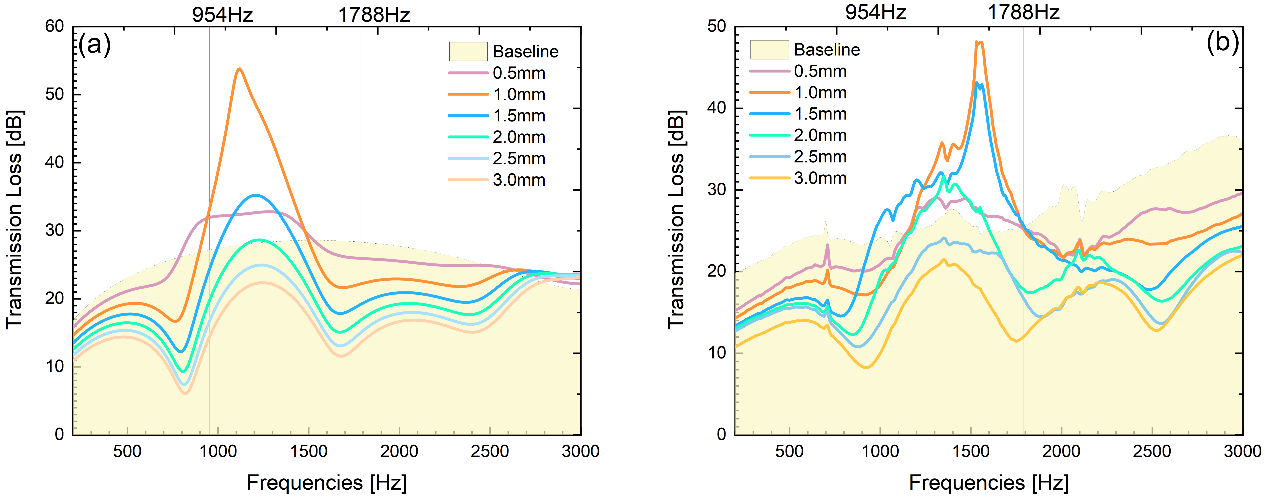 A A A Volume : 44 Part : 2 Proceedings of the Institute of Acoustics Experimental and numerical studies on the Hilbert fractal architecture as an acoustic metamaterial Gianni Comandini1, Bristol Composite Institute, University of Bristol, Bristol, United Kingdom Valeska P. Ting2, Bristol Composite Institute, University of Bristol, Bristol, United Kingdom Mahdi Azarpeyvand3, University of Bristol, Bristol, United Kingdom Fabrizio Scarpa4, Bristol Composite Institute, University of Bristol, Bristol, United Kingdom ABSTRACT We evaluate via experiments and numerical methods the transmission loss behaviour of Hilbert Frac tal Metamaterials (HFMs)s tested in a four-microphone impedance tube. We explore the effect of the fractal order and widths of the cavity slots of HFMs 3D printed in PLA polymer. The COMSOL Finite Element models used here consider both thermoviscous and lossless domains. Tests and simulations have been carried out between 0.2 kHz and 3.0 kHz, with gap widths parametrised between 0.5 mm and 3.0 mm. A broad agreement is observed between the numerical models and the experimental results. The Hilbert fractal with the highest impact in terms of transmission loss isthe one represented by the second order, with an experimental peak of almost 50 dB around 1600 Hz. All the HFMs orders show the presence of multiple TL peaks, with the gap width also a critical parameter to tailor the performance of these metamaterials. 1. INTRODUCTION The Hilbert is perhaps the most evaluated fractal geometrical shape for metamaterial platforms [1]. This peculiar fractal was initially investigated for antenna applications [2]. More recently, this space-filling curve has been the subject of studies related to acoustics [3]. In this work, we present a comprehensive numerical and experimental study of Hilbert fractal-based acoustic metamaterials, starting from fractal at order zero, until the fifth order. Samples have been produced using 3D printing of polylactic acid (PLA) material. By using PLA rather than other materials, it is possible to reduce the environmental footprint of the prototypes made by additive manufacturing. All the samples after the experimental campaign were successfully recycled to produce new PLA filaments. 2. DESIGN AND TESTS The specimens have been designed with an inlet and an outlet on the opposite faces of the samples to allow the acoustic waves to pass through. The test rig used is an impedance tube with four micro phones and white noise excitation. The test range is between 0.2 kHz and 3.0 kHz. Finite Element simulations have been performed using COMSOL Multiphysics to verify the experimental trends measured, with specific emphasis on the transmission loss (TL) effect provided by the fractal order, plus geometry features like the width of the gaps in the samples. Each fractal sample was produced with six different gap widths. The gap width ranges between 0.5 mm and 3.0 mm, with steps of 0.5 mm. To obtain reliable and statistically robust data, each sample was tested in the impedance tube five times on one side, and another five times by rotating the sample by 180 degrees with respect to the incoming acoustic wave direction. Figure 1: Hilbert fractals of (a) order zero, (b) first order (c) and second order. The design process involves a subdivision of the square area in equal portions with the relative centroid. On the left of each sample (a, b, and c) the process to generate the corresponding fractal geometry that starts from a square area. 3. DATA ANALYSIS The higher peaks of the transmission loss (TL) occur for a gap width of 1.0 mm. The transmission loss increases within the range of frequencies investigated here, for gap values varying from 0.5 mm to 1.0 mm. The values of TL decrease for all the five Hilbert fractal orders investigated, starting from 1.5 mm to 3.0 mm. The TL performance of the fractals is compared with the one of a baseline bulk PLA element with 30% filling volume. The comparison with the baseline underlines a worse insulation effect in all frequencies between 200 Hz and 3000 Hz for a gap width that is not 1.0 mm. In terms of TL, this behaviour happens in both simulations and experiments. According to both experiments and simulations, it appears that openings wider than 2.5 mm will perform worse than a simple cube of PLA with the same external dimension (50.8 mm) as the metamaterial one. The peak region shown in Figure 2 is referred to the second order Hilbert fractal. Between 954Hz and 1788 Hz, a peak with a similar magnitude is also shown by the finite element simulations. The comparison between predictions and experiments follows the same trend, underlining how the peaks broadly occur in the same interval of frequencies. The figures show that the highest contribution to the TL is the gap width (between 0.5 mm and 1.5 mm). After 2000 Hz, the finite element model provides a slightly different behaviour compared to the experimental data. Around 3000 Hz, the results converge around a narrow region near the baseline, as shown in Figure 2a. On the other hand, for the experiment, in Figure 2b, the transmission loss output of the experiments around 300 Hz they do not converge as in the COMSOL model. However, the FEM capture with a good approximation of the TL behaviour between 200 Hz and 2500 Hz. Figure 2: In figure (a), transmission loss FEM results of the six gaps width between 0.5 mm and 3.0 mm for the second-order Hilbert fractal and comparison with the baseline that is a cube of PLA. Figure (b) shows the experimental results for the same fractal and gap width. 4. FEM The finite element model used in this work is based on the use of three separate domains. The first one is represented by a mesh with lossless behaviour. The second one represents the air inside the small passage inside the metamaterial and is modelled considering thermoviscous losses through the resolution of linearized Navier-Stokes equations. In this latter, boundary layers with square elem