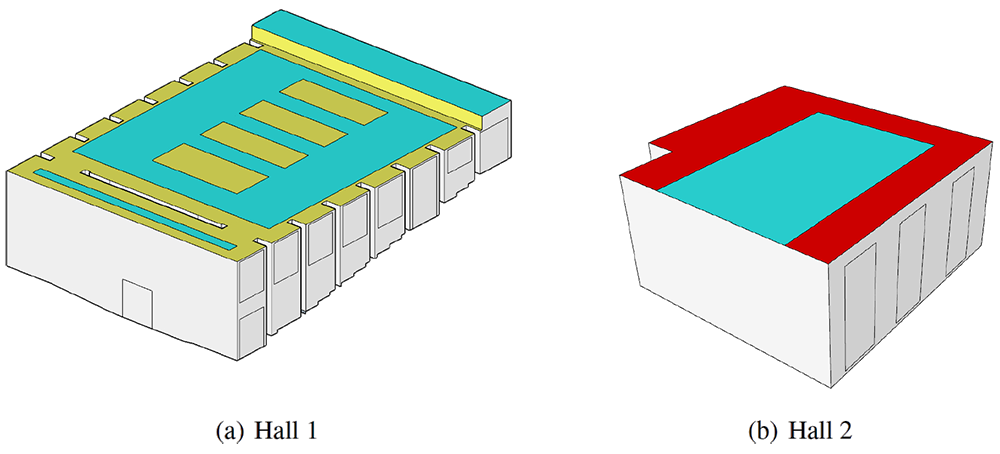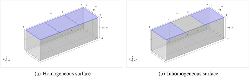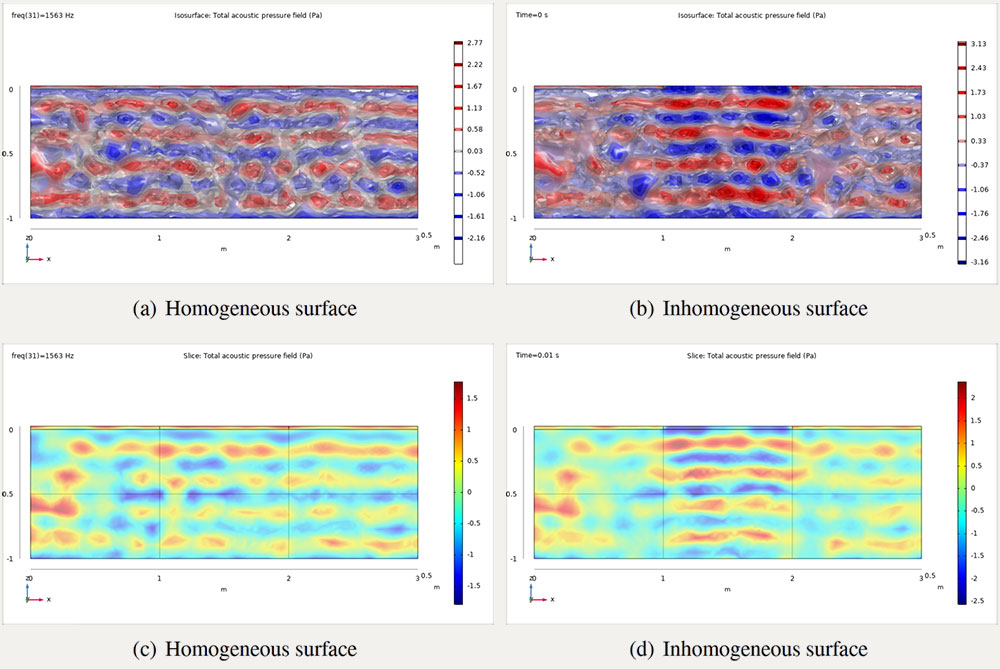 A A A Volume : 44 Part : 2 Proceedings of the Institute of Acoustics Mixing materials in false ceilings to increase sound diffusion in education spaces Giulia Fratoni1, University of Bologna, Bologna, Italy Dario D’Orazio, University of Bologna, Bologna, Italy Luca Barbaresi, University of Bologna, Bologna, Italy Massimo Garai, University of Bologna, Bologna, Italy Luca Cappellini, Saint-Gobain Italia S.p.A., Milan, Italy ABSTRACT According to the International standards on education spaces, in situ acoustic tests should achieve specific reverberation time targets. Since the match between predictive formulas and measurements increase with the sound field diffuseness, it is extremely important to pursue such condition through proper design choices. For example, false ceilings can play a key role in controlling room acoustic features; however, the use of such elements is generally considered only for absorption purposes. For this reason, the present work concerns mixing materials in false ceilings within a group of teaching spaces here taken as case studies. The alternation of materials with different acoustic impedances has been investigated through experimental acoustic measurements and numerical models in order to assess the related sound diffusion increase. The ceiling treatment here proposed proved to be an efficient and smart method to exploit diffraction effects along material discontinuities junctions. The match between early design predictive formulas and the results of the acoustic measurements enhanced the reliability of the acoustic design process and set up a potential new guideline for indoor acoustic treatments. 1. INTRODUCTION Acoustic comfort of education spaces is generally determined by target values of reverberation time. Predictive methods proposed by International standards typically involve the Sabine’s formula, and thus the diffuse sound field assumption [1–4]. Therefore, achieving such condition in teaching environments as much as possible becomes essential for the match between predictive outcomes and the results of in-situ measurements. With this purpose, the attention is here focused on the passive acoustic treatments of false ceilings, which are the indoor surfaces that mostly affect room acoustic criteria thanks to their extension and location in the built environments [5]. While a widespread tendency is covering false ceilings with uniform sound absorbing surfaces, the present work outlines a method for specific materials’ mix to increase the diffuseness of sound field. In fact, a passive treatment false ceilings with the same material could hinder the fulfillment of the classic diffuse field theory’s conditions, due to the non-uniform distribution of the overall absorbing materials in the room [6]. Conversely, inhomogeneous surfaces with different specific acoustic impedances (see Figure 1) are more likely to cause diffraction effects along material discontinuities junctions [7], increasing the global sound field diffusion throughout the space [8]. Figure 1: Inhomogeneous surface with different specific acoustic impedances (image taken from [7]). 2. METHOD This paper addresses the effect of different materials placement in false ceilings for the acoustical conditions in education spaces. Patterns with specific impedances alternation have been designed, installed, and measured in two teaching environments to test such a design choice. Mixing perforated gypsum board and plasterboard modules has been considered the adequate solution for large volumes, whilst mixing perforated gypsum board and rock wool modules at high density has been considered the adequate solution for mid-sized volumes. The present study presents the experimental results of in situ acoustic measurements compared with the predicted target values (Sabine’s formula). Also, numerical models have been employed to preliminarly assess the related sound diffusion increase. 2.1. Case studies The case studies considered in the present study are: Hall 1, a large university lecture hall (V = 1200 m3); Hall 2, a medium-sized classroom (V = 150 m3). The installation of three materials with different acoustic impedances has been arranged as it is shown in Figure 2. The placement and the choice of false ceilings modules depends on the size of the hall. Generally, it is better to have a central region of the ceiling with reflecting properties at medium-high frequencies - where most of the speech signal energy is - and to keep any absorbing Figure 2: Education spaces taken as case studies. Materials mix in false ceilings treatments is highlighted: standard plasterboard modules (yellow), perforated gypsum modules (blue), and rock wool modules at high density (red). material in the perimeter areas of the false ceiling. This solution grants a proper balance between the absorption of the occupancy and the absorption of the halls, enhancing the speech intelligibility conditions. Acoustic measurements were carried out according to [9–11] as acceptance test of the passive treatment design. In Hall 2 it has been possible to perform the measurements in two different conditions: with a uniform ceiling treatment and with the materials mix shown in Figure 2. 2.2. Numerical models In order to assess the effect of ceiling mix on the sound field diffuseness, specific numerical models were built with COMSOL Multiphysics v. 5.1. Figure 3 shows the two simplest configurations that have been explored: an homogeneous surface (uniform placement of rock wool modules) and an inhomogeneous surface (alternance of rock wool and gypsum board modules). The Acoustics and Pressure acoustics, frequency domain modules were employed. A plane wave radiation condition was set at the lower boundary of the control volume (3x1x1m), approximating the system excitement, i.e. the sound energy coming from the room towards the ceiling. The output surface is transversal to the control volume to detect the different sound pressure fluctuat