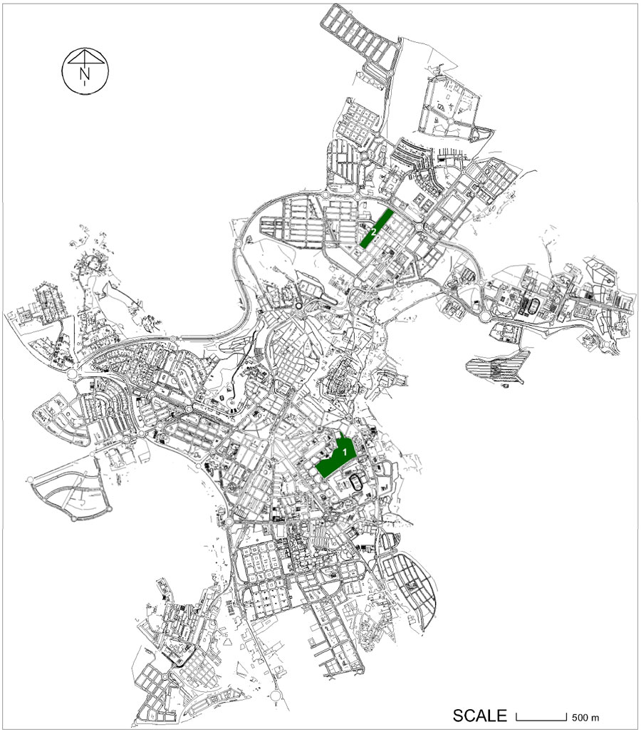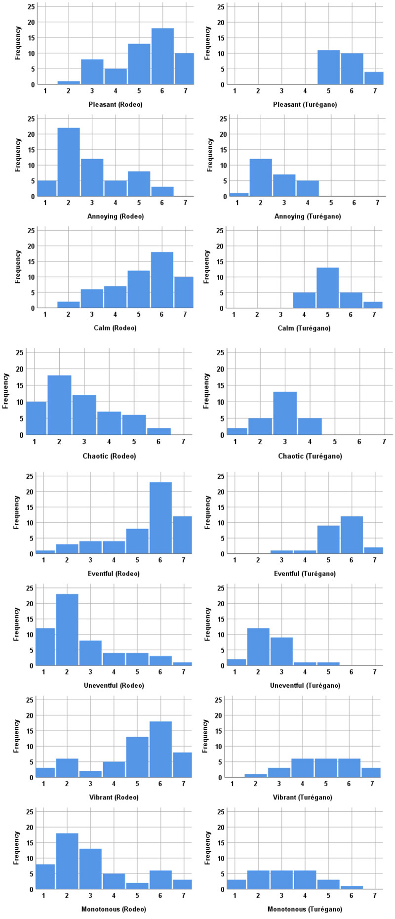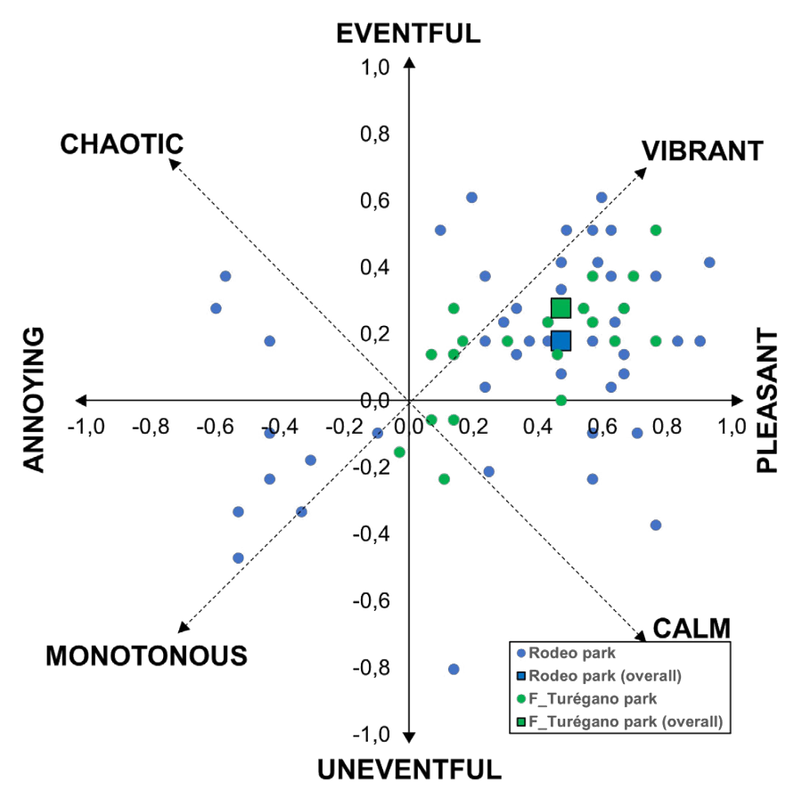 A A A Volume : 44 Part : 2 Proceedings of the Institute of Acoustics The quality of green spaces in Cáceres (Spain) when compared to those in other cities Guillermo Rey-Gozalo1, University of Extremadura, Cáceres, Spain Juan Miguel Barrigón Morillas2, University of Extremadura, Cáceres, Spain David Montes González3, University of Extremadura, Cáceres, Spain Carlos Iglesias-Merchan4, Universidad Politécnica de Madrid, Madrid, Spain Pierre Aumond5, Univ. Gustave Eiffel / UMRAE, Bouguenais, France Rosendo Vílchez-Gómez6, University of Extremadura, Cáceres, Spain Pedro Atanasio-Moraga7, University of Extremadura, Cáceres, Spain José M. Pérez Pintor8, University of Extremadura, Cáceres, Spain Laura Muñoz-Bermejo9, University of Extremadura, Cáceres, Spain Silvia Merino-de-Miguel10, Universidad Politécnica de Madrid, Madrid, Spain ABSTRACT According to the policies of the European Union, the increase of green spaces is proposed by city managers in their programmes because of their benefits on the well-being and quality of life of citizens. The sound environment is a key factor in the quality of these spaces. However, the extent of new green space is limited in increasingly densely populated cities and small green spaces are consequently becoming more and more common. The acoustic environment of two green spaces of different size was analysed in Cáceres (Spain). The registered sound levels were similar to those of parks in other countries and residential areas but the perception of the soundscape was quite good. Birds were one of the main sound sources in small green space and this contributed to a similar acoustic quality to the large park. The adjectives pleasant and annoying were most closely related to the overall assessment of the parks. 1. INTRODUCTION Urban green spaces (UGS) provide environmental and health benefits to citizens [1]. Thus, the increase of green areas is one of the objectives of urban managers. However, the space available in cities is limited when it comes to building large parks. An adequate planning is necessary for this. Another alternative is the design of small green spaces or recreational areas that meet the needs of citizens [2]. UGS can also be potential quiet areas. The protection of quiet areas is an objective of the Environmental Noise Directive [3]. Additionally, the acoustic quality of these environments should be taken into account if a significant improvement in the quality of life of citizens needs to be ensured [4, 5]. Nowadays, the qualitative improvement of the sound environment, which mainly considers the opinion of people, is as important as the quantitative aspects related to the accuracy of noise maps [6, 7], the consideration of the dynamism of sound levels [8, 9] or the development of accurate low-cost devices [10]. Biological and environmental studies carried out in parks increasingly consider the acoustic environment. However, only noise is considered in most studies, i.e., the negative aspect of the sound environment [11, 12]. Regarding the positive effects of UGS on health and quality of life, proximity and accessibility are the main variables taken into account [13]. Previous studies show the significant relationship between the assessment of the sound environment and the overall perception of urban green spaces [14]. Therefore, the objective (sound levels) and subjective (people's perception) assessment of the sound environment is considered important to achieve high acoustic quality spaces. The city of Cáceres plans in the coming years to increase the number of green spaces, the connectivity between them and the pedestrian areas. This was the reason why it was considered relevant to carry out this study where the acoustic quality of parks of different sizes was evaluated. The results were compared with those obtained in previous studies in other cities. 2. METHODOLOGY Two parks in the city of Cáceres (Spain) were selected for this study: Rodeo and Fernando Turégano (see Figure 1). The opening date was similar in both parks (2000-2001). F. Turégano park is located 2 km from the city centre and has an area of 3.2 ha. The Rodeo park is closer to the city centre and larger than the Turégano park (0.8 km and 10.6 ha, respectively). Considering the total area of the city of Cáceres (17.7 km2), the Rodeo can be considered a large park and the F. Turégano, a small park. The acoustic measurements and surveys were carried out simultaneously. Two devices were used for sound recording: Class 1 sound level meter (2238 Brüel & Kjaer) and binaural recorder (Noisebook, Head Acoustic). Equivalent sound pressure level (dBA), loudness (sone), and sharpness (acum) will be the indicators analysed for this study. The ISO 1996-2 [15, 16] standard recommendations were used with regard to measurement strategy and procedure, meteorological conditions. Regarding the interview, a questionnaire similar to the one proposed by ISO/DIS 12913-2 in Annex C was used [17]. This questionnaire consisted of 3 parts. Part 1: Sound source identification. This was an open-ended question where respondents identified the main sound sources present in the environment. Part 2: Perceived affective quality. The eight adjectives proposed by the ISO 12913-2 were used to evaluate the soundscape. The scale used was from 1 to 7 where 1 was strongly disagree and 7 was strongly agree. Figure 1: Location of the parks analysed in Cáceres: (1) Rodeo and (2) Fernando Turégano. Part 3: Assessment of surrounding sound environment. The following question was asked: Overall, how would you describe the present surrounding sound environment? The scale used was from 0 (very bad) to 10 (very good). Finally, the age and sex of the interviewees were recorded. The interviewees filled out an informed consent form according to the Declaration of Helsinki. A total of 80 people were interviewed: 55 in Rodeo and 25 in F. Turégano. Respondents in the Rodeo park were aged between 18 and