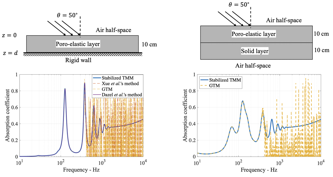 A A A Volume : 44 Part : 2 A general stable approach to modeling and coupling multilayered sys- tems with various types of layers Guochenhao Song 1 Zhuang Mo 2 J. Stuart Bolton 3 Ray W. Herrick Lab, Purdue University 177 South Russell Street, West Lafayette, IN 47907, USAABSTRACT In this article, a general method is proposed to model layered systems with two-by-two transfer ma- trices, and further, to solve for the acoustic absorption, reflection, and transmission coefficients. Since the proposed method uses the matrix representation of various layers and interfaces from the Transfer Matrix Method (TMM), the equation system can be established efficiently. However, the traditional TMM can lose stability when there is a large disparity between the magnitudes of the waves traveling in opposite directions within the layers (i.e., at higher frequencies, for a thick layer, or for extreme parameter values). In such cases, the contribution of the most attenuated wave can be masked by numerical errors and can induce instability when solving the system. Therefore, in the proposed method, to stabilize the calculated acoustic properties of the system, the principle is to ensure the accuracy of the wave attenuation terms by decomposing each layer’s transfer matrix and reformulating the equation system. This method can couple different layer types in a general way and is easy to assemble and implement with numerical code. The predicted acoustic properties of layered systems calculated using the proposed method have been validated by comparison with those pre- dicted by other existing methods.1. INTRODUCTIONThe modeling of layered structures is an essential topic in a wide range of areas: i.e., noise control, vibration control, geodynamics, etc. Numerical methods like finite element and boundary element methods have become popular for systems with complex geometry, although their computational cost is relatively expensive. On the contrary, analytical models are usually developed under certain as- sumptions: e.g., each sub-element layer has a relatively large lateral dimension and is homogeneous. As a result, they usually can produce much higher efficiency and make it possible to perform various computationally intensive tasks: e.g., parameter studies and design optimizations.Previously, several methods have been proposed to couple different types of layers. The “arbitrary coefficient method” (ACM) [1,2] proposed by Bolton et al. first expresses the field variables with the1 song520@purdue.edu2 mo26@purdue.edu3 bolton@purdue.edu2022 amplitude of the propagating waves based on the governing equations of each layer. Then, the equa- tion system to be solved is constructed according to the boundary conditions at interfaces. The ACM is a general method to model multilayered systems, even with poro-elastic layers. However, the method can be time-consuming when redeveloping the equation system for a different layer layout.On the contrary, the “global transfer matrix” (GTM) [3,4] method proposed by Brouard et al. models the multilayered system using a developed transfer matrix representation. Therefore, the equa- tion system can be easily constructed for different layouts. In the GTM procedure, a set of homoge- neous governing equations is first formed with respect to the layer and boundary condition infor- mation: i.e., transfer matrices, boundary condition matrices, and the impedance at the back of the system. Based on the equation system, a global transfer matrix is defined. The acoustic properties of the layered system (i.e., surface impedance, reflection coefficient, absorption coefficient, and trans- mission coefficient) can be predicted from this global transfer matrix by calculating the determinant of some of its submatrices. GTM is known to be a general method to model and couple any layers with the knowledge of their transfer matrices and boundary condition matrices.More recently, Xue et al. have proposed a modified transfer matrix method (modified TMM) [5] to couple elastic-solid or poro-elastic layers with fluid layers on both sides (or bonded to a rigid wall) and further to reduce the dimension of the layered system to a two-by-two matrix. Matrix decompo- sition methods have been implemented to extract two important modes so as to reduce the system dimension. As for this modified TMM, the idea of simplifying complex systems into two-by-two transfer matrices makes it extremely easy to couple a series of subsystems together. Based on this standard two-by-two transfer matrix, the acoustic properties of the system can then be predicted [6,7].However, all of ACM, GTM, and modified TMM will lose stability when there is a significant disparity between the magnitudes of the waves traveling in opposite directions within the layers (i.e., at higher frequencies, for a thick layer, or extreme parameter values). In such cases, the contribution of the most attenuated wave can be masked by numerical errors and can induce instability when solving the system. Therefore, Dazel et al. proposed a method to decompose the transfer matrix to extract the exponential terms and then to use a recursive approach to model layered systems stably [8]. The principle of their approach is to work with the information vectors rather than the state vector, which involves exponential growing/decaying terms. As a result, Dazel et al. ’s method can predict the acoustic properties stably and does not lead to an enlargement of the system size. Since the fun- damental theory for the governing equations and boundary conditions is the same in all approaches, the predicted acoustic properties also agree with each other when the results are stable.In this paper, inspired by Xue et al. ’s work [5], the proposed stabilized transfer matrix method (stabilized TMM) also solves the two-by-two transfer matrix that relates the state vectors on the top and bottom of the layered system. In addition, in order to couple and model various typ