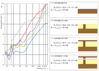 A A A Volume : 44 Part : 2 Sound.Wood.Austria - selected measurement results of building components for multi-storey timber construction in Austria Heinz Ferk 1 , Christopher Leh, Markus Mosing, Jan Kasim, Selina Vavrik-Kirchsteiger Graz University of Technology Inffeldgasse 24, 8010 Graz, Austria Bernd Nusser Holzforschung Austria Franz-Grill-Straße 7, 1030 Vienna, AustriaABSTRACT With the increasing use of wood also for multistory dwellings, a wide variety of timber construction systems have been developed in Austria, of which in particular timber post and beam construction and solid timber construction in cross-laminated timber have become established. During the Internoise 2005, the first session on sound insulation in timber construction was initiated by Jean- Luc Koiumji. At that time, I was able to present the CLT construction method and show, using the example of the first multistory CLT apartment houses in Austria, that even high sound insulation requirements can be well met. However, it also became apparent that there is still a great need for research, especially in the low-frequency range, in flanking transmission and optimization. In the last years, within the Sound.Wood.Austria research project, acoustic laboratory measurements of typical Austrian wooden building components were carried out in order to determine the effect of various design measures on sound insulation in a systematic approach and to identify possible optimization potential. Exterior walls, apartment partition walls and apartment partition ceilings were investigated, but also effects from flanking transmission. In this talk, selected measurement results are presented and discussed. However, the results pointed out, that further research work and developments, preferably internationally networked, are desirable in order to exploit the acoustic potential of timber buildings in the sense of "Green Deal"1. INTRODUCTIONThe exterior wall, the apartment partition wall and the apartment partition slab are decisive components for the sound insulation of multistory buildings. An important criterion for the selection of the structural components is the building system itself. Frequently used construction types are systems with continuous vertical partition with CLT double walls, systems with continuous ceilings, which are usually built as house-in-house systems due to the longitudinal sound insulation, i.e. with single-shell CLT partition with facing shells, floating screed and suspended ceiling, as well as typical "modular construction methods", in which individual, compact cells are stacked vertically separated from each other by means of special bearings. In the following, such components made of CLT in particular will be considered from a building acoustics point of view, which are frequently used in Austria for the first variant.1 ferk@tugraz.attt inter-ncie’” SCOTTISH evENT CAMPUS 3) O , o iLASGOW Source: H. Ferk Source: KLH GmbH Source: Arch. RiessContinuous joint „house in house system Cell ConstructionFigure 1: Examples for construction systems for CLT based multifamily houses. Austrian sound reduction legal requirements for external walls start from R w ≥ 43 dB, depending on the outside noise level. Between common rooms of multistorey apartment houses the standardized sound level difference must be at least 55 dB, between terraced houses at least 60 dB. The same is valid for separating floors, whereas the maximum standardized impact sound level must be less then 48 dB, and 43 dB for terraced houses. In the following sections, some results on exterior walls, apartment partition walls and apartment partition ceilings are discussed. 2. LABORATORY MEASUREMENTSThe measurement of the sound insulation of the individual CLT-based components was carried out on a wall and a slab test stand in the Laboratory for Building Physics at the Graz University of Technology. To investigate the effect of different installation variants, individual CLT panels were examined in different connections to the testing facility. Usually, the connection of such components consists of stuffed mineral wool and linseed oil mastic sealing on both sides. The effect of replacing the mineral wool with an impact sound insulation board, an elastomeric strip and further a mounting with wooden wedges, i.e. "clamped", was investigated. It was found that the lowest sound reduction index R w for a 100 mm thick 5-layer CLT board was 31.9 dB with the impact sound insulation board, while the highest value of 34.1 dB was achieved with the wedged-in variant. Subsequently, all further measurements on impact sound insulation board were measured "on the safe side" with the impact sound insulation board.CLTP 100 mm, 5s, with different mounting conditions707070dB ¾®dB ¾®dB ¾®606060R Sound reduction index ,R Sound reduction index ,R Sound reduction index ,505050404040303030202020TDPTTDPTTDPTgekeiltMWElastomer10101063 125 250 500 1000 2000 Hz400063 125 250 500 1000 2000 Hz400063 125 250 500 1000 2000 Hz4000Frequency, f, Hz ¾®Frequency, f, Hz ¾®Frequency, f, Hz ¾®wedged („edge fixed“) Elastomeric layer TDPT Impact soundR w (C;C tr ) = 31,9 ( -1,4 ; -4,2 ) dB R w + C tr,50-5000 = 27,0 dBR w (C;C tr ) = 34,1 ( -1,4 ; -4,2 ) dB R w + C tr,50-5000 = 28,8 dB R w (C;C tr ) = 32,9 ( -1,7 ; -4,2 ) dBinsulation layer Mineral woolR w + C tr,50-5000 = 28,1 dBR w (C;C tr ) = 32,2 ( -1,5 ; -4,3 ) dBR w + C tr,50-5000 = 27,4 dBFigure 2: Sound reduction index R w for a 100 mm thick 5-layer CLT board with differentconnection to the testing facility. 3. EXTERIOR WALLSBased on a 100 mm CLT board, a vertical batten made of KVH 58/158 was mounted directly on the CLT. The space between the battens was filled with 160 mm thick "mineral wool light", a wind brake was mounted on top of it. The measurement result of the sound insulation index R w was 46 dB. Naturally, this type of exterior wall without a protection against penetrating rain cannot be used in practic