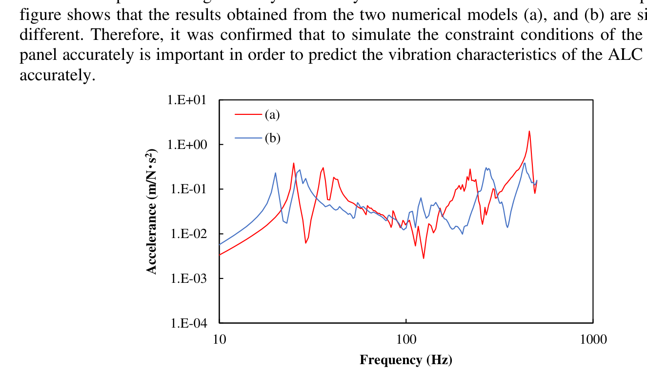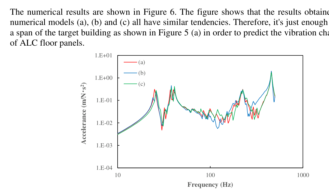 A A A Volume : 44 Part : 2 Numerical prediction method for vibration characteristics of steel- framed ALC floor structure Haruki Mizunuma 1 , Takumi Asakura 1 , Yasuhiko Ishiwatari 2 , Takayuki Shiraishi 2 , Fumiaki Satoh 3 1 Tokyo University of Science 2641 Yamazaki, Noda-shi, Chiba, 278-0022, Japan 2 CEL corporation 3-7-1 Kyobashi, Chuo-ku, Tokyo, 104-0031, Japan 3 Chiba Institute of Technology 2-17-1 Tsudanuma, Narashino-shi, Chiba, 275-0016, JapanABSTRACT The prediction of floor vibration is of great importance from the viewpoint of accurate prediction of sound environment in the room. In this paper, applicability of the finite element analysis to the vibra- tion simulation of autoclaved lightweight aerated concrete (ALC) floor structure on a steel-framed structure was verified. The results of a numerical case study has confirmed that the numerical cou- pling scheme of the ALC floor panels and the steel-framed structure had a significant effect on the simulated vibration characteristics of the ALC floor panels. Then, validity of the proposed method was finally confirmed by comparison with the measurement results. 1. INTRODUCTIONIn recent years, there has been growing interest in sonic environmental performance in building against a background of increased of staying time. Various studies have been reported on prediction methods for heavy weight floor impact sound insulation performance for reinforced concrete build- ings, but there are limited studies for steel-framed buildings. Examples of study on prediction meth- ods for heavy weight floor impact sound insulation performance of steel-framed buildings so far re- ported include the application of a finite element vibration analysis method for reinforced concrete buildings to steel-framed buildings [1], and the application of a coupled displacement in-plane and out-plane for deck plate slabs [2], but further studies are needed to improve the accuracy of the sim- ulation and expand the range of application.In this paper, measurements were carried out on the vibration of ALC floor panels in a steel-framed building, and the modelling method of the finite element analysis was investigated for steel-framed building with ALC floor panels. Then, the proposed method was finally verified by comparison with the measurement results and the numerical results.2. MEASUREMENTFor a span of the target building of measurement, ALC distribution setup showing measurement points and beam plan are shown in Figure 1. The target building of measurements is a three-story steel-framed building. The target floor of the measurements is a span of the second floor. The con- struction of the building was completed only frame when the measurements were carried. The floors consisted of ALC floor panels that have a thickness of 100 mm.worm 2022 (b)(a)E’ 51365 1365 455 4551365 1820E’ 0D 5D 0ColumnPillarUnit : mm31852730 455Unit : mmFigure 1: (a) ALC distribution setup showing measurement points, and (b) Beam plan 3. CASE STUDIESPreparatory to generate a numerical model for a comparison with measurement results, some case studies were carried out.worm 20223.1. Effect of the Cross-sectional Shape of BeamsIn order to predict floor vibration in steel-framed buildings, the treatment of H-shaped beams, which are unique to steel construction, is an important point of the simulation. Therefore, the effect of beam cross-sectional shape was carried out by comparing the numerical results obtained from the two types of numerical models differing only in cross-sectional shape. The software used for simulations in this paper was SIMCENTER 3D from Siemense and direct frequency response analysis was carried out using FEM. The dimensions of the beams used in the case study are shown in Table 1.Table 1: Beam dimensionsThe numerical results are shown in Figure 2. The figure confirmed that the vibration characteristics of the ALC floor panels are significantly affected by the cross-sectional shape of the beams. Even when the second moment of area were equal, the vibration characteristics differed significantly when there were differences in the cross-sectional shape of beam. Therefore, it was confirmed that to sim- ulate the cross-sectional shape of the beam accurately is important in order to accurately predict the floor vibration of the steel-framed building. 1.E+01Beam 1worm 2022Beam 21.E+00Accelerance (m/N s 2 )1.E-011.E-021.E-031.E-0410 100 1000Frequency (Hz)Figure 2: Effect of cross-sectional shape of beam3.2. Effect of Constraint Conditions of ALC floor panels.The target building of measurement was constructed by dry construction method and ALC floor panels were fixed to beams at two points by mounting parts as shown in figure 3 (b). In order to accurately predict the vibration characteristics of ALC floor panels, it is considered to be important to accurately simulate the restraint conditions of ALC floor panels. Therefore, the effect of the re- straint conditions of ALC floor panels on the vibration characteristics was carried out. A numerical model (a), the ALC floor panels were directly fixed to the beams. In contrast, the other numerical model (b), the ALC floor panels were fixed to the beams by mounting parts. The numerical model of joint parts between the ALC floor panels and beams are shown in Figure 3.(a) (b)General view of back side of the numerical modelFigure 3: The numerical model of joint parts between the ALC floor panels and beams (a), the ALC floor panels were directly fixed to the beams and, (b) the ALC floor panels were fixed to the beams by mounting part The numerical results are shown in Figure 4. The figure confirms that the vibration characteristics of ALC floor panels are significantly affected by the constraint conditions of ALC floor panels. This figure shows that the results obtained from the two numerical models (a), and (b) are significantly different. Therefore, it was confirmed that to simulate the constraint conditions of the ALC floor panel acc