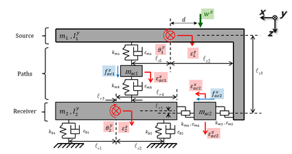 A A A Volume : 44 Part : 2 Multi-directional active vibration control of 1D smart structure inspired by automotive engine mounting system Hojoon Moon 1 Yeungnam University 280 Daehak-Ro, Gyeongsan, Gyeongbuk 38541, Republic of Korea Yang Qiu 2 Yeungnam University 280 Daehak-Ro, Gyeongsan, Gyeongbuk 38541, Republic of Korea Byeongil Kim 3Yeungnam University 280 Daehak-Ro, Gyeongsan, Gyeongbuk 38541, Republic of KoreaABSTRACT Recently, active mounting system is being gradually applied to automotive engine mounts for mitigating structure-borne vibration effectively throughout the whole vehicle chassis. This paper presents modeling, analysis, and control of a source structure with an active mounting system in multi-directions, considering position and direction of actual automotive engine mounts. The active mount consists of a piezoelectric stack actuator in series with an elastomeric(rubber) mount. When harmonic excitation forces are employed, secondary force required for each active mount is calculated mathematically and the control signal can reduce the vibration through the destructive interference with input signal. In addition, the horizontal vibration can also be mitigated by setting a variable parameter through the dynamic relation of source structure. A series of simulation results demonstrate that the excitation vibration could be reduced along with this multi- directional(vertical and horizontal) active mounts. Based on this result, it can be expected that noise vibration harshness(NVH) performance can be improved by controlling the vibration of the actual automotive engine structure with rubber mount and secondary force of actuators in both vertical and horizontal directions.1. INTRODUCTIONNowadays, automobile development places importance on lightweight structure, high engine efficiency, and ride comfort. Therefore, research on an engine mounting system that supports the powertrain and insulates the excitation force transmitted to the vehicle chassis is becoming important. Most vehicles are fitted with passive mounts (rubber or hydraulic). However, the rubber1 answns5@naver.com2 positive0919@ynu.ac.kr3 bikim@yu.ac.kr mounts cannot mitigate vibration due to increased dynamic stiffness in the high frequency domain, and hydraulic mounts cannot mitigate vibration in the high frequency domain, although vibration is exceptionally mitigated at the notch frequency. To solve this problem, research on semi-active and active mounts is being conducted.Li Sui et al. [1] showed that the use of a PZT actuator as a vehicle engine mount reduces vibration due to engine excitation (low frequency-low amplitude) at engine idle and vibration due to engine excitation (high frequency-low amplitude) during driving by 80%.Liette et al. [2] conducted a study to reduce vibration using two active paths composed of a piezo stack actuator and a rubber mount, and to quantify the interaction between the dynamic characteristics of the passive system and the active path. Based on the 6DOF model of the beam structure, vibration isolation was verified through simulations and experiments. Hong et al. [3] designed a 9-DOF model of the plate structure to consider the effect of rotational displacement in addition to previous studies, and performed realistic simulations as a result.Although research on such an engine mount continues, unlike an actual engine mount, only an actuator that connects the engine and the chassis vertically is in progress. Therefore, in this study, the effect of vibration mitigation in the vertical and horizontal directions using vertical and horizontal actuators for the engine and chassis was investigated. To connect the source and receiver in the horizontal direction, the source structure is designed as a beam structure bent in an 'L' shape. Therefore, this article does the following: 1) A lumped parameter model is proposed for the given structure and equations of motion are established. And 2) Performing simulations and analyze the results to propose how to improve the vehicle’s NVH performance2. Modeling and Control force2.1. Lumped parameter modelThe model of source-path-receiver system considering actual automotive engine mounts was established based on the lumped parameter model, as shown in Figure.1Figure 1: Source-paths-receiver modeling In Figure 1, source means vehicle engine, path means active mounts that consists of a piezoelectric actuator and a rubber mount, and receiver means the sub-frame. 𝑚 𝑖 means mass of beam, 𝑚 𝑎𝑐𝑖 means mass of piezoelectric stack actuator, 𝐼 𝑖𝑦 means moment of inertia in y axis. 𝑙 𝑠𝑖 means length from center of gravity at source, 𝑙 𝑟𝑖 means length from center of gravity at receiver. 𝑑 means the length from center of gravity of source to the external force. 𝜀 𝑖𝑧 , 𝜀 𝑎𝑐𝑖𝑧 mean the vertical motion of the beam and actuator. 𝜀 𝑎𝑐2𝑦 means the rotational motions of beam. 𝑘 𝑚𝑖 , 𝑐 𝑚𝑖 means stiffness and damping values between beam and actuator. 𝑘 𝑏𝑖 , 𝑐 𝑏𝑖 means stiffness and damping values between beam and ground. 𝑓 𝑎𝑐1𝑥 means the horizontal motion of actuator2. 𝜃 𝑖𝑥 means control force from each actuators. 𝑊 𝑧 means external force. All of the above parameters are determined based on the data measured by the experiment. This model can be expressed motion equation using Newton’s 2 nd law.𝑧 , 𝑓 𝑎𝑐2𝑀𝑞̈(𝑡) + 𝐶𝑞̇(𝑡) + 𝐾𝑞(𝑡) = 𝑊(𝑡) + 𝐹(𝑡) , (1) In equation (1), M, K, C are mass, damping, stiffness matrix and 𝑞(𝑡), 𝑊(𝑡), 𝐹(𝑡) are displacement, external force, control force vector. It is assumed that displacement exists in the x-direction and z- direction, and rotational motion exists in the y-direction. Thus, overall model has five translational motions and two rotational motions, indicating that it is a 7 DOF system.𝑦 𝐼 2𝑦 ]) (2)𝑀= 𝑑