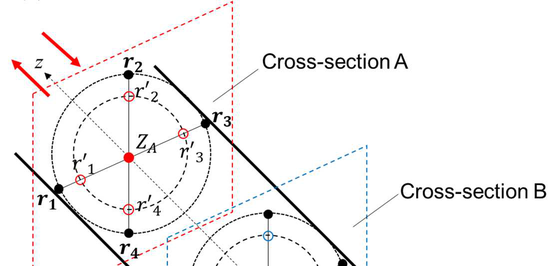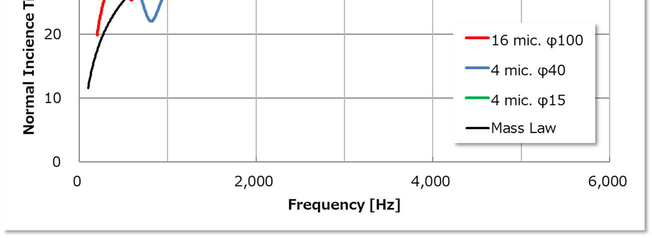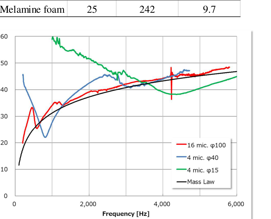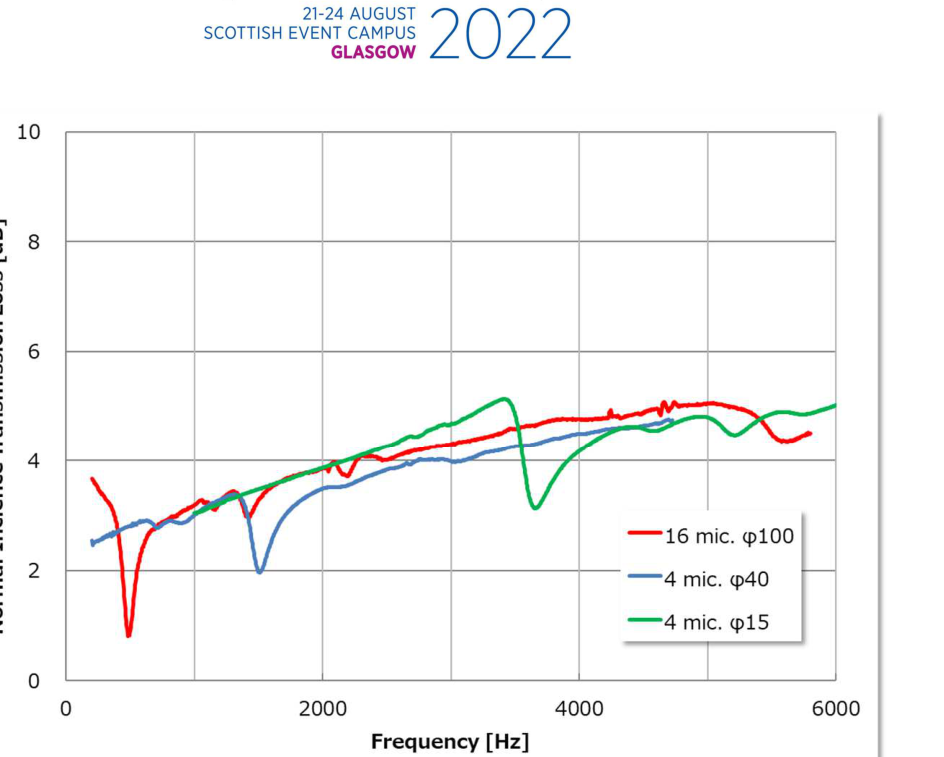 A A A Volume : 44 Part : 2 Extension of frequency range of the sixteen-microphone method in normal-incidence sound transmission loss measurement Hiroshi Nakagawa 1 Nihon Onkyo Engineering Co., Ltd. 1–21–10 Midori, Sumida-ku, Tokyo, 130–0021 Japan Akira Sanada 2 Industrial Technology Center of Okayama Prefecture 5301 Haga, Kita-ku, Okayama, 701–1296 Japan ABSTRACT This study deals with development of a high-frequency measurement method of normal incidence sound transmission loss using acoustic impedance tube. On ordinary transfer-function method, meas- urable frequency of the method is limited by the diameter of the tube. Authors have developed eight microphone method to measure normal incidence absorption coefficient. This technique lays 4 mi- crophones on the same cross section and cancels rotational acoustic modes. This makes it possible to measure normal incidence absorption coefficient up to three times the upper frequency of the or- dinary two microphone method. In this study, authors apply the same technique to normal incidence transmission loss measurement using 16 microphones. 1. INTRODUCTION• Normal-incidence sound absorption coefficient [1] and normal-incidence transmission loss [2] measurements using acoustic impedance tubes are widely used to evaluate the sound absorption and insulation properties of porous materials and to validate analytical models, because these measurements can be made with a smaller sample size and in a shorter time with simpler opera- tions than measurements using reverberation rooms. However, conventional measurements using acoustic impedance tubes assume a plane wave sound field, so the upper frequency limit depends on the inner diameter of the tube. Therefore, to measure higher frequencies, measurements must be made with smaller tubes, which requires smaller samples. This causes variations due to cutout areas caused by material inhomogeneity, variations in measurement results due to cutout accu- racy, and the effects of constraint conditions when setting the material in the tube. To make meas- urements at higher frequencies, Schultz et al. [3] have tried to use modal decomposition, but this is a complicated procedure. Therefore, Sanada [4-6] proposed an eight-microphone measurement method that can easily extract only the normal component, enabling measurement of normal in- cidence sound absorption coefficients up to frequencies almost three times higher than those of conventional methods. In this paper, the eight-microphone method applied by Sanada for sound1 hiroshi_nakagawa@hibino.co.jp2 akira_sanada@pref.okayama.lg.jpinter.noise. 21-24 AUGUST SCOTTISH EVENT CAMPUS ? O? ? GLASGOW absorption coefficient measurements is extended and applied to transmission loss measurements with sixteen microphones. 2. THEORY2.1. Sound Field in cylindrical Tube In this paper, we consider a cylindrical tube with radius R [m] (Figure 1). The sound field is ex- pressed by Equation (1):inter.noise. 21-24 AUGUST SCOTTISH EVENT CAMPUS ? O? ? GLASGOWFigure 1: Sound field in the tube.sectionA _ Cross -section B Cross: , , , Ψ , , , (1) # , , ! Ψ ## , !$ %&, , is the distance from the center of the cylindrical cross section, θ is the angle from x-axis and Ψ , , Ψ # , are the functions representing acoustic modes in the cross section of the tube and are expressed by Equations (2) and (3):, , ' , ( ) *, ! + (2)Ψ , , ' , ( ) *, ! + (3)Ψ # m and n are the orders of the acoustic modes in the cross section in the circumferential and radial directions, respectively; ( is the Bessel function of the first kind, and ' , is the normalization constant that satisfies the orthogonality of equations (4) and (5) among the acoustic modes:⬚ Ψ #∗2 3 4, 5 , 6 7 (4), Ψ ./1⬚ Ψ #∗0 3 9 4 : 5 9 : 6 9 7 (5), Ψ ./1where S is the cross-sectional area of the cylindrical tube; , , # , and # are the amplitudes of the waves of the (m, n) mode; ) , is the wave number of the (m,n) mode in thez-direction, expressed as ) , ) ; < ) *, ; ! = ; > , where ) = ω @ > ( @ : sound speed), and ) *, is the wave number in the cross-section of the cylindrical tube, which satisfies the bound- ary condition at the inner surface of the tube. ) *, A that satisfying the boundary condition is denoted as B , . The value of B , as shown in Figure 2. The (0,0) mode represents a plane wave propagating along the z-axis, and the other higher-order modes represent sound waves prop- agating obliquely to the z-axis. The obliquely propagating waves for which ) C ) *, cannot propagate in the tube because the wave number becomes purely imaginary and the wave becomes evanescent. Therefore, the minimum frequency at which the 5, 6 mode can propagate is:inter.noise. 21-24 AUGUST SCOTTISH EVENT CAMPUS ? O? ? GLASGOWF , GD E,;HI (6)which is the so-called cut-on frequency of the mode. In the conventional standard transfer func- tion method, measurement is conducted under conditions where only the 0,0 mode can propagate in the tube. Thus, the upper frequency limit is less than the frequency below the (1, 0) mode. For example, for a 100 mm diameter tube, the theoretical upper measurement frequency is D E=, = 2013 [Hz] at temperature 20 °C.Figure 2: Acoustic mode in the cross-section of the tube.2.2. 8 Microphone Method for Absorption Coefficient Measurement Sanada [4-5] showed that three circumferential modes of a cylindrical tube, (1,0), (2,0), and (3,0), can be canceled by placing microphones at four locations at 90-degree intervals on the same cross section and obtaining the sum of their sound pressure, as in Equation (7):" OCS8®e@ Aonn) =O — ann) = 1:84 Ramm) = 3.05 Amn) = 4.20 Amn) = 5:32 enn) = 3:83 Aomn) =5:33 Aum) = 6.71 ann) 8.02 Amn) = 9.28 J K L MN L MO L MP L MQ 4 S S ! %& (7)• Furthermore, it was shown that by placing the microphone not on the wall of the acoustic tube but at the node of the (0,1) mode in the radial direction, the (0,1) mode is no longer detected, so that only sound waves propagating