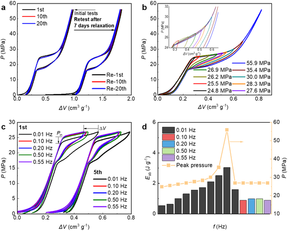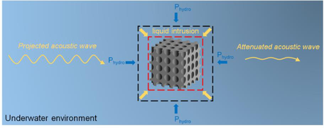 A A A Volume : 44 Part : 2 Nanofluidic Attenuation of Metal-Organic Frameworks Heting Xiao University of Birmingham School of Engineering, University of Birmingham, Edgbaston, Birmingham, B15 2TT, UK Central South University School of Traffic & Transportation Engineering, Central South University, Changsha, Hunan, 410075, P.R. China Hebin Jiang University of Birmingham School of Engineering, University of Birmingham, Edgbaston, Birmingham, B15 2TT, UK Haixia Yin University of Birmingham School of Engineering, University of Birmingham, Edgbaston, Birmingham, B15 2TT, UK Yueting Sun 1 University of Birmingham School of Engineering, University of Birmingham, Edgbaston, Birmingham, B15 2TT, UKABSTRACTPorous materials with energy absorption characteristics have been used for attenuation against haz- ardous vibrations and noises. The intrusion of liquid water and aqueous solutions into hydrophobic nanoporous materials such as metal-organic frameworks (MOFs) present an attractive pathway to engineering new attenuation technologies. In this process, hydrostatic pressure forces water to in- trude hydrophobic nanopores, thereby converting mechanical work into interfacial energy through nanoscale interfacial interactions. Once the external pressure is removed, water molecules can flow out of the nanopores spontaneously, making the system reversible. We envision that this mechanism has the potential of innovating attenuation technologies, so in this work we provide a preliminary study in this direction. We investigate a material system consisting of water and a commonly used MOF, zeolitic imidazolate framework-8 (ZIF-8) and demonstrate its reversibility and stability under cyclic pressurization, considering its performance at various peak pressures and frequencies, its tunability in terms of intrusion pressure, and its potential in hydrogel forms. These features are im- portant for potential attenuation technologies based on this novel mechanism.1 y.sun.9@bham.ac.ukworm 2022 1. INTRODUCTIONAcoustic attenuation using porous materials has been studied for decades [1-5].They have low density, large surface area, and good energy absorption properties [6]. Different from resonance sound absorption materials which dissipate energy through structure resonance [7-10], porous mate- rials can work within a broader range of frequencies [8, 11] as the fluid inside porous structures involves a variety of energy absorption process such as structure vibration, solid-fluid friction, vis- cous fluid flow, heat exchange, etc [12, 13]. Traditional soundproof porous materials include organic or inorganic fibers and foams: organic fibers such as cotton and wood are effective at medium and high frequencies (>500 Hz) but have concerns around fireproofing or corrosion resistance [14]; inor- ganic fibers such as rockwool and glass wool are mothproof, anti-corrosion, and noncombustible but are fragile [15]; polymer foams are light-weight and heat-insulated but unsatisfactory in anti-aging and fireproofing performances [16]; ceramic foams are resistant to high temperature but is heavy and brittle [17]; metal fibers and foams are with good mechanical property and chemical stability but their pore size and shape are not easy to control in manufacturing [18]. There have been encouraging de- velopment of sound-absorbing metamaterials in the past two decades [19-24] and some of them can work well at low frequencies (<500 Hz) but far from mass production [25]. More research is needed to develop new acoustic attenuation materials and mechanisms.MOFs are a class of hybrid nanoporous materials composed of metal ions and organic linkers, well-known for their ultra-high surface areas (1,000–10,000 m 2 g −1 ) as well as highly tunable frame- work architectures and chemical compositions. MOFs have been used in the fields of gas separation or absorption [26, 27], catalysis [28], drug delivery [29], energy absorption [30], but recently also emerging as a candidate for attenuation applications. Miller et al [31]. demonstrated that HKUST-1, FeBTC, and MIL-53(Al) are absorptive acoustic metamaterials for low-frequency attenuations. The acoustic absorption of fabrics can be improved by MIL-53(Fe) coating [32] which proves to be a better choice than polymers [33], metal particles [34], or microcapsules [35]. Similarly, the absorption of cotton textiles can also be improved by coating with ZIFs ( e.g.. , ZIF-8, ZIF-67, ZIF-71) [36]. These results demonstrated the great potential of MOFs and their composites in acoustic attenuation.In this work, we look at a new attenuation mechanism of MOFs, which is based on the pressurized liquid intrusion of hydrophobic MOF nanopores. This intrusion process has been shown to have good energy absorbing abilities [30, 37, 38]. Since the pore size of MOFs is at the nanoscale, comparable to the size of water molecules, during this water intrusion process, the bulk waters must split into water molecules to be able to enter and flow inside the MOF nanopores, therefore a substantial amount of energy can be absorbed. We envision that this process can enable acoustic attenuation in underwater environment, which has been a challenge for both traditional porous materials and acous- tic meta-materials [6, 25]. In an underwater environment shown in Scheme 1, the liquid intrusion and energy absorption process can be triggered by a combination of hydrostatic pressure and acoustic pressure, i.e. , the local pressure deviation from the ambient [13]. Water is abundant but not a good material for accoustic attenuation, its attenuation coefficient is close to zero [39]. However the nanoporous intrusion process may enable water to attenuate acoustic waves and address technical challenges for underwater and medical applications [40]. To this end, we carried out preliminary experiments on a MOF material called ZIF-8. We investigated its cyclic water intrusion process under different peak pressures and frequencies and its perform