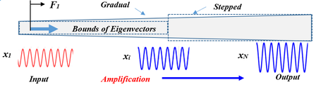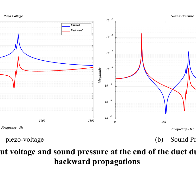 A A A Volume : 44 Part : 2 A piezoelectric-nonreciprocal metamaterial with shaped eigenvectors using shunted piezo-networks Han Zhou 1 University of Maryland Mechanical Engineering Department, College Park, MD 20742 Amr Baz 2 University of Maryland Mechanical Engineering Department, College Park, MD 20742ABSTRACT This paper presents a class of passive nonreciprocal metamaterials (PNMM) which are designed to control the flow of acoustic waves along a one-dimensional periodic acoustic duct. The proposed PNMM consists of a multi-cell array of acoustic cavities which are provided with piezoelectric boundaries. These boundaries are connected to an optimally designed array of shunted inductive networks in order to spatially shape the eigenvectors of the array in such a manner that breaks the reciprocity of the acoustic duct. This approach distinguishes itself from other approaches where non-reciprocities are controlled either actively or passively by various means such as sources of nonlinearities, circulators and gyroscopic/gyrator components, and/or spatio-temporal modulation.A finite element model (FEM) is developed to analyze and predict the dynamic characteristics and behavior of the proposed PNMM for various shunting strategies and distributions of the networks. The predictions of the FEM are validated experimentally using a five-cell array which are provided with electronically synthesized inductances to enable significant tailoring of the eigenvectors of the PNMM.The obtained results indicate significant breaking of the non-reciprocity when the characteristics of the PNMM are determined during forward and backward wave propagations. The theory governing the operation of this proposed approach is introduced and a comprehensive experimental validation effort is presented to demonstrate the basic features and non-reciprocal behavior. Generalization of the presented strategies to two dimensional acoustic systems is a natural extension of the present work.1. INTRODUCTIONRecently, a considerable interest has been focused on the development of various classes of non-reciprocal metamaterials that aim at controlling the spatial distribution of the flow of acoustic energy through these metamaterials. The development of such non-reciprocal behavior is achieved either via simple passive means or more sophisticated active control approaches. Among the1 zhouhan@umd.edu 2 baz@umd.edua Shea mar ce 21-24 AUGUST SCOTTISH BENT caso commonly adopted approaches are those utilizing sources of nonlinearity [1-2], gyroscopic components [3-5], spatiotemporal modulation approaches [6-8], as well as other innovative concepts [9-10]. The basic physical concepts, the realization approaches, and the associated characteristics of these non-reciprocal systems are outlined, in a comparative manner, by Fleury et al . [11] and Nassar et al . [12].In this paper, the goal is to build on the work of Baz [13-14] and Zhou and Baz [15] which has laid the foundation for the development of the novel approach of actively shaping the eigenstructure of the metamaterial in an attempt to spatially altering and controlling the acoustic energy flow along a special class of non-reciprocal metamaterial. With that approach, it has been demonstrated that it is possible to achieve desirable and reversable non-reciprocal patterns in a programmable manner.In the present paper, the emphasis is placed on passively shaping the mode shapes of the metamaterials using arrays of shunted piezo-networks in order to break the reciprocity. The developed “ Passive Non-reciprocal MetaMaterial ” ( PNMM ) is investigated theoretically and experimentally in a comprehensive manner. A finite element model ( FEM ) is developed to analyze and predict the dynamic characteristics and behavior of the proposed PNMM for various shunting strategies and distributions of shunting networks. The predictions of the FEM are validated experimentally using a five-cell array consisting of acoustic cavities provided with piezoelectric boundaries. In the experimental model, the inductances are synthesized electronically to enable significant tailoring of the eigenvectors of the PNMM .This paper is organized in five sections. In section 1, a brief introduction of the passive and active control approaches of non-reciprocity is presented and the concept of the active nonreciprocal metamaterials with shaped eigen-vectors is outlined in Section 2. A finite element model of the metamaterial with shunted inductors is presented in Section 3 along with the theoretical predictions of the behavior of this class of metamaterials. Section 4 presents the experimental validation of the proposed concept of PNMM as a viable means for breaking the reciprocity in acoustic systems. Finally, Section 5 summarizes the conclusions and possible recommendations for future studies.2. CONCEPT OF METAMATERIAL WITH SHAPED EIGENVECTORSIn this section, the concept of the proposed passive nonreciprocal metamaterial ( PNMM ) configuration consisting of an array of periodic system which consist of N cells that are provided with array of shunted inductances as shown in Figure 1. The inductances being the electrical analogs to mechanical masses effectively load the nodes to which they are connected to. Such loading alters the eigenvectors of the acoustic duct and thereby enabling the spatial control of the acoustic energy flow along the metamaterial to achieve any desirable non-reciprocal characteristics.Figure 1: The metamaterial with shaped eigenvectors using shunted piezo-networksIn Figure 2a, the metamaterial is arranged in a 1 D periodic configurations. This configuration has, in its reciprocal form, the bounds of the open-loop eigenvectors as displayed in Figure 2b. As these bounds for the original system are constant, then the system exhibits the well-known reciprocal behavior. But, as these bounds are altered and shaped as shown in Figure 2c, the wave propagation along the forward direction can be ampl
