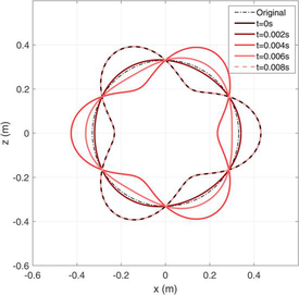 A A A Volume : 44 Part : 2 An in-plane flexible ring model for the analysis of the free and forced response of a rolling tyre Ivano La Paglia 1 Politecnico di Milano Department of Mechanical Engineering, Via La Masa 1, Milan 20156, Italy Luca Rapino 2 Politecnico di Milano Department of Mechanical Engineering, Via La Masa 1, Milan 20156, Italy Francesco Ripamonti 3 Politecnico di Milano Department of Mechanical Engineering, Via La Masa 1, Milan 20156, Italy Roberto Corradi 4 Politecnico di Milano Department of Mechanical Engineering, Via La Masa 1, Milan 20156, Italy Simone Baro 5 Pirelli Tyres S.p.A. Viale Piero e Alberto Pirelli 25, Milan 20156, ItalyABSTRACTThe increased demand for vibroacoustic comfort as well as regulations on noise and vibration levels made the NVH performances of a vehicle one of the fundamental design criteria. Therefore, predictive models for the analysis of noise and vibration transmission mechanisms represent interesting tools to support the R&D department of the automotive companies.Focusing the attention on passenger’s comfort, the vibrations induced by the tyre/road interaction propagate from the contact area to the hub and finally inside the cockpit through structure-borne transmission paths. This can be regarded as one of the major contributors to car cabin interior noise at low frequencies (20-500 Hz).Simplified models able to interpret the waves propagating inside the tyre structure and influenced by the angular speed may support the studies in this research field. To this end, an analytical model based on the theory of the flexible ring on elastic foundation was developed. It allows analysing the tyre dynamics in both static and rotating conditions. Model parameters were calibrated based on an Experimental Modal Analysis of the static tyre. The free response of the tyre1 ivano.lapaglia@polimi.it 2 luca.rapino@ polimi.it 3 francesco.ripamonti@ polimi.it 4 roberto.corradi@ polimi.it 5 simone.baro@pirelli.com shows the bifurcation effect at different rotating speeds, while a cleat test simulation allows investigating the forced response of the tyre.1. INTRODUCTIONThe NVH (Noise, Vibration, Harshness) performances of a vehicle are nowadays one of the fundamental design criteria due to the increased demand for vibroacoustic comfort. Both experimental and numerical investigations can be considered to address airborne and structure- borne noise [1,2].Predictive models for the analysis of noise and vibration transmission mechanisms represent interesting tools. In this regard, structure-borne transmission path can be identified as the major contributor to the car cabin interior noise at the low frequency (up to 500 Hz). The most promising strategy to reduce its influence consists in acting directly on the source [3,4]. To this end, the R&D department of the automotive companies have been involved in the design of several predictive models [5-8], that can be grouped into Finite Element Models (FEM) and analytical ones. The former is typically adopted in case highly accurate results are required. Examples of FEM models adopted to study the free response of a rolling tyre are provided in [9,10]. However, although they provide a lower degree of complexity and consequently of accuracy, analytical model may provide useful guidelines to interpret the physics of the phenomena involved in the tyre dynamics. Moreover, being model complexity reduced, they are generally fast to execute. In this regard, different analytical models have been proposed in the literature, to analyse the case of a thin rotating ring [11-15]. These studies have been adapted to the specific field of interest, such as tyre dynamics [8,16-18].In this paper, an analytical model of a flexible ring is proposed, aimed at reproducing the in- plane vibration of a tyre, in both static and rotating conditions (at constant speed). Differently from other previous work, the nonlinear equations of motions are derived at first to better account for the peculiarities of a tyre (such as the pretensioning of the ring due to the inflation pressure and centrifugal loads). Attention is paid to the bifurcation effect of the natural frequencies, which governs the rotating case. Model parameters have been tuned based on an Experimental Modal Analysis of a static tyre, and then adopted to simulate the tyre free and forced response.2. THE IN-PLANE FLEXIBLE RING MODELTo investigate the dynamics of a rotating tyre, an in-plane model based on the theory of the flexible ring on an elastic foundation is proposed, showed in Figure 1.Figure 1: Model of the thin flexible ring on elastic foundation. Coordinates adopted, reference systems and model parameters.The physical system is composed of the tread, the sidewalls, and the wheel. From a modelling point of view, the first component is treated as a circular, thin flexible ring made of homogenous isotropic material. The ring is described by a mean radius a and a thickness h , and by an axial and bending stiffness ( 𝐾 and 𝐷 respectively). The wheel is introduced as an infinitely rigid and symmetric component with mass and inertia moment. The tread and the wheel are linked by theDy @) sidewalls, modelled as a massless elastic foundation composed by radial and circumferential springs ( 𝑘 𝑟 and 𝑘 𝜃 ) distributed along the ring circumference. To account for the tyre rotation, the angular speed Ω is considered. Two reference systems are shown in Figure 1: the absolute reference frame (fixed) is reported as black lines (x*-z*), while the green one (x-z) represents a frame rotating at the same speed Ω of the tyre.The independent coordinates of the system are highlighted in red. The modelling strategy adopted leads to the introduction of and infinite number of degrees of freedom (DOFs) for the flexible ring. In addition, three DOFs are also considered, accounting for the displacements and rotation of the wheel. As a result, two Partial Differential Equations (PDE) desc