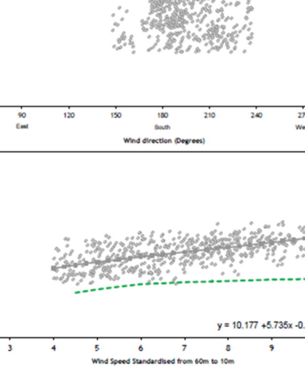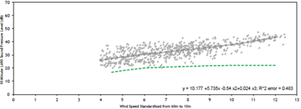 A A A Volume : 44 Part : 2 Techniques to establish accurate background noise levels in areas affected by operational wind turbine noise Jason Baldwin 1 TNEI Unit S12, Synergy Centre, TU Dublin Tallaght Campus, Tallaght, Ireland, D24 A386 Alex Dell 2 TNEI 7th Floor, West One, Forth Banks, Newcastle Upon Tyne, England, NE1 3PA James Mackay 3 TNEI 7th Floor, West One, Forth Banks, Newcastle Upon Tyne, England, NE1 3PA ABSTRACT During the planning process for an onshore wind farm, the establishment of accurate background noise levels at nearby noise sensitive receptors is vital in determining the allowable noise limits at these locations. This is typically achieved through background noise monitoring at a selection of representative noise sensitive receptors. As onshore windfarms have become more prevalent, areas suitable for wind farm development are increasingly within the vicinity of operational wind farms. The result of this is background noise monitoring at receptors is now often influenced by nearby operational wind farms and is not a true representation of the unaffected noise levels at these locations. Current good UK practice (as set out in the Institute of Acoustics document ‘A good practice guide to the application of ETSU-R-97 for the assessment and rating of wind turbine noise’) proposes a number of solutions to account for this additional wind farm noise. One solution is to consider directional filtering or the subtraction of the predicted noise levels from the measured baseline data. Whilst both approaches are valid, it can often be unclear which approach is most appropriate for a particular scenario. Within this paper, the limitations of current good practice are discussed, and an alternative methodology is proposed which combines both approaches to establish the unaffected background noise levels. An example of where this alternative approach has been used are presented within the paper as validation .1 jason.baldwin@tneigroup.com2 alex.dell@tneigroup.com3 james.mackay@tneigroup.comae 2022 1. INTRODUCTION1.1. Wind farm noise guidance In the UK and Ireland, wind farm noise limits are set relative to background noise levels. Noise limits are set 5 dB above the average prevailing background noise level (measured using the L A90 10 min descriptor) subject to fixed minimum limits which apply when background noise levels are low. In the UK the relevant guidance is set out in ETSU-R-97 ‘The assessment and rating of noise from wind farms’ (ETSU-R-97) [1] which is supplemented by ‘A good practice guide to the application of ETSU-R-97 for the assessment of wind turbine noise’ published by the Institute of Acoustics (IOA GPG) [2]. In Ireland the relevant guidance is set out in the ‘Wind Energy Development Guidelines’ published in 2006 by the Department for Housing (WEDG) [3]. All three guidance documents make it clear that background noise levels should be established in absence of turbine noise. ETSU-R-97 details that “It is clearly unreasonable to suggest that, because a wind farm has been constructed in the vicinity in the past which resulted in increased noise levels at some properties, the residents of those properties are now able to tolerate higher noise levels still. The existing wind farm should not be considered as part of the prevailing background noise” , whilst the WEDG states that “Any existing turbines should not be considered as part of the prevailing background noise.”1.2. Consideration of operational turbines Since ETSU-R-97 and the WEDG were published (in 1996 and 2006 respectively) the number of operational wind turbines has increased significantly. Data produced by RenewableUK [4] and Wind Energy Ireland [5] suggest there are now 300 operational wind farms in Ireland and 1500 in the UK. The proliferation of operational wind farms, combined with a tendency for wind farms to cluster together in areas that are technically and environmental suitable for such developments, means that it is increasingly common for background noise measurements to be taken at locations which are potentially influenced by operational wind turbine noise levels. In 2013, the IOA GPG provided some additional guidance setting out four methods which can be used to derive appropriate background noise levels in the presence of operational wind turbines: 1) “switching off the existing wind farm during the background noise level survey (with associated significant cost implications)” 2) “accounting for the contribution of the existing wind farm in the measurement data e.g. directional filtering (only including background data when it is not influenced by the existing turbines e.g. upwind of the receptor, but mindful of other extraneous noise sources e.g. motorways) or subtracting a prediction of noise from the existing wind farm from the measured noise levels” 3) “utilising an agreed proxy location removed from the area acoustically affected by the existing wind farm/s” orae 2022 4) “utilising background noise level data as presented within the Environmental Statement/s for the original wind farm/s (the suitability of the background noise level data should be established).” Whilst all four methods can and are used, this paper focuses on the third option, specifically the inclusion of the word ‘or’. The text as written implies that assessments should consider the use of a directional filter or the use of subtraction; this paper considers the strengths and weakness of the two approaches and explores whether both options can be combined. 1.3. Data This paper presents analysis of measurements undertaken by TNEI proximate to an operational wind farm. All data has been collected and analysed in accordance with the guidance set out in ETSU-R- 97 and the IOA GPG. Average 10 minute wind speed data was measured at wind turbine hub height and standardised to 10 m height using a roughness length of 0.05 m as recommended in the IOA GPG. Noise levels were measured as 1