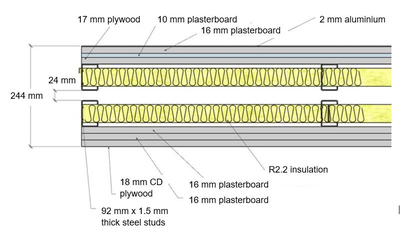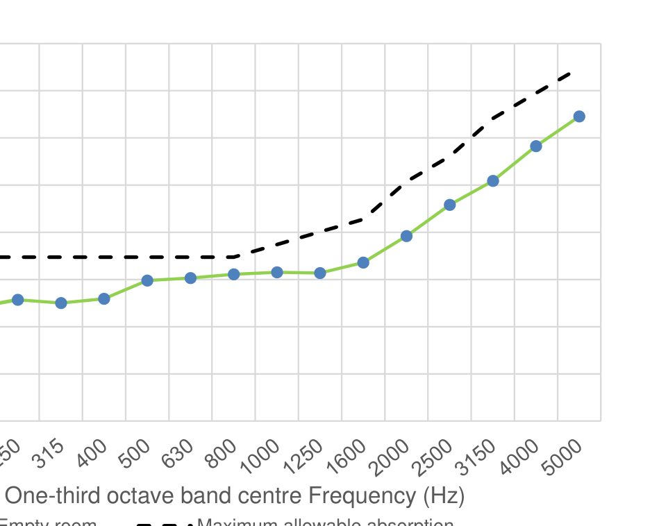 A A A Volume : 44 Part : 2 Design, construction and commissioning of a reverberation room John Pearse 1 University of Canterbury Department of Mechanical Engineering Private Bag 4800 Christchurch New Zealand Aaron Healy University of Canterbury Department of Mechanical Engineering Private Bag 4800 Christchurch New ZealandABSTRACT In this paper we discuss the design, construction and commissioning of a reverberation room that meets the requirements of ISO 354:2003. The new room was built using lightweight double walls rather than the more usual monolithic construction. We present an analysis of measurements made during the commissioning of the room and discuss these results; these measurements include the effect of adding various diffusing elements, lighting and heating. We made measurements of the sound absorption coefficient of different materials in the commissioned room and these are compared with measurements of the same materials in two other reverberation rooms that also comply with the requirements of ISO 354:2003.1. INTRODUCTIONIn this paper we discuss the design, construction and recent commissioning of a reverberation room that meets the requirements of ISO 354:2003. Product testing, product development work, teaching and research will be carried out using the new room.2. DESIGNISO 354:2003 describes the volume and shape requirements for a reverberation room. A design with parallel walls and with the roof parallel to the floor was chosen in order to provide known modes and ease of construction – contrary to the guidelines in the committee draft version of ISO 354:2019(E). A room volume of 221 m3 was selected with a length of 7.7 m, a width of 6.1 m and a height of 4.7 m.1 john.pearse@canterbury.ac.nz 3. CONSTRUCTIONThe room was constructed within an existing building that had a concrete floor. The concrete floor was cleaned and a 75mm thick concrete slab was poured over it and finished with an epoxy paint to provide a hard surface. A double wall construction was selected to achieve the required sound insulation (STC greater than 60). The wall construction consisted of gypsum plasterboard screwed to 92 mm x 1.15 mm steel studs separated by a 24 mm air gap. The inside walls of the reverberation room were lined with 2 mm thick sheets of aluminium and the outside walls of the room were protected with 18 mm thick plywood. The wall assembly is depicted in Figure 1. The internal wall aluminium facing sheets were bonded to the underlying plasterboard using an adhesive while all other linings were screwed at 300 mm centres.Figure 1: Wall construction. The roof matched the wall construction with minor modifications to accommodate the structural requirements. In particular the roof structure employed I-beams in place of studs with the interior ceiling being bolted and glued to the lower side of the I-beams and the exterior surface glued and bolted to the top of the I-beams. ISO 354:2003 requires a diffuse sound field and this was achieved by the use of stationary diffusers. The diffusers were fabricated from 1200 mm by 2400 mm galvanised steel sheets of thickness 0.95 mm and surface density 7.7 kg/m2. The surface area of the diffusers corresponded to 16% of the internal surface area of the room. The diffusers were suspended from the ceiling by steel cables through holes cut in the diffusers. The cables were attached to eyebolts in the ceiling and secured in place. This enabled the height and angle of each diffuser to be fixed in such a way as to promote a diffuse sound field. 4. COMMISSIONINGA sample of highly absorbent acoustic media was placed in the room, and the sound absorption measured while adding diffusers. The results are shown in Figure 2 below.‘Tr mvm plywood 10 mm plasterboard 2mm alumina 161m plasters 244mm Y \ R22insuation t8mmcd 16 mm plasterboard Pood Ye mm plaster 2mm 15mm ‘thick steel suds 1.20Average absorption coefficient1.000.800.600.400.200.000.00 5.76 11.52 17.28 23.04 28.80 34.56 38.64 42.72 46.800 1 2 3 4 5 6 7 8 9Diffuser area (m 2 ) Number of diffusersFigure 2: Initial diffuser performance The absorption in the 100 Hz one-third octave band exceeded allowable levels. The final diffuser arrangement consists of five metal diffuser and three boundary diffusers. The boundary diffusers are two triangular surfaces with a base length of 0.5 m and a height of 1.1 m in opposing corners and a larger polyhedron shape with a square base of sides 2.08 m and perpendicular height 0.6 m corresponding to a volume of 0.87 m3 mounted just off the centre of the ceiling. This arrangement improved the empty room absorption curve, see Figure 3 below.1.40100125160200250315400500630800100012501600200025003150400050001.20Absorption coefficient1.000.800.600.400.200.00One-third octave band centre frequency (Hz)5 9 6 + boundary diffusersFigure 3: Final diffuser performance Room absorption ISO 354:2003 specifies a maximum empty room sound absorption area. Measured values are presented in Figure 4 below.161001251602002503154005006308001000125016002000250031504000500014Equivalent absorption area (m 2 )121086420One-third octave band centre frequency (Hz)Six metal diffusers No diffusers Maximum limitFigure 4: Empty room sound absorption area The maximum allowable equivalent absorption area is clearly exceeded in the 100 Hz one-third octave band. The metal diffusers were consequently replaced with 12 mm thick plywood diffusers sealed with an epoxy paint and hung from the ceiling in a random fashion. The diffuser dimensions were three 1.4 m by 1.2 m; three 1.0 m by 1.2 m and one 1.2 m by 1.2 m. The pyramid shaped volume diffuser and the two corner diffusers remained in place. The empty room sound absorption area was recalculated following further measurements and the measured values are presented in Figure 5 below.1610012516020025031540050063080010001250160020002500315040005000Equivalent absorption area (m 2 )14121086420One-third octave band centre Frequency (Hz)Empty room Maximum allowable a