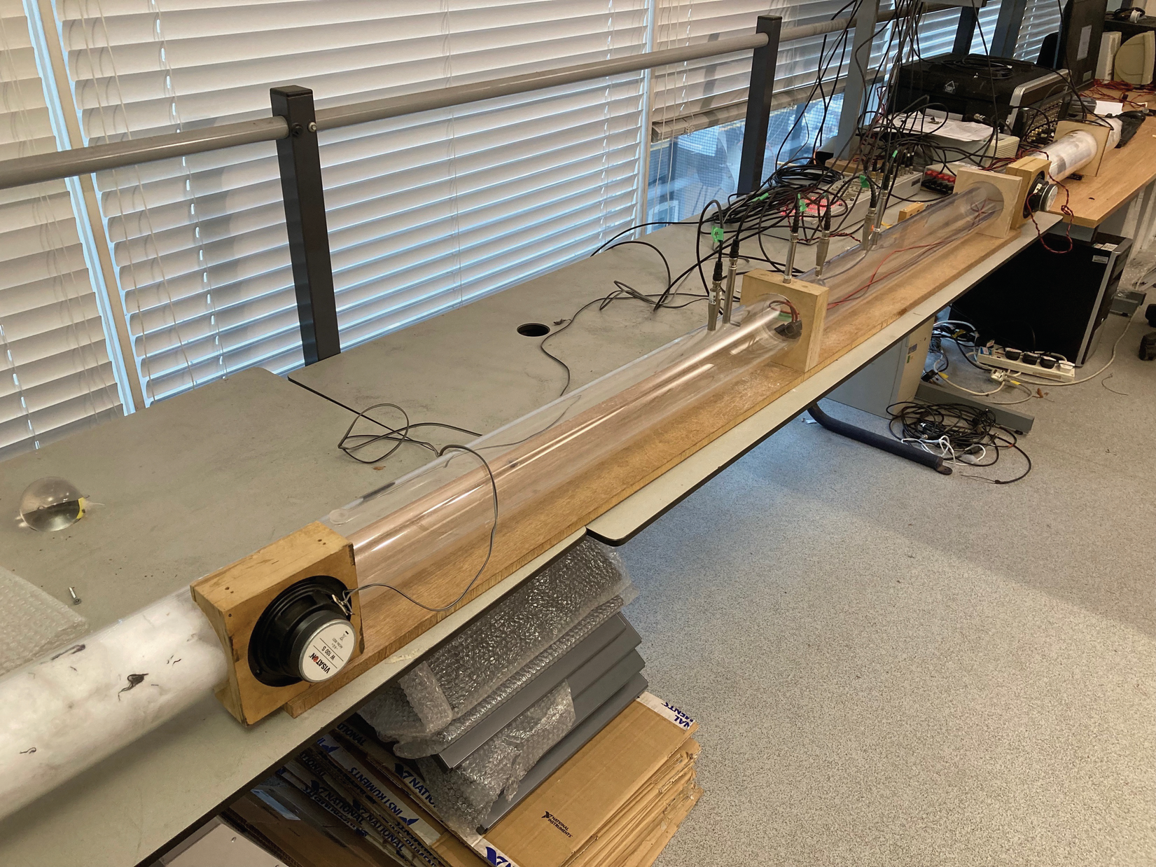 A A A Volume : 44 Part : 2 Remote sensing for wave-based nonreciprocal active controlJoe Tan 1University of Southampton University Road, Southampton, SO17 1BJJordan Cheer 2University of Southampton University Road, Southampton, SO17 1BJABSTRACT Reciprocity is an acoustic property that describes the symmetry of sound transmission between two points. However, this property is undesirable in certain applications, and this has led to significant interest in the development of nonreciprocal acoustic devices that achieve one-way sound transmission. These devices typically achieve nonreciprocal sound transmission by introducing nonlinearities or directional biasing. Previously proposed nonreciprocal acoustic devices generally have limitations; for example, they may not be fully tuneable, they can introduce signal distortions such as additional harmonics, or they can only exhibit nonreciprocal behaviour over a narrow bandwidth. To overcome these challenges, previous work has demonstrated how a wave-based active control system can be used to drive an array of acoustic sources to achieve reversible and broadband non-reciprocal behaviour. However these wave-based active control systems use external far-field pressure sensors to achieve broadband nonreciprocal behaviour and, thus, these active control systems are not self-su ffi cient. This paper therefore presents an experimental investigation into how remote sensing techniques can be incorporated into the previously proposed wave-based active control systems to create more self-contained nonreciprocal acoustic devices that still achieve broadband nonreciprocal behaviour in a one-dimensional acoustic system.1. INTRODUCTIONReciprocity is an acoustic property, which is considered to be inherent in linear acoustics, that describes the symmetry in sound transmission between two points. For example the sound transmission between an acoustic source and observer is equal to the sound transmission when the two swap positions. In acoustics, reciprocity has been used to simplify measurement processes in a variety of di ff erent applications [1, 2]. However, this property is undesirable in certain acoustic applications, which has led to the development of nonreciprocal acoustic devices. These devices have the ability to block or reflect acoustic waves that are propagating in one direction, whilst1 j.tan@soton.ac.uk2 j.cheer@soton.ac.uka slaty. inter.noise 21-24 AUGUST SCOTTISH EVENT CAMPUS O ¥, ? GLASGOW acoustic waves propagating in the opposite direction can propagate freely. Previously proposed nonreciprocal acoustic devices generally break the symmetry of sound transmission by introducing nonlinearities [3–7], fluid motion [8] or space-time modulated resonant cavities [9–11]. Although these various approaches do exhibit nonreciprocal sound transmission, they typically have limitations: nonlinear nonreciprocal acoustic device generally require large input power and can introduce signal distortions; fluid motion is practically realised using fans, which introduce additional harmonics; the bandwidth of the nonreciprocal behaviour is often narrow when using resonant cavities; and finally, these systems generally create a preferential direction for nonreciprocal behaviour and, thus, they are not fully tuneable. Some of these limitations have been addressed through the realisation of a non-local active metamaterial consisting of an array of sensor-actuator pairs, which can create the directional biasing required to achieve broadband nonreciprocal sound transmission [12, 13]. However, this nonreciprocal device is still not fully tuneable because the sensor-actuator arrangement still creates a preferential direction for the nonreciprocal behaviour. More recently, it has been shown that adaptive feedforward wave-based active control systems can exhibit nonreciprocal behaviour in one and two dimensional spaces [14–16]. The advantage of these systems is that they are fully tuneable, such that the nonreciprocal behaviour can be reversed by changing the reference and error signals for these controllers. However, these nonreciprocal acoustic devices rely on a wave separation method, which requires external far-field pressure sensors, to calculate the propagating wave components needed for nonreciprocal control. Although these external pressure sensors could be moved closer to the control sources, this would require additional pressure sensors to separate the positive and negative propagating and evanescent wave components. Alternatively, this paper investigates how a remote sensing method can be combined with the previously proposed wave-based active control systems to create a more self-contained nonreciprocal acoustic device that still achieves broadband nonreciprocal sound transmission and absorption. This paper is structured as the follows: Sections 2 and 3 describes the experimental acoustic system and remote sensing method used in this paper. Section 4 describes the active control formulations for the wave-based active controllers that are used to control the wave components when remote sensing is integrated. Section 5 presents the results of the o ffl ine experimental investigation into the performance of the proposed wave-based active control systems and finally, Section 6 presents the conclusions.2. SYSTEM DESCRIPTIONFigure 1 shows the experimental arrangement of the proposed self-contained wave-based nonreciprocal active system, which combines the previously proposed wave-based active control system with remote sensing techniques, to realise broadband nonreciprocal sound transmission and absorption in a one-dimensional environment. The system shown in Figure 1 contains an impedance tube with a passive termination and primary disturbance source at each end and active control unit located at the centre of the duct. From Figure 1, it can be seen that there are two monitoring pressure sensors, P m 1 and P m 2 , which are in close proximity to the control s