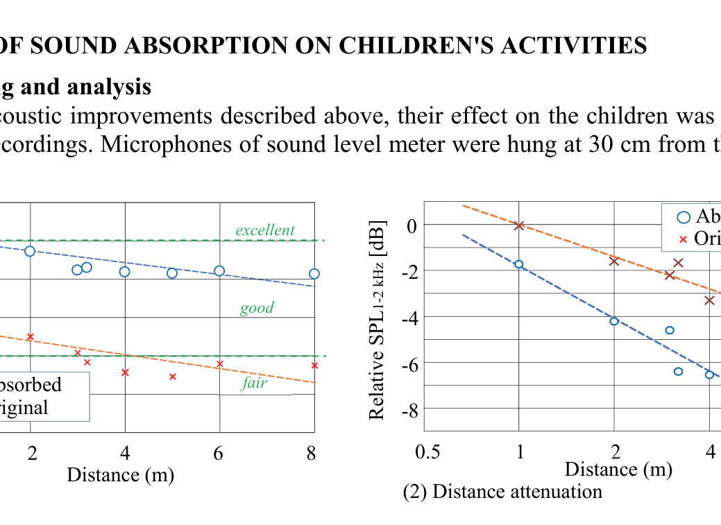 A A A Volume : 44 Part : 2 A field experiment on the effect of sound absorption installed to a highly reverberant kindergarten classroom Keiji Kawai 1 Midori Ishizawa Yuuki Matsufuji Kumamoto University 2-39-1 Kurokami Kumamoto-city Japan ABSTRACT Japanese national or local governments have not published any standard for acoustic performance of classrooms and this is reflected by the rare consideration of sound absorption in classrooms. A kindergarten classroom, targeted in this study, was found to be highly reverberant (V = 200 m 3 , RT = 1.0 s at 1 kHz) because the room was originally an outdoor space of ground floor pilotis and converted into a classroom by constructing concrete walls between the columns with the fire-resistant hard ceiling panels remained. The author proposed a temporary installation of sound absorbing ma- terial and to conduct a field experiment to examine and experience the effect of sound absorption. Sound absorbers were attached on the ceiling and the walls to reduce the RT to 0.5 s. By this, the slope of doubled distance attenuation increased from 1.5 dB to 2.3 dB, which should mitigate the confusion of speeches by children in the room. The result of sound level monitoring indicated 6-7 dB decrease at 1-2 kHz in the absorbed condition, which is greater than the 3.8 dB decrease measured in the unoccupied condition using a loudspeaker source. Also, the children’s utterances of lunch prayer were more synchronized in the absorbed condition. 1. INTRODUCTIONReverberation is a factor that can greatly hinder the vocal communication of young children, as stated in [1] as an example: For Early Childhood Facilities (children from birth- age 5) the reverberant acoustic conditions should be optimal, as children are involved in listening and language skill devel- opment during this stage of their life and need the best acoustic conditions possible . However, at present in Japan, national or local governments have not published any standard for reverberation time of classrooms and this is reflected by the rare consideration of sound absorption in classrooms of school and pre-school facilities. During our site inspection survey on the acoustics of kindergarten buildings in Kumamoto city, a highly reverberant classroom happened to be found. Among classrooms in the kindergarten, only this room is a refurbished room from the original outdoor piloti, with highly reflective surfaces such as the original fireproof cement board ceiling remained and concrete walls additionally constructed be- tween columns. The teachers recognized that the room tend to be noisier than others but did not recognized that the bustling was due to the excessive reverberation. At the time of visit, 3-year-old children were freely playing in the classroom and everyone seemed to be screaming. Thus, the authors1 kkawai@kumamoto-u.ac.jp21-24 AUGUST SCOTTISH EVENT CAMPUS ? 02 ? GLASGOW 21-24 AUGUST SCOTTISH EVENT CAMPUS ? 02 ? GLASGOWproposed a temporary installation of sound absorbing material and to conduct a field experiment to examine and experience the effect of sound absorption. 2. OVERVIEW OF EXPERIMENTThe room for the experiment is for one of the two 3-year-old classes with 25-30 children for each. The dimensions of the room are 6.2 m x 10.8 m x 2.5 m (S = 250m 2 , V = 200m 3 ) (Figure 1). The interior materials of the room are concrete for the walls, glass windows, cement boards for the ceiling, and timber floor, which are totally highly reflective. The furniture is plastic chairs and tables and a piano. A curtain attached to a glass window is only sound absorbing material in the room. The rever- beration time measured in this room and the average sound absorption coefficient obtained by Eyring’s equation are shown in Table 1. The absorption coefficient, 0.12, can be regarded as highly reverberant as a classroom with furniture.10800h= 2.5 m V= 200 m³ S= 250 m² S1(h=1.2m)6200S2(h=0.4m)R1(h=2.2m) R2(h=2.2m)absorberFigure 1: Room dimensions and source/receiving positionsFigure 2: Sound absorber installationTable 1: Reverberation time and average absorption coefficientReverberation time [s] Absorption coefficient Oct. band [Hz] Original Absorbed Original Absorbed 250 1.0 0.9 0.12 0.14 500 1.0 0.6 0.12 0.18 1 k 1.0 0.5 0.12 0.23 2 k 1.0 0.5 0.12 0.23 4 k 0.9 0.5 0.13 0.24Table 2: Outline of experimental periodPeriod Date Absorption Recording day N of children N1 Dec.6-Dec.10 no 5 27-30 A1 Dec.13-Jan.21 yes 6 26-30 Jan.24-Feb.14 no - 16-19 A2 Feb.15-Mar.4 yes 6 23-26 N2 Mar.7-Mar.22 no 7 24-28 21-24 AUGUST SCOTTISH EVENT CAMPUS ? 02 ? GLASGOWSound absorbers were temporarily installed in this room with an average sound absorption coeffi- cient of 0.25 as a target, that is, 163 polyester fiber boards with a size of 170 x 400 mm and a thickness of 50 mm were attached to the ceiling with magnets, and 12 m 2 of polypropylene non-woven fabric with a thickness of 4 mm was hung on two adjacent walls (Figure 2). The experiment was carried out from December 2021 to March 2022, during which the sound absorbers were attached and detached twice. Table 2 shows the outline of the experimental periods. Due to the spread of infection of COVID-19, a request to refrain from going to the kindergarten was issued after A1 period. The re- quest continued until March, but gradually the number of children coming to kindergarten increased and the recording restarted in the middle of February. Acoustic measurements were performed in the condition with and without the absorbers, and room sounds were recorded for a total of 24 days. 3. IMPROVEMENT IN ROOM ACOUSTICSThe improvement of room acoustic conditions due to the sound absorption was examined by acoustic measurement. In the actual measurement, using an omnidirectional speaker as the sound source, the reverberation time and STI (S/N ratio set at 15 dB in every octave band) were measured by impulse response method, and the distance attenuation from the sound source was measured u