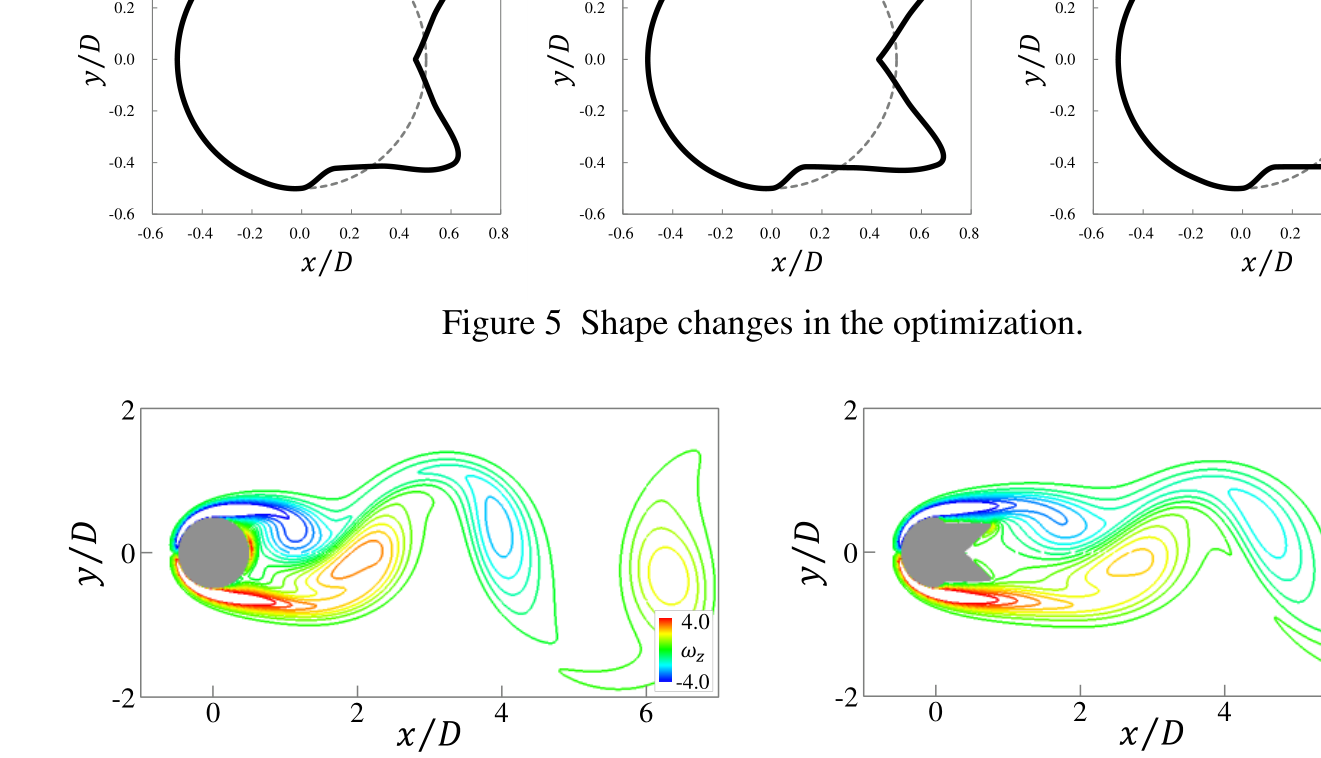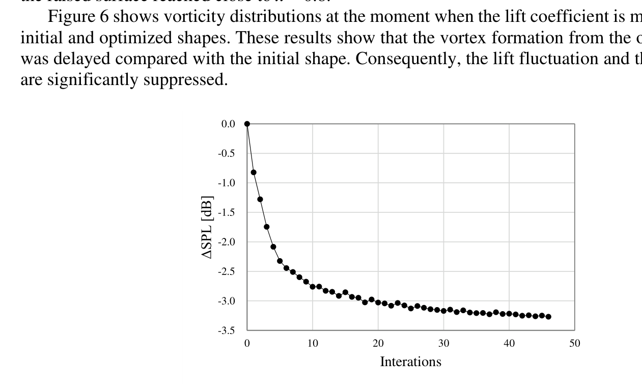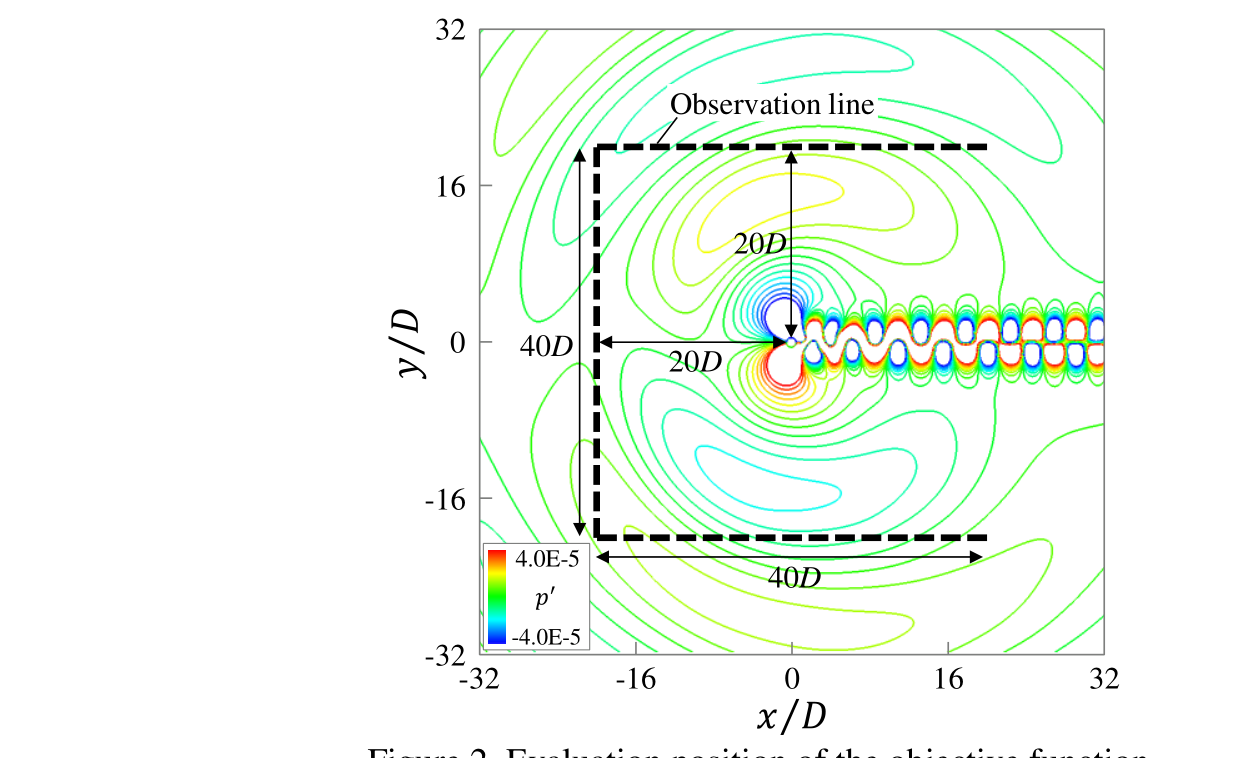 A A A Volume : 44 Part : 2 Aeroacoustic shape optimization using adjoint sensitivity analysis based on lattice Boltzmann method for bluff bodies Kazuya Kusano 1 Kyushu University 744 Motooka, Nishi-ku, Fukuoka, JapanABSTRACT The present study developed an adjoint-based shape optimization method aimed at suppressing flow- induced sounds. In this method, the direct aeroacoustic simulation was conducted using the lattice Boltzmann equation (LBE) under low-Mach-number conditions. In the simulation, complex shapes of objects were considered using the interpolated bounce-back (IBB) scheme. Furthermore, the sen- sitivities of far-field sounds to object shapes were evaluated by solving the adjoint equation, which was derived from the LBE with IBB scheme. The present method was applied to the cylinder Aeolian tone, and the rear part of the cylinder surface was optimized. The optimized shape suppressed the sound generation by delaying the vortex formation in the wake.1. INTRODUCTIONIn the last few decades, computational aeroacoustics (CAA) have been advanced with the rapid increase in computing power. In CAA, there are two typical approaches for low-Mach-number flows, which are important in various engineering applications. One is the hybrid approach based on Lighthill’s acoustic analogy [1] with the incompressible Navier-Stokes simulation. The other is the lattice Boltzmann method (LBM), which can directly simulate flow-induced sounds under low-Mach- number conditions [2, 3]. In the engineering, these approaches have enabled to predict the sound level of the newly designed products before manufacturing. In addition, the sound generation mechanism can be elucidated by analyzing the simulation results. However, it is still difficult to control flow- induced sounds by modifying object shapes in the aerodynamic design.A possible approach to overcome this difficulty is the shape optimization based on CAAs. How- ever, the shape optimization is not yet practical for unsteady flow problems including flow induced sounds due to large computational cost. To reduce the computational cost in the aerodynamic shape optimization, the adjoint method has been proposed [4] and widely used in the Navier-Stokes frame- work. The adjoint method can efficiently evaluate the gradients of the objective function to numerous design variables by solving the adjoint equation. Recently, the adjoint method based on the LBM has been developed for several steady flow problems [5, 6], but flow-induced sound problems have not been considered yet.The present study developed the adjoint sensitivity analysis using the LBM for aeroacoustic shape optimization of bluff bodies. This approach was tested for the Aeolian tone generated from the flow past a circular cylinder, and the optimization of the cross-sectional shape was attempted.1 kusano@mech.kyushu-u.ac.jpworm 2022 2. NUMERICAL METHOD2.1. Lattice Boltzmann methodFlow-induced sounds were directly simulated using the LBM. In this subsection, the outline of the LBM was described. Details are given in a previous report [2].The lattice Boltzmann equation (LBE) with the BGK model is written as follows:𝑓 𝑖 ሺ𝐱+ ∆𝑡𝐜 𝑖 , 𝑡+ ∆𝑡ሻ= 𝑓 𝑖 ሺ𝐱, 𝑡ሻ− 1eq ሺ𝐱, 𝑡ሻ൧ , (1)𝜏 ൣ𝑓 𝑖 ሺ𝐱, 𝑡ሻ−𝑓 𝑖where 𝑓 𝑖 is the distribution function of a particle with velocity 𝐜 𝑖 . As a particle velocity model, D2Q9 model was used. 𝑓 𝑖eq is the local equilibrium distribution function, and 𝜏 is the relaxation time. Fluid density 𝜌 and velocity 𝐮 are calculated from the distribution functions as follows:. (2)𝜌= 𝑓 𝑖, 𝜌𝐮= 𝑓 𝑖 𝐜 𝑖𝑖𝑖2 , where 𝑐 𝑠 = 𝑐ξ3 Τ is the speed of the sound. To consider objects with complex geometries, the interpolated bounce-back (IBB) condition [7] was applied for the wall boundary condition.The fluid pressure is related to the density as 𝑝= 𝜌𝑐 𝑠2.2. Adjoint methodThe shape optimization was conducted using the adjoint method. In this optimization, the objec- tive function I is defined as the square mean of the sound pressure in an arbitrary observation region and at an arbitrary observation time.The minimization problem of the objective function was formulated based on the Lagrange mul- tiplier method under a constraint condition 𝑅 𝑗 ሺ𝐱 𝑘 , 𝑡 𝑛 ሻ= 0 , which was the LBE for each computa- tional element. Consequently, the adjoint equation was derived as follows:∗ ൫𝐱 𝑘 0 −∆𝑡𝐜 𝑖 , 𝑡 𝑛 0 ൯𝑓 𝑖∗ ൫𝐱 𝑘 0 , 𝑡 𝑛 0 +1 ൯+ 1∗,eq ൫𝐱 𝑘 0 , 𝑡 𝑛 0 +1 ൯൧− 𝜕𝐼𝜕𝑓 𝑖 ൫𝐱 𝑘 0 , 𝑡 𝑛 0 ൯ , (3)∗ ൫𝐱 𝑘 0 , 𝑡 𝑛 0 +1 ൯−𝑓 𝑖= 𝑓 𝑖𝜏 ൣ𝑓 𝑖∗,eq is the local equilibrium distribution function for the adjoint equation [8]. This adjoint equation has a form similar to that of the LBE (1). Therefore, the adjoint equation can be computed as easily procedure as the LBM.∗ are the adjoint states (Lagrange multiplier), and 𝑓 𝑖where 𝑓 𝑗∗ , the sensitivity of the objective function I to design variables 𝛼 𝑚 is given as follows:Using the adjoint state 𝑓 𝑗𝜕𝑅 𝑗 ሺ𝐱 𝑘 , 𝑡 𝑛 ሻ𝑑𝐼 𝑑𝛼 𝑚= 𝜕𝐼∗ ሺ𝐱 𝑘 , 𝑡 𝑛+1 ሻ𝜕𝛼 𝑚 . (4)+ 𝑓 𝑗𝜕𝛼 𝑚𝑛 𝑘 𝑗In the optimization process, the design variables were updated based on the steepest descent method using the sensitivity data.worm 2022 3. TEST PROBLEMThe present optimization method was tested for the Aeolian tone of a circular cylinder. The Mach number of the uniform flow was 0.2, and the Reynolds number based on the circular cylinder diameter D was 150.The cylinder shape was defined using an interpolation curve that was controlled with 11 points, as shown in Fig. 1. The shape was symmetrical to the center line in the streamwise direction. The rear part of the cylinder was op
