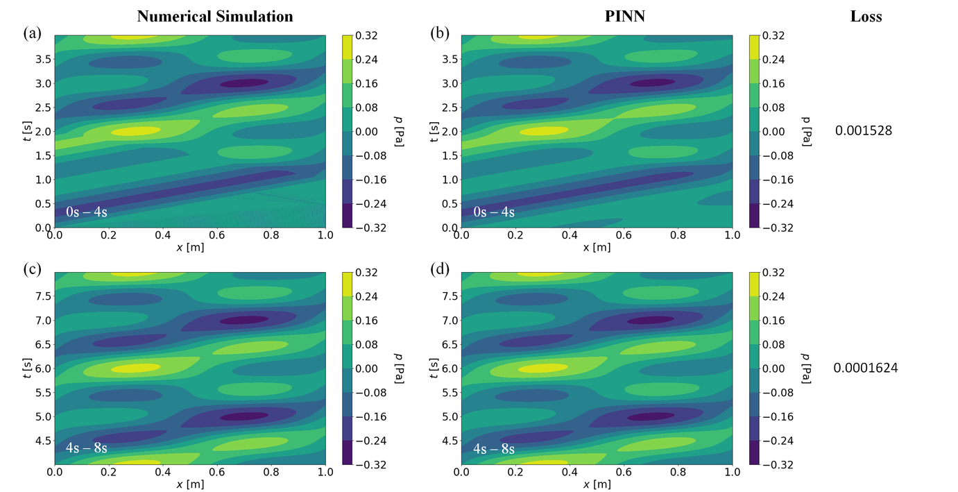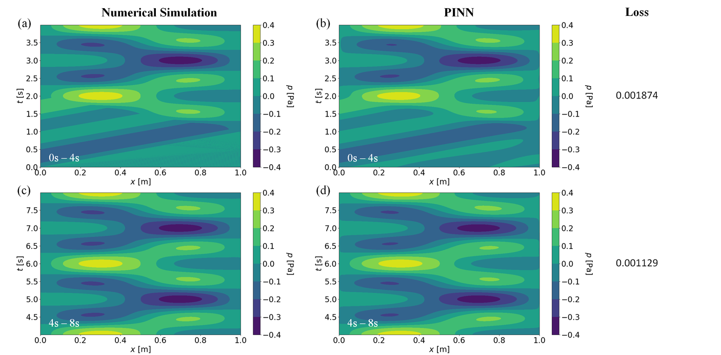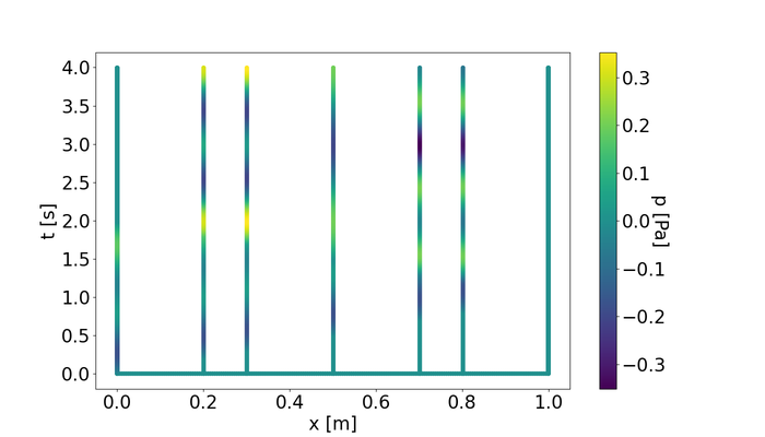 A A A Volume : 44 Part : 2 Towards reconstruction of acoustic fields via physics-informed neural networksKorbinian Niebler 1Technical University of Munich, School of Engineering & Design, Department of Engineering Physics and Computation Boltzmannstr. 15, 85747 Garching, GermanyPhilip Bonnaire 2Technical University of Munich, School of Engineering & Design, Department of Engineering Physics and Computation Boltzmannstr. 15, 85747 Garching, GermanyNguyen Anh Khoa Doan 3Faculty of Aerospace Engineering, Delft University of Technology Kluyverweg 1, 2629HS Delft, NetherlandsCamilo Fernando Silva 4Technical University of Munich, School of Engineering & Design, Department of Engineering Physics and Computation Boltzmannstr. 15, 85747 Garching, GermanyABSTRACT Acoustic measurements, obtained by microphones positioned at strategic places, are of great utility for the monitoring of a given acoustic system and for its protection in case large pressure fluctuations are measured. Such strategies are reliable as long as the microphones are properly positioned, which is not evident: in some cases the excited acoustic modes are not known beforehand. In this work, we proposed a method based on physics-informed neural networks (PINN) in order to reconstruct the entire acoustic field of a given acoustic element, when provided with only some acoustic measurements at some few locations. Such a method makes use of a feedforward neural network, where the loss function is taken as the residual of the acoustic wave equation. Such a residual is computed exploiting the automatic di ff erentiation property of neural networks, in order to obtain the corresponding spatial and time derivatives. Additionally, the measurements of the aforementioned microphones are gathered and used also for the calculation of additional terms in the PINN loss function. By doing so, the most adequate acoustic state is obtained, which satisfies1 korbinian.niebler@tum.de2 philip.bonnaire@tum.de3 n.a.k.doan@tudelft.nl4 camilo.silva@tum.dea slaty. inter.noise 21-24 AUGUST SCOTTISH EVENT CAMPUS O ¥, ? GLASGOW both measurements and the acoustic wave equation. In other words, the acoustic field within the system is reconstructed.1. INTRODUCTIONAfter the proof that feedforward neural networks are universal approximators for arbitrary functions [1] and also their derivatives [2], research with neural networks has yielded enormous progress and significant results in a wide range of scientific disciplines. The studies in the fields of image recognition [3], natural language processing [4], cognitive science [5], and genomics [6] are representative of this development. However, when examining complex problems, gaining enough data for the training of the neural network presents a challenge for the state-of-the art machine learning techniques. Therefore the study of Raissi et al. [7] o ff ers a great possibility to counteract the obstacles posed by a small-data regime. They introduced physics-informed neural networks (PINNs), which stand out due to a modification of the loss function. The well-known mean squared error (MSE) minimization of the training data is extended by an error function characterized by the residual of the governing partial di ff erential equation (PDE) of the system. The embedding of the PDE is achieved by a powerful but underestimated computational tool, the automatic di ff erentiation described in the study of Baydin et al. [8]. When dealing with a system, where only a small amount of data is available and where a physical law, especially a PDE, forms a constraint, the concept of physics-informed neural networks o ff ers a promising chance to overcome the challenges posed by the physics and data characterizing these systems. In our study we aim to analyse a system with the physical constraint defined by the one- dimensional acoustic wave equation:∂ 2 p∂ t 2 − ¯ c ∂ 2 p∂ x 2 = 0 . (1)Here, p denotes the acoustic pressure of the system, t the time, x represents the spatial variable and ¯ c stands for the (constant) speed of sound. We will use the presented concept of PINNs to reconstruct the pressure distribution in a given domain relying on only few training data (measurements). In a second step, we investigate how a given reflection coe ffi cient or wall impedance associated with the system can be calculated in postprocessing.2. DESCRIPTION OF THE PROBLEMWe define the domain of our problem as one-dimensional in space. The inlet of the domain is located at x = 0, where a forcing function is also applied. Continuously, this forcing inlet introduces disturbances into the domain. The outlet at x = L = 1m is characterized by a specific wall reflection coe ffi cient R , which may vary between 0 and 1. The training data for the neural network is generated through a custom numerical simulation. For the set-up of the simulation, instead of the wave equation, we implement the linearized mass and momentum equation as defined in [9]. In this work, we refer to this set of equations as the linearized acoustic equations:1 ¯ c 2 ∂ p∂ t = − ¯ ρ ∂ v∂ x , (2)¯ ρ ∂ v∂ t = − ∂ p∂ x . (3)In this set of equations, the constant ambient density ¯ ρ and speed of sound ¯ c are introduced. In addition to the acoustic pressure p , the acoustic velocity v is also accounted for. For the simulation we choose the linear acoustic equations over the acoustic wave equation because of the handling of boundary conditions which is considerably simpler. The boundary conditions are mostly formed by first-order derivatives so their implementation is facilitated by using a system of first-order di ff erential equations. Regarding the discretization and the solving of the equations, we use a centered finite di ff erences scheme with sixth order of accuracy in space and a forward Euler scheme in time. The specific details of the neural network used in this study regarding its architecture and the training process can be found in th