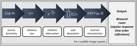 A A A Volume : 44 Part : 2 Differences between measured and simulated room impulse responses Lukas Aspöck 1 and Michael Vorländer 2 Institute for Hearing Technology and Acoustics, RWTH Aachen University Kopernikusstraße 5, D-52074 Aachen, GermanyABSTRACT Simulation models based on geometrical acoustics mostly do not immediately deliver a simulated room impulse response, but intermediate results such as an energy histogram or an energy decay curve. At this point, further models are required to generate a room impulse response of the simulated environment, which are essential for the process of auralization. While for various simulated scenarios, the application of a reflection model based on a basic theory is sufficient, detailed comparisons of simulated and measured room impulse responses reveal differences which are attributed to the lack of diffuse reflections in the applied reflection model. These deviations can also substantially affect derived room acoustic parameters. This work presents and explains the shortcomings and discusses potential improvements to be considered in the simulation process.1. INTRODUCTIONComputer simulations for the prediction of a room’s acoustics have been developed many decades ago and now are an established tool for acoustic consultants, integrated in professional software environments. While the most typical application is the calculation of room acoustic parameters such as the reverberation time, simulation tools also offer the possibility to obtain a room impulse response (RIR). In recent validation studies involving simulation models based on Geometrical Acoustics (GA), simulated RIRs have been compared to the corresponding measured RIRs [1]. For such comparisons it needs to be considered that the measured RIR should not directly be compared to the simulated RIRs, unless at least the most relevant data which makes a measurement not correspond to the ideal situation, i.e., the sound source directivity, is also considered in the simulation. However, even a qualitative comparison of measured and simulated RIRs can help to identify shortcomings in the simulation process. With respect to the Round Robin results, it was discussed in how far the RIR synthesis method led to relevant deviations of room acoustic parameters if the simulated RIRs were used for the parameter evaluation [2]. If used for auralizations, an inadequate RIR synthesis might also introduce audible colorations. This paper revisits these investigations and focuses on the observed differences in temporal structure between measured and simulated RIRs, mostly discussing the synthesis of the early diffuse part and the late part of the RIR.1 las@akustik.rwth-aachen.de 2 mvo@akustik.rwth-aachen.de 2. ROOM IMPULSE RESPONSE SYNTHESISTo obtain broadband RIRs based on wave-based simulations models, which typically provide results in the frequency domain, an inverse Fourier-Transformation of the frequency response needs to be conducted. This is rarely done as the computational effort to calculate results for the full audible frequency range is very high, despite powerful CPUs and computer clusters being available [3]. For, in some cases, more efficient wave-based simulations in the time-domain, such as the finite difference time domain method (FDTD), the RIR can be obtained by setting a Dirac impulse as the pressure signal of the sound source point of the FDTD grid [4]. In addition to the high computational effort, for wave-based simulation it is not impossible but challenging to also account for directional characteristics of the sound source and receiver and integrate them into the RIR. The synthesis of RIRs based on GA models is less challenging, but also depends on the chosen method.2.1. Image sources: Early (specular) reflections Many of the GA-based simulation tools use the image source model [5] to obtain the direct sound and the early reflections. The calculation of each audible image source contribution to the RIR is straightforward: According to the distance of the image source to the receiver of the scene and the related surface absorption data, the delay of the impulse as well as the amplitude can be obtained. This process becomes only slightly more complicated when also directional data of sound source and receiver (Head-Related Transfer Functions) and air absorption is additionally considered. The full synthesis, processed in the frequency domain, for a set of audible image sources is illustrated in Figure 1. This method leads to a high temporal accuracy of each inserted reflections, only limited by the chosen sampling rate of the audio processing environment. The time delay, which is not included in the figure, is easily obtained by division of the distance r by the speed of sound.Figure 1: Filter synthesis process for image sources in the frequency domain.2.2. Late (diffuse) reflections Even without any application of a ray-based model the later part of the RIR can be synthesized based on an estimated reverberation time. Moorer developed a RIR synthesis already in 1979 using stationary white noise multiplied by an exponential decay based on frequency-dependent reverberation times [6]. While a RIR generated by this process would correctly model the decay time, it does not account for any room-dependent reflection patterns. This can be achieved by different methods such as ray or beam tracing or the radiosity approach, which all generate an energy decay for the investigated room, typically with a lower temporal resolution resulting in an energy histogram, for which the energy of multiple paths is summed up in a time bin. This energy histogram is often mistaken for the energy impulse response of the room. Due to its low temporal resolution (length of a time bin is typically in the range of 1-10 ms), it does not include information about the actual reflections but only models the decay process of the energy in the room. Reducing the length of a time bin and therefore increasing the tem