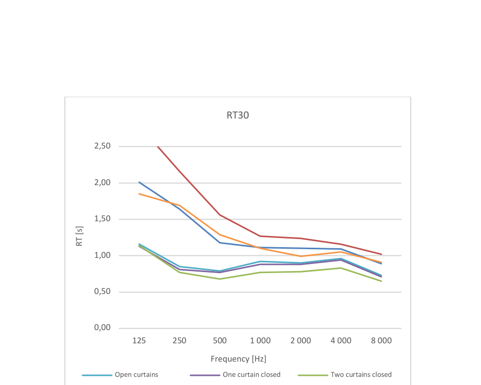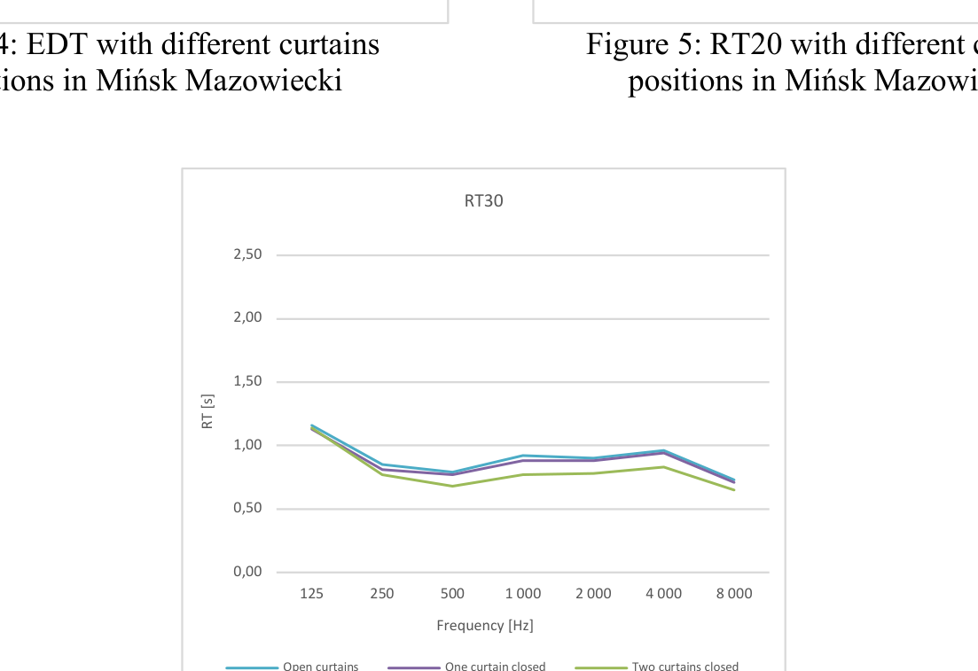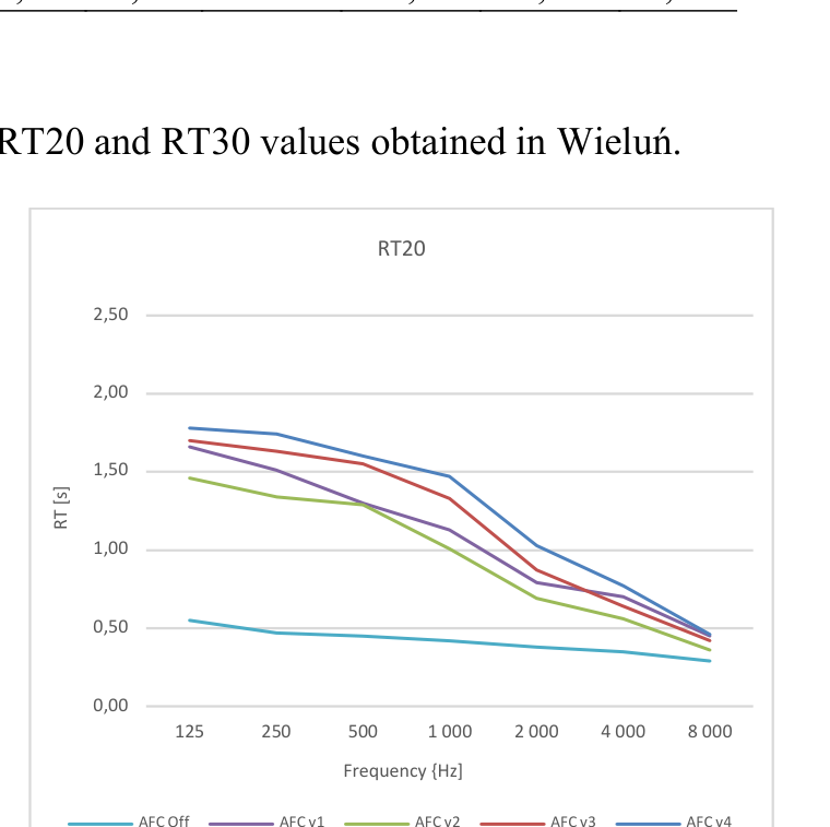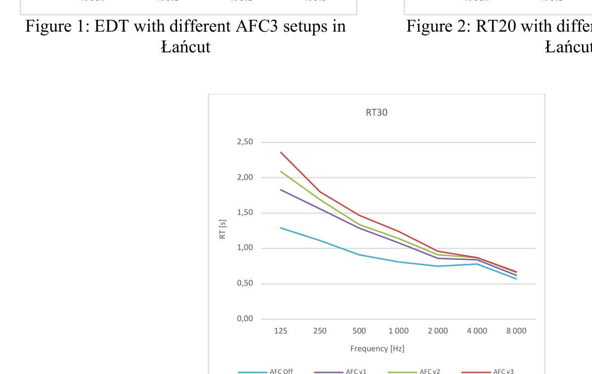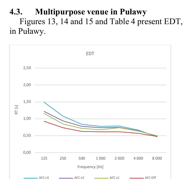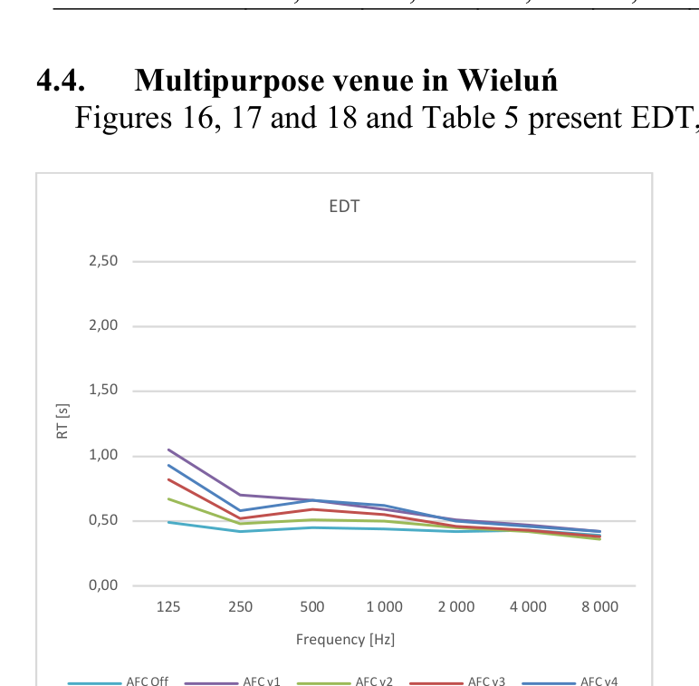 A A A Volume : 44 Part : 2 Objective evaluation of multipurpose enclosures equipped with active acoustic enhancement systems - examples of halls based in Poland. Łukasz Błasiński 11 Department of Acoustics, Faculty of Physics, Adam Mickiewicz University, Uniwersytetu Poznańskiego 2, 61-614 Poznań, PolandABSTRACT From the acoustical point of view various events requires different acoustic conditions. Research on optimal acoustic parameter values that have been carried out for recent decades and the necessity to provide different acoustic solutions to events of a different type led to construction of rooms with variable acoustic conditions. In such rooms changes in parameters in multipurpose enclosures may be achieved by modifications of volume or a shape of a room as well as through the use of appropriate acoustic treatments. However, those modifications are limited and frequently insufficient due to the technical limitations. Therefore, active acoustic enhancement systems (AAES) based on signal processing and multisource redistribution of a modified signal in a room become more and more popular. Application of such systems allows adjustments of acoustic parameters required for particular performance. This paper presents results from measurements of objective parameters of multipurpose enclosures equipped with AAES. Investigated halls are located in Poland and were intentionally built or renovated as multipurpose rooms. All of those were equipped with Yamaha Active Field Control version 3 system. The measurements were performed according to ISO338-1/2 standards. In total 13 active acoustic system settings were analyzed to investigate their influence on room acoustics parameters. Keywords: room acoustics, concert hall, multipurpose hall, active acoustics system, reverberation 1. INTRODUCTIONFrom the acoustical point of view, various events require different acoustic conditions. Research on optimal acoustic parameter values have been carried out in recent decades. Optimal values of different room acoustics parameter can be found in many scientific publications [1-6]. The necessity to provide different acoustic solutions for events of a different type (e.g., symphonic concerts or speech), led to construction of rooms with variable acoustic conditions. In such rooms, changes in parameters in multipurpose enclosures may be achieved by modifications of the volume or shape of a room as well as through the use of the appropriate acoustic treatments. [7, 8]. However, one must bear in mind that those modifications are limited and frequently insufficient due to the technical constraints [9]. They also make the building costs much higher which is generally not accepted by the investors. Therefore, nowadays, active acoustic enhancement systems (AAESs) based on the signal processing and multisource redistribution of a modified signal in a room become more and more popular. Application of such systems allows for the adjustments of acoustic parameters required for particular performance [10].The earliest application of the AAES containing microphone-speaker loops which were merely to generate additional resonances and reflections were established in the 1960s [11, 12]. Enhancement of the acoustic behavior of the room can be achieved in two different ways: either by adding reflection based on the room’s natural reflection (regenerative approach) or by synthesizing reflection based on the direct sound (in-line approach). Regenerative systems use omnidirectional microphones placed over the critical distance from the sound source, regenerating natural reflections within the loops containing microphone, delay line, amplifier and speaker. In-line systems use cardioid microphones1 lukasz.blasinski@amu.edu.pl placed relatively close to the sound source and artificial reverberation engines in each system’s loop, adding artificial reverberation to original sound captured by the microphones [13, 14]. Over the years, several systems have been proposed by different manufacturers. Most recent AAES are hybrid regenerative systems with both - regenerative and in-line sections which provide a stable, natural sounding diffuse reverberation field [15].This paper is arranged as follows. Section 1 describes the aim of the research; section 2 - rooms’ acoustic parameters as well as measurement procedure. Section 3 contains the results obtained in the performed measurements. In section 4 obtained results are discussed. Section 5 presents conclusions.2. AIM OF RESEARCHThe main goal of the study was to investigate how the use of the active acoustic system affects the standard objective room acoustic parameters values. As a consequence, it would answer the question whether the use of the system can provide optimal acoustic conditions in terms of the type of performance. Four multipurpose enclosures based in: Łańcut, Wieluń, Mińsk Mazowiecki and Puławy were measured. All halls are equipped with the Acoustic Field Control version 3 system produced by Yamaha.3. METHODOLOGY OF RESEARCH3.1. Objective room acoustics parameters There are many different parameters that can be measured in a room. However, in this paper we focused on ISO standards [16, 17], thus the most common room acoustic objective parameters were chosen to analyze their values in the investigated halls as Reverberation Time (RT), Early Decay Time (EDT), Clarity (C80, C50), Definition (D50), Initial Time Delay Gap (ITDG), Center Time (Ts), Interaural Cross Correlation (IACC) and Speech Transmission Index (STI) [4, 18, 19-22].3.2. Measurement procedure According to the standard mentioned above, an omnidirectional Neotek Dodecahedron DO12-PLUS sound source with dedicated amplifier and iSEMCom EMX7150 omnidirectional microphones were used. Both the measurements and their analysis were performed using the EASERA (AFMG Technologies GmbH) software with Roland Octa Capture UA1010 interface. IACC parameter value was measured with a Neumann KU100 dummy head.In ea