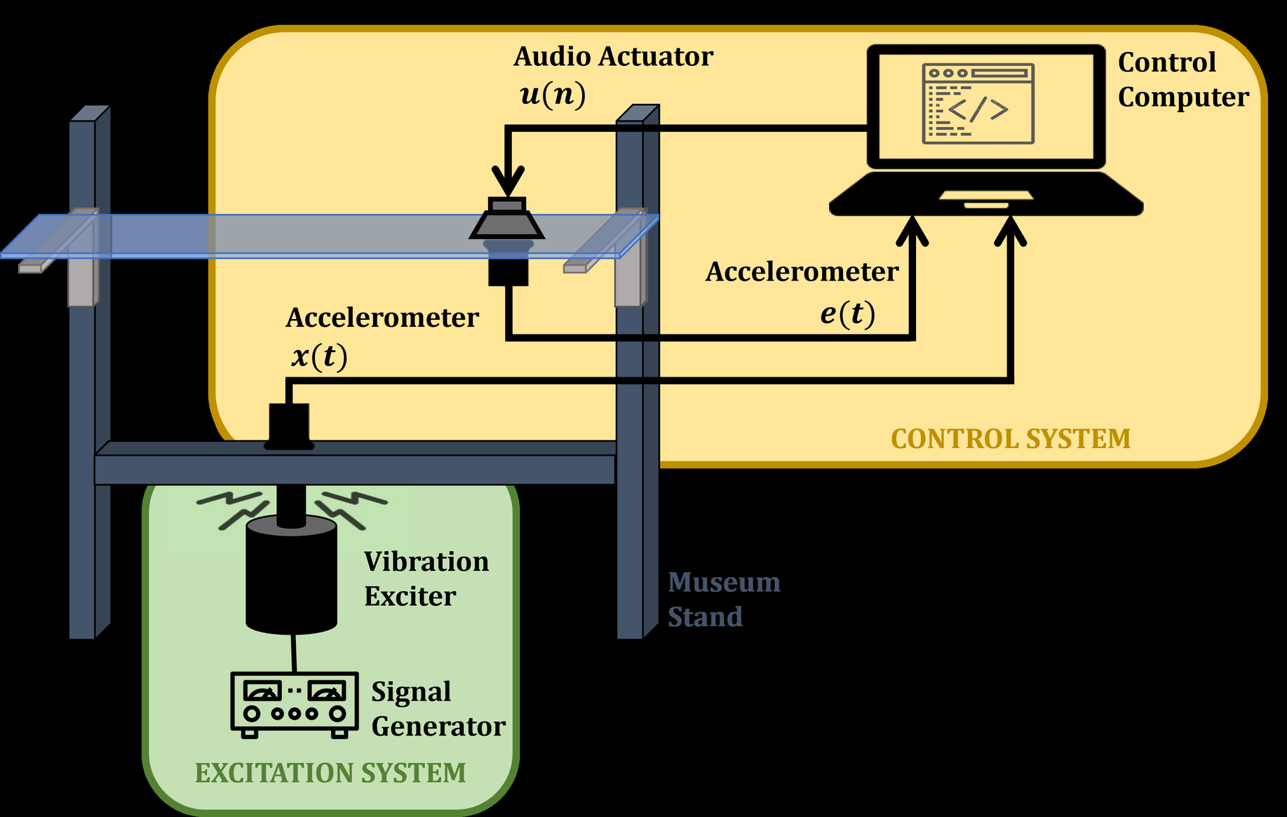 A A A Volume : 44 Part : 2 Experimental design of an active vibration control device used to protect cultural heritage objects.Loïc Forma 1Systèmes et Applications des Technologies de l’Information et de l’Energie (SATIE), CY Cergy-Paris 5 mail Gay Lussac, 95000 Neuville-sur-Oise, FranceNicolas Wilkie-Chancellier 2Systèmes et Applications des Technologies de l’Information et de l’Energie (SATIE), CY Cergy-Paris 5 mail Gay Lussac, 95000 Neuville-sur-Oise, FranceSandie Le Conte 3Institut National du Patrimoine (INP) 124 Rue Henri Barbusse, Aubervilliers, FranceHenri Boutin 4Sciences et Technologies de la Musique et du Son (UMR9912), Sorbonne Université, Ircam, Centre National de la Recherche Scientifique (CNRS) 1 place Igor Stravinsky, Paris, FranceMarguerite Jossic 5Équipe Conservation Recherche, Musée de la Musique, Cité de la Musique-Philharmonie de Paris 221 Avenue Jean Jaurès, Paris, FranceABSTRACT While light, temperature and humidity on cultural heritage objects are drastically controlled to ensure better conservation, it is not the case of the vibrations and their impact on the objects have received little consideration. Most of the proposed solutions to protect objects from vibrations su ff er from a lack of adaptability and poor performances in the lower frequency range. To tackle this issue, the development of a new kind of protection devices based on active control is proposed. The main challenge is to respect the cultural heritage ethics: non intrusiveness and reversibility. To adapt to a wide variety of cultural heritage objects, the proposed solution aims to minimise the vibrations1 loic.forma@ircam.fr2 nicolas.wilkie-chancellier@cyu.fr3 sandie.leconte@inp.fr4 henri.boutin@ircam.fr5 mjossic@cite-musique.fra slaty. inter.noise 21-24 AUGUST SCOTTISH EVENT CAMPUS O ¥, ? GLASGOW of a museum’s shelf in real time. A replica of museum’s shelf is excited by a vibration exciter and a feedforward control configuration, with a reference signal measured on the shelf structure and actuators and error sensors placed on the shelf plate, is used to cancel vibrations of the plate. This bench o ff ers the opportunity to experiment multiple PAA (parameter adaptation algorithms) for which a parameter analysis can be performed. A comparative study based on criterions such as amplitude attenuation and time convergence is performed to find an optimised control configuration.1. CONTEXTWhile cultural heritage community is particularly concerned about phenomena which can alter object’s integrity, it is surprising to notice that only poor consideration has been given to vibrations. If hygrometry studies were already published in 1952 [1], the first article mentioning vibrations in a cultural heritage context was published only in 1991 [2]. However, vibration fatigue represents a real threat to cultural objects. A consequence of this phenomenon can be seen in Figure 1, which points out the cracks that appeared on a mural painting after a building renovation.Figure 1: Picture (a) and drawing (b) showing cracks that appeared during construction works on the mural painting “The fall of Icarus”. Reproduced from Thickett, D. “Vibration damage levels for museum objects” (2002) [3].In the domain of cultural heritage, sources of vibrations are numerous and diversified. In museums, curators have to deal with public transports, loud music, construction works and even visitors that create vibrations because of their steps. Within the partners of the project, curators of the Musée des Arts Décoratifs are really concerned about the music played from powerful loudspeakers in the museum’s nave during fashion shows. The floor of the Musée du Quai Branly Jacques Chirac is so flexible that vibrations due to visitor steps which are suspected to damage painted barks. When objects have to be moved for a special exhibition or to be relocated, the threat created by vibrations is quite high. This situation is faced by the Musée du Louvre, which relocates its Antique collection reserve out of Paris, and Musée de la Musique which frequently lends instruments. For all these reasons, curators started to work with researchers from engineering sciences to find solutions for specific vibrations issues [4–6]. However, even if the results were promising, none of the proposed solutions has been adopted on a large scale by the cultural heritage community. From the curator’s point of view, this can be explained by the lack of adaptability of the solutions which, designed for a specific situation, can not always be re-employed for another museum object or context. Another common flaw of these solutions is the lack of performance when it comes to protect the objects against low frequency vibrations. Because they are all based on passive absorbers, physical constraints limit their e ffi ciency in the low frequency range. 2. THE PROPOSED SOLUTIONIn order to tackle the issues mentioned above, this work proposes to develop a low frequency anti- vibration device based on the principle of active control. Discussions with cultural institutes involved in the project helped us to understand their requirements specification regarding protection systems. In addition to respecting ethics standards dictated by the International Council Of Museums, the proposed solution must be versatile enough to cover a wide range of situations, easy and fast to install, and must not interfere too much with the museography. To meet all these requirements, the chosen solution is conceived as an extension of object’s stand. Sensors and actuators are fixed to the stand and protect it from vibrating with the help of an active control system. From a vibrational point of view, the system must be e ff ective in protecting cultural heritage objects against low frequency vibrations, usually between ten to a few hundred hertz, as vibrations sources measured in museums are usually in this range [3, 7]. While passive solutions struggle 
