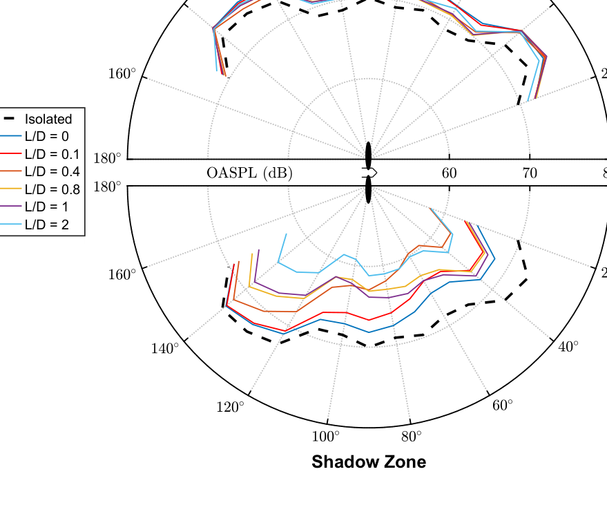 A A A Volume : 44 Part : 2 Acoustic Shielding and Scattering E ff ects of a Propeller Mounted Above a Flat PlateLiam Hanson 1PhD Candidate Department of Mechanical Engineering, University of Bristol, Queens Building, University Walk, Bristol, BS8 1TR, United KingdomKabilan Baskaran 2Research Associate Department of Mechanical Engineering, University of Bristol, Queens Building, University Walk, Bristol, BS8 1TR, United KingdomBin Zang 3Lecturer Department of Aerospace Engineering, University of Bristol, Queens Building, University Walk, Bristol, BS8 1TR, United KingdomMahdi Azarpeyvand 4Professor of Aerodynamics and Aeroacoustics Department of Aerospace Engineering, University of Bristol, Queens Building, University Walk, Bristol, BS8 1TR, United KingdomABSTRACT Experiments were carried out within an aeroacoustic wind tunnel facility to investigate acoustic scattering and shielding e ff ects of a propeller being placed above a semi-infinite flat plate. The position of the flat plate trailing edge was adjusted relative to the propeller which was tested in static conditions with a constant rotational rate of 5000 RPM. Far-field noise was collected by a pair of microphone arcs in the reflection and shadow zone regions respectively. E ff ects of installation on the overall sound pressure level and first blade passing frequency tone was studied. Moreover the magnitude-squared coherence and cross spectrum phase data between selected microphone pairs were analysed. Significant amplification and attenuation can be observed with changing relative locations due to complex acoustic interactions between the propeller and flat plate surface and trailing edge. There are locations with significant potential for noise attenuation and directivity manipulation in terms of tonal and broadband noise content of the propeller. Appreciable changes in1 liam.hanson@bristol.ac.uk2 kabilan@iitism.ac.in3 nick.zang@bristol.ac.uk4 m.azarpeyvand@bristol.ac.uka slaty. inter.noise 21-24 AUGUST SCOTTISH EVENT CAMPUS O ¥, ? GLASGOW the first blade passing frequency phase was seen when installed cases were compared to the baseline isolated propeller case. Reductions of up to 16.3 dB in the first blade passing frequency tone due to the presence of notable shielding were observed.1. INTRODUCTIONWith the push towards greener aviation, electrification of aircraft is being pursued by governments, industry and academia worldwide [1]. Design choices as a result of these e ff orts are increasingly capitalising on the numerous potential benefits of propeller-based propulsion architectures. Unlike conventional jet fuel powered aircraft, where jet fuel consumption will reduce the weight during flight, electric battery powered aircraft masses will remain constant [2]. A benefit of propellers is their low thrust specific fuel consumption which when paired with current limitations on battery storage and weight is vital for increasing the range of aircraft [3]. Concepts such as Leading Edge Asynchronous Propellers Technology (LEAPTech) which consists of multiple tractor propellers mounted at the leading edge of a wing have drawn attention through increasing the maximum lift coe ffi cient of aircraft; o ff ering maximum range at cruise conditions while maintaining takeo ff and landing performance [4]. Engine failure in these concepts could have severe impacts on the stall behaviour of the aircraft [5] along with a noise penalty associated with the design [6]. As such, concepts such as a wing trailing edge mounted distributed propulsion system have been proposed [5]. Through positioning propellers on aircraft wings, complex aerodynamic and acoustic interactions of propellers with wing and airframe structures will be introduced. Noise generated by the propellers will radiate and interact with any adjacent structures leading to scattering of the sound waves produced. In addition, by incorporating structures such as wings as a physical barrier between the propeller noise source and the ground, potentially beneficial acoustic shielding e ff ects can minimise the noise generated by engines and propellers and alter the directivity and magnitude of the noise generated. Many existing studies explore the aerodynamic and aeroacoustic performance of isolated propellers in various modes of operation such as in hover, transition and forward flight [7–9]. Limited existing literature considers the noise scattering and shielding e ff ects due to interactions between propellers and wings or the more fundamental case of propeller-flat plate interactions. Agarwal and Dowling [10] utilised boundary element calculations using a point monopole source above two dimensional geometries and a three dimensional "Silent Aircraft" geometry to evaluate acoustic shielding e ff ects for low frequencies. Their results indicated a significant amount of shielding can be obtained in the shadow region where there is no direct line of sight between the noise source and observer. Müller et al. [11] also utilised boundary element method simulations to evaluate an over-the-wing propeller configuration and compared its performance to a conventional tractor setup in cruise conditions. Their simulations showed a reduction of 6 dB in the SPL on the ground when compared to a conventional configuration. Stephens and Envia [12] explored the barrier theory and half-plane di ff raction theory for shielding attenuation by conducting experiments with an open rotor positioned over a simplified wing. They found a short barrier positioned near the open rotor could provide up to an 8.5 dB reduction of noise at some directivities with tonal noise shielded in particular. Neither of the theories they compared to gave accurate results; over-predicting the attenuation levels. More recent studies by Viera et al. [13] investigated experimentally the level of shielding and directivity of the noise source and its relation to the shielding body geometry. Their experiments considered a monopole source