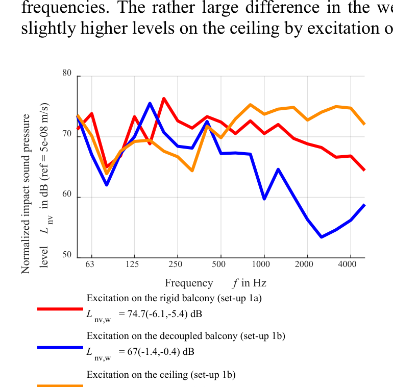 A A A Volume : 44 Part : 2 Impact Sound Insulation of thermally insulated Balconies Lucas Heidemann 1 University of Applied Sciences Stuttgart Schellingstrasse 24 70174 Stuttgart, Germany Jochen Scheck 2 University of Applied Sciences Stuttgart Schellingstrasse 24 70174 Stuttgart, Germany STEP GmbH Brückenstrasse 9, 71364 Winnenden, Germany Berndt Zeitler 3 University of Applied Sciences Stuttgart Schellingstrasse 24. 70174 Stuttgart, GermanyABSTRACT With the increasing urban densification, balconies are gaining in popularity as they improve the living quality in homes. Thermal insulation between balconies and the building’s façade is state of the art. In Germany the most popular balcony construction is a reinforced concrete balcony, separated from the building by a thermal insulation element (TIE), which is meant to reduce the thermal energy loss and thus ensure the sustainability of buildings. The impact sound transmission from balconies, however, is a problem that has not been addressed enough to date. The main goal of the project is to provide acoustic quantities, e.g., an impact sound reduction, for a TIE that can be used to compare the acoustical quality of products and to predict the impact sound pressure levels within the building using the standard EN ISO 12354-2. Experimental and numerical studies have been carried out on various ceiling-balcony mock-ups without and with TIEs e.g., by means of experimental modal analysis and finite element models. This paper will show the effect that various parameters have on the impact sound insulation. Additionally, the measurements on the test set-up will be compared to measurements on building sites.1. INTRODUCTIONThe increase in airborne sound insulation against outdoor noise, achieved by the development of higher quality walls and windows, leads to an increased sensitivity of the inhabitants towards noise that is generated by neighbours. Furthermore, outside areas of flats, such as balconies, are becoming more popular, which leads to higher impact sound immission that can cause disturbances. These two points were considered in 2018, when the German standard of requirements on sound insulation in buildings DIN 4109 [1] was revised. This standard now contains requirements for balconies on the1 lucas.heidemann@hft-stuttgart.de 2 jochen.scheck@hft-stuttgart.de 3 berndt.zeitler@hft-stuttgart.dea Shea mar ce 21-24 AUGUST SCOTTISH BENT caso normalized impact sound pressure level as L ’ n,w ≤ 58 dB. However, for loggias, which are often difficult to differentiate from balconies in modern buildings, the requirement is L ’ n,w ≤ 50 dB.In Germany the most popular balcony construction is a reinforced concrete balcony, separated from the building by a thermal insulation element (TIE) meant to reduce the thermal energy loss. The design of the TIE is primarily based on static requirements. The elements consist of reinforced bars and thrust bearings, sheeted by thermally insulating material such as extruded polystyrene. The main goal of this research project is to provide characteristic acoustical values for a TIE that can be used to compare products and to predict the sound transmission in buildings. A first step to achieve this is to, through measurement and numerical investigations, understand the structure-borne sound transmission through these TIEs.DIN 4109 contains a method using single number values and vibration reduction indices to predict the impact sound transmission in buildings. Material parameters of the building elements are thereby used as “input parameters”. This method can be applied to balconies in the same way as currently done for floors, namely according to Part 2 of the German standard [2], however currently no standardized laboratory test procedure exists to determine the “input value” for the balconies, although the draft for a European Assessment Document, which includes one of the later presented methods is already published [3]. This testing procedure shall also provide values for a frequency dependent prediction following the international standard for building acoustics EN 12354-2 [4]. This paper describes the development of the testing procedure and an approach to predict the impact sound transmission of balconies.2. STRUCTURE BORNE SOUND TRANSMISSION FROM BALCONIES IN BUILDINGSThe most relevant requirements of impact or structure borne sound transmission from balconies are along the diagonal path into an adjacent room of a second unit as shown in Figure 1. If the balcony is not separated from the building using a TIE, it can be treated as a ceiling.Own unit (outer area)Own unit (inside)Thermal insulating elementAdjacent unit (inside)Figure 1: Diagonal impact sound transmission of a thermally insulated balcony into a receiving room of an adjacent unit.The prediction can then be done according to ISO 12354-2 [4], considering the sound transmission of each direct and first-degree flanking path. This method allows a prediction both with single number values and frequency dependent values.For the diagonal transmission two approaches can be chosen. In this paper the model for vertical impact sound transmission is used (Figure 1, Figure 2). The resulting normalized impact sound pressure level is calculated considering the ceiling and all flanking transmission paths according to Equation (1).The separating building element is the ceiling and the number of flanking paths is determined by the number of radiating walls. The TIE is then considered as a reduction of the direct path and all paths that contain the ceiling, in analogy to a floating floor. Another way to predict the diagonal transmission from the balcony is to use the EN 12354-2 model for horizontal transmission where only two flanking paths are considered. The effect of the TIE is then described by an insertion loss on the flanking path that contains the ceiling (Figure 3).𝐿𝐿 n ′ = 10 lg ൭10 𝐿 𝐿 n,d 10 + 10𝑛𝑛൱ in dB (1)𝐿 