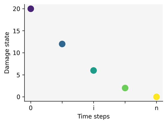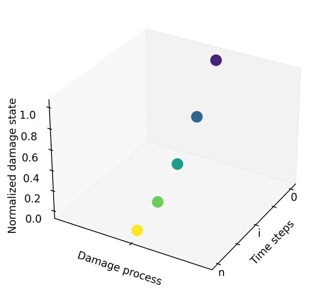 A A A Volume : 44 Part : 2 Investigation of the applicability of recurrent neural networks for structural health monitoring in the frequency domainLukas Outzen 1Tobias P. Ring 2Sabine C. Langer 3Technische Universität Braunschweig, Institute for Acoustics Langer Kamp 19, 38106 Braunschweig, GermanyABSTRACT Structural health monitoring (SHM) aims to detect or predict state changes or damages in engineering structures. In order to discriminate between various damage characteristics and locations, the SHM system requires relevant information about the structure as well as a suitable method to evaluate these. This paper explores a data-driven SHM approach that models damage processes using recurrent neural networks. As model input data, the machine learning algorithm uses sequential frequency domain data at consecutive steps during the advancing damage process. From the change in transfer functions that occurs during structural changes, the model derives information about the state of the monitored object. In order to discuss the potentials and limitations of this modeling approach, a simple bolted structure with non-trivial changes in the frequency response is employed. A gradual damage process is simulated by incrementally loosening one of the joints. The resulting sequences of transfer functions are used as input to the recurrent neural network model and related to the respective preload force. By varying the data sequences used for model training and application, the functioning of the modeling process is investigated. The possibility of inversely learning from the model about damage indicators by analyzing e ff ective input values is discussed.1. INTRODUCTIONIn order to prevent catastrophic failures and maximize the economic e ffi ciency of civil structures, structural changes must be reliably detected and evaluated as early as possible. Research in this field has been ongoing for several decades and is still very active. Recently, data-driven methods have gained increasing interest in the research community. The abundance of readily available machine learning (ML) algorithms, coupled with the increasing availability of computing power, make these methods an attractive alternative to traditional approaches. While some SHM methods rely, for example, on optical phenomena or acoustic emissions of a structure, most approaches are based on its vibration behavior [1]. They analyze the vibration1 l.outzen@tu-braunschweig.de2 t.ring@tu-braunschweig.de3 s.langer@tu-braunschweig.dea slaty. inter.noise 21-24 AUGUST SCOTTISH EVENT CAMPUS O ¥, ? GLASGOW response of the structure in the time domain or the frequency domain in order to find anomalies or patterns that indicate the presence, location and severity of structural changes. The majority of the vibration-based methods utilize the natural frequencies and / or the mode shapes of the structure and compare their initial state (considered as healthy state) to the current state [2]. The underlying principle of these approaches is that the mass-, sti ff ness- and damping properties of the structure are altered by structural damage [3]. These changes of dynamic properties have an impact on the measured data and hence can be attributed to occurrences and locations of the structural change. For the extraction of these damage indications from the frequency-domain data, the ML-based methods employ various di ff erent data-driven approaches to characterize discrepancies between the initial state and the current state of the structure [4]. However, when applying these methods to real- world SHM scenarios, there are multiple challenges arising, some of which will be addressed in the next chapter. Instead of classifying the state of the structure into the two possible states healthy and damaged , the approach of this contribution models the gradual damage process. Therefore, multiple data-processing units are coupled to build a data-driven model, the core of which is a recurrent neural network (RNN). This allows the model to relate the consecutive steps of individual measurements to an integral sequential damage process. This approach has first been presented in [5]. For this work, the method has been extended by a feature extraction and dimensionality reduction step using convolutional layers. The focus of the studies lies on the investigation of the potentials and challenges of this approach. The paper is structured as follows. In the next chapter, challenges of a real-world application of an SHM system and requirements for the modeling approach to be developed are discussed. After the exemplary structure considered in this paper has been introduced in Chapter 3, the proposed methodology is explained in detail in Chapter 4. Chapter 5 presents a series of investigations by specifying the di ff erent modeling tasks and discussing the results, respectively. Subsequently, the relevance of the interpretability of the data-driven models is discussed and first results presented in Chapter 6, before the insights of this paper are concluded in Chapter 7.2. CHALLENGES AND MODEL REQUIREMENTSAssociating structural damages to corresponding changes in the frequency domain of the vibrating structure is a promising approach in SHM research. However, there are multiple challenges on the way to successfully implementing such a monitoring system. Some of these challenges and consequential model requirements are described in this chapter.1. When analyzing simple structures, the changes in the frequency response of a system can be interpreted with simple methods, e.g. peak-fitting of the resonance frequencies or visual inspection [5]. However, the frequency responses of realistic structures are much more complex and cannot be analyzed as easily, as will be shown in Chapter 3. Hence, the model must be able to extract complex information from the frequency domain data autonomously.2. Another challenge concerning the applicability of frequency domain-based methods is the absence
