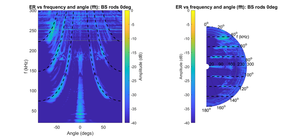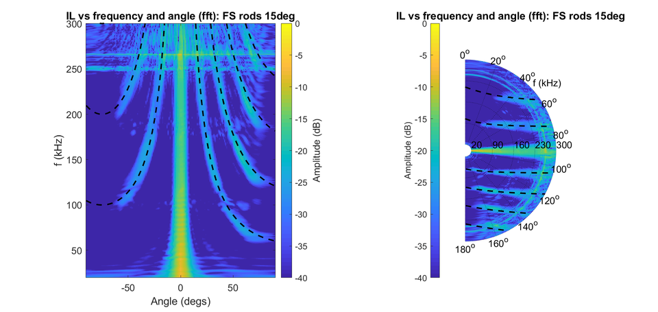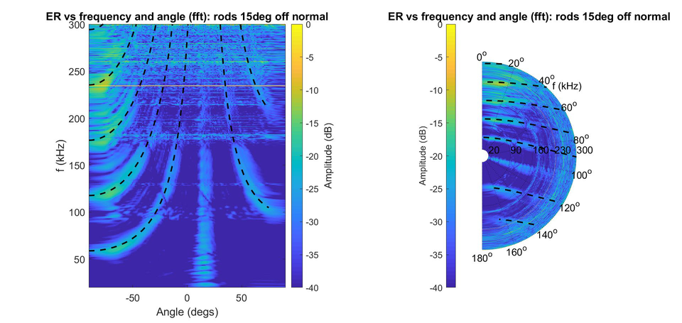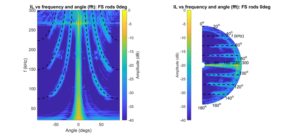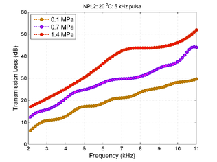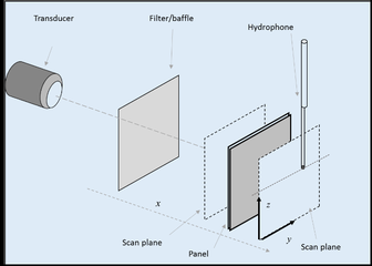 A A A Volume : 44 Part : 2 The use of a parametric array source and nearfield scanning in the characterisation of panel materials for underwater acousticsLian Wang, Stephen Robinson, Victor HumphreyNational Physical Laboratory,Hampton Road, Teddington, UKABSTRACTThe properties of the materials used in underwater acoustics are important for applications such as acoustic windows, reflectors and baffles, acoustic barriers or screens, decoupling materials, and anechoic coatings. To characterise the performance of such materials at frequencies above 1 kHz, measurements are typically undertaken on samples of the material in the form of finite sized panels. Such measurements suffer from uncertainty due to the finite size of the panel (leading to contaminating signals from edge diffraction), and the difficulty in simulating the ideal plane-wave insonification. This paper describes work at the UK National Physical Laboratory to minimise these effects by use of: (i) a parametric array as a sound source that provides a directional beam and short broadband pulses; and (ii) nearfield scanning using a hydrophone to sample the complex sound pressure field interacting with the test sample, decomposing the sound field into its plane-wave components. Results are presented of these techniques applied to measurements in laboratory test tanks at frequencies between a few kilohertz and a few hundred kilohertz to determine the reflection and transmission performance of a range of test samples, including panels consisting of homogeneous polymers and materials with regular periodic structure.1. INTRODUCTIONThe acoustic properties of materials that are used for underwater applications are routinely determined by measurements of insertion loss and reflection loss made on test samples consisting of planar (flat) panels of the material. The measurements are commonly made in a test tank, where hydrophones are typically placed in front and behind the panel to determine the reflected and transmitted acoustic fields, with the incident field being measured without the test panel present. Ideally, to accurately determine the response of the material in this form requires that:i. The test panel is large so that the measurements are not corrupted by diffracted signals from the edges of the sample; ii. The measurements are made in an acoustic free-field with no contamination by reflections from boundaries (such as tanks walls); iii. The test sample is insonified by a plane-wave from a specified direction; iv. The measurements are made at a range such that nearfield effects are not important.To minimise the effect of the contaminating signals outlined in (i) and (ii), it is beneficial to utilise short acoustic pulses such that the desired signals (incident, reflected and transmitted) may be isolated and measured by time-gating techniques (as the contaminating signals follow a longer path and arrive later in time). In addition, to minimise the amplitude of the diffracted signals, it is desirable to take advantage of directivity in the source and receiver. A directional source potentially provides reduced insonification of the test panel edges, and a directional receiver can be used to discriminate against signals arriving at high incidence angles. At NPL, a parametric array is used as a sound source to provide a directional beam and short broadband pulses [ Humphrey, et al, 2008] . The parametric array provides some source directivity to mitigate the effect of reflected signals from the test tank, test panel support structure and diffracted signals from the panel edges. However, diffracted signals from the panel edges can still be problematic at low kilohertz frequencies for panels of the order of 1 m by 1 m in size. To improve performance, a directional receiver is also employed in the form of an eight-element pseudo random hydrophone array. With this arrangement, it is possible to conduct measurements down to as low as 1 kHz (depending on panel performance). In Section 2, a description is provided of the acoustic source, the single hydrophone and array receivers, the experimental set up and results for a test panel [Wang, et al, 2014, Beamiss, et al, 2015 ].Although the above techniques help in the testing of homogeneous panels at normal and oblique incidence, the lack of plane-wave conditions can influence the results due to the incident field containing waves with a range of incident angles [ Humphrey, 1985, Humphrey, 1986, Humphrey, et al, 2008 ]. In addition, if the test panel is not homogeneous and contains internal structure, even the normal incidence results obtained a hydrophone placed close to test panel may give different results depending on the hydrophone position. These latter issues (outlined in (iii) and (iv) above), can be addressed by nearfield scanning using a hydrophone to sample the complex sound pressure field interacting with the test sample, and then decomposing the sound field into its plane-wave components [Humphrey 1986, Williams, 1999]. Results are presented here showing these techniques applied to measurements in laboratory test tanks to determine the reflection and transmission performance of a test sample with regular periodic structure.2. PARAMETRIC ARRAY SOURCE AND DIRECTIONAL RECEIVERA parametric array is used as the acoustic source for the work described here [Humphrey and Berktay, 1985, Humphrey, 2009, Westervelt, 1963]. Such a source uses the non-linear propagation of primary wavefields to generate additional lower frequency (secondary) components that are then used to insonify the test panel. Such a source has the advantage of producing a more directional sound field than would be possible from a linear source of similar size. In the arrangement used for these measurements, the primary transducer is driven with a short pulse of 300 kHz carrier frequency, with a raised cosine bell envelope. The low-frequency secondary waveform generated on axis can be shown to be proportional to the second