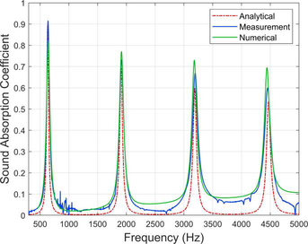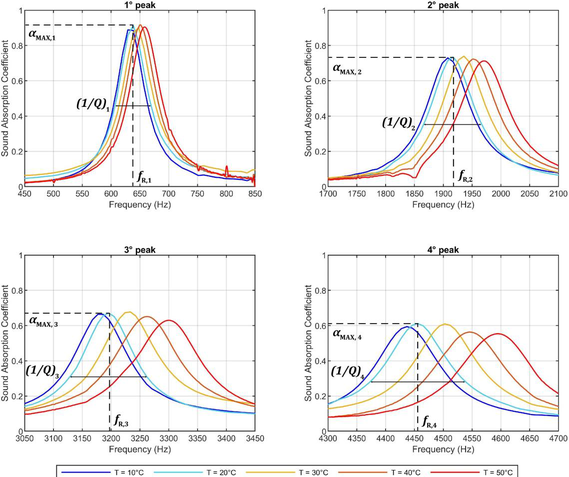 A A A Volume : 44 Part : 2 The influence of thermo-hygrometric conditions on metamaterials’ acoustic performance: an investigation on a 3-D printed coiled-up resonatorMatteo Cingolani 1 Department of Industrial Engineering, Università di Bologna Viale Risorgimento 2, Bologna, 40136, ItalyGioia Fusaro 2 Department of Industrial Engineering, Università di Bologna Viale Risorgimento 2, Bologna, 40136, ItalyMassimo Garai 3 Department of Industrial Engineering, Università di Bologna Viale Risorgimento 2, Bologna, 40136, ItalyABSTRACT In the last decades, coiled-up resonators have become popular within the metamaterial research community for narrow band, low frequency resonances combined to subwavelength thickness. Such structures are particularly suited to one of the most widespread manufacturing processes, i.e. PET-based 3D printing. Acoustic performance of coiled-up resonators depends on the geometrical parameters’ variation, which is influenced by thermo-hygrometric conditions; however, the deformation itself needs to be further investigated. For this reason, the present paper evaluates the correlation between temperature, relative humidity, and the geometrical parameters’ (spiral length and hole diameter) deformations and, consequently, the acoustic performance of a 3D printed coiled-up resonator. A combined approach through analytical, numerical, and experimental measurements quantified the coefficient increasing the temperature (T = 10 – 50 °C) , and the relative humidity (RH = 20 – 50 – 80 %) of the samples. Relative humidity variations turned neglectable discrepancies on sound absorption’s peaks. On the other hand, the increase in temperature caused a frequency peaks’ shift following an exponential trend. This study can be a starting point for practical applications when the thermos-hygrometric variations are of concern.−−1. INTRODUCTIONMetamaterials have become more and more attractive in a wide range of scientific fields. Also in acoustics, the interest in metamaterials is quickly growing due to the variety of possible applications,1 matteo.cingolani6@unibo.it2 gioia.fusaro@unibo.it3 massimo.garai@unibo.it«te a at inter.noise ausust scornsh eve er ca casPus from room acoustics to environmental noise control. AMMs are basically structures made by holes, channels, or resonant cavities [1-4], with specific absorption properties that go beyond the λ/ 4 mechanism and overcome the limitations of classic fibrous and porous materials. Coiled-up resonator is a specific kind of AMM based on the Helmholtz’s resonance phenomenon and its narrow band acoustic behavior is quite sensitive to variation of the geometrical dimensions. The geometry can be affected by deformations due to thermo-hygrometric variations [5] and the unwanted deformations can alter, consequently, the acoustic properties which the metamaterial had been designed for. Previous studies already investigated the relationship between tempera ture fluctuations and AMMs’ sound absorption [6,7] but experimental test focusing on thermal and hygrometric conditions could highlight a suitability and customizability of such systems in engineering applications.The present paper investigates how thermo-hygrometric variations affect the coiled up resonator geometry [8]. First, the analytical model has been used to design a specimen which has been manufactured through PETG 3-D printing. Then, a climate chamber has been employed to alter the specime n’s temperature (T = 10 – 50 °C) and relative humidity (RH = 20 – 50 – 80 %) The alterations in terms of frequency and amplitude of the resonance peaks were reported to quantify the effects of deformations on the sound absorption properties of the metamaterial under study. The outcomes can be a preliminary study for the tuning of AMMs in practical applications when thermo-hygrometric variations are of concern.– −2. METHOD2.1. Analytical model The coiled-up resonator is made up of a spiral tube embedded in a rigid circular disk and covered by a front panel and a back terminal layer, as shown in Figure 1. The section of the perforation and the spiral is square. The geometrical parameters the acoustical performances depend on are L t the length of the spiral, 2 a the side of the square perforation, and R 0 the radius of the circular sample. The soundFigure 1: Exploded view of the coiled up resonator: the spiral length L t , the side of the square hole 2 a , and diameter of the sample 2 R 0 are highlighted.absorption coefficient of the coiled-up resonator is defined as:1 Z in − Z 0 .2(1)– Z in + Z 0 .α n =where Z 0 the characteristic impedance of air. Z in is the input specific acoustic impedance, defined as:Z in = Z tZ t = (2 a ) 2(2)ϕπ R 20 where ϕ is the porosity of the front panel and Z t is the acoustic impedance at the opening of a tube with rigid termination (8) which depends on the spiral length L t , the effective density ρ ( ω ) and the effective compressibility C ( ω ).2.2. 3-D printingAdditive manufacturing is a widespread method used in acoustics to design metamaterial’s geometries because of affordable costs and wide variety of polymers that can be used. The coiled-up resonator has been manufactured through Fuse Deposition Modelling (FDM) using PETG. Different printing speeds and different printing qualities have been considered during the manufacturing process. Some printing parameters were kept constant: the extruder temperature (225 ◦ ), the platform temperature (80 ◦ ), the infill percentage (30%) and the infill density (2 mm/s). For all the other printing parameters, the finest setups of the printer have been used to obtain as much accuracy as possible. The variable printing parameters are summarized in Table 1 To obtain the most accuracyTable 1: Values of the variable printing parameters: the slow-fine combination of parameters has been used to print the specimen.Printing speed Slow | FastBase speed (mm/s) 50 | 80Travel spee