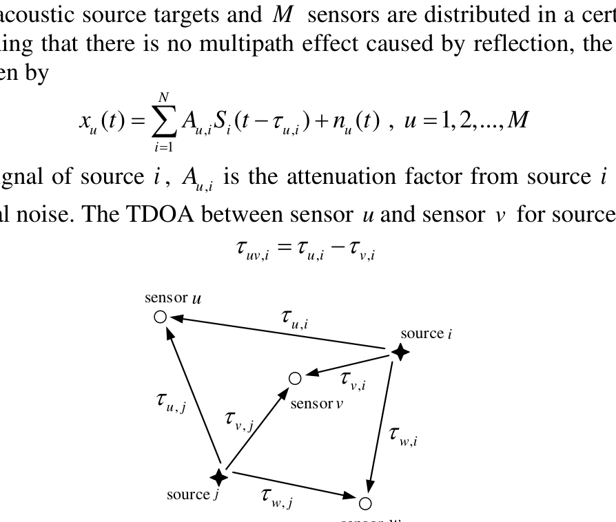 A A A Volume : 44 Part : 2 A Multiple Target Data Association Method for TDOA PassiveLocalization Miao Feng 1 Key Laboratory of Underwater Acoustic Signal Processing of Ministry of Education Southeast University, Nanjing, 210096,China Shiliang FANG 2 Key Laboratory of Underwater Acoustic Signal Processing of Ministry of Education Southeast University, Nanjing ,210096,China Hongli Cao 3 Key Laboratory of Underwater Acoustic Signal Processing of Ministry of Education Southeast University, Nanjing ,210096,ChinaABSTRACT To solve the problem of multi-target data association in an underwater acoustic passive positioning system, a new algorithm focused on data association of Time Difference of Arrival (TDOA) is studied. Firstly, the TDOA trajectory is modeled as a linear function. According to the continuous measurement values within a certain period, the expectation maximization algorithm based on the gaussian mixture model is used to fit the TDOA trajectory. Then TDOA measurements that come from the same acoustic source are associated based on zero cyclic sum condition. A quality factor is defined to measure the correct association probability. Finally, simulation results show that the method proposed in this paper can effectively solve the TDOA measurement association problem, and can be used for subsequent source locations. 1. INTRODUCTIONThe localization of underwater acoustic sources is an active research field, which has been applied in the fields of marine environment detection and exploitation. Among them, there are many researches on multiple targets data association but mainly focus on using azimuth information obtained from direction finding to locate targets, while there are few researches on data association using TDOA directly. In terms of multi-target localization based on TDOA Claudio et al. employ the ROOT-MUSIC algorithm and estimate source positions by clustering of raw TDOA estimates [1]. This technique requires several frames of data to get a consistent cluster. Claudio et al. showThis work was supported in part by the Fundamental Research Funds for the Central Universities under Grant No. 2242021k30019, in part by the Belt and Road Fund on Water and Sustainability(Hydro-Lab, Hohai University & Nanjing Hydraulic Research Institute) under Grant No. 2021490811, and in part by the National Natural Science Funds of China under Grant Nos. 91938203. 1 230189078@seu.edu.cn, 2 slfang@seu.edu.cn, 3 honglicao@seu.edu.cn that cluster centers are robust estimates of source locations. Lee et al. considered all delays corresponding to the threshold GCC-PHAT as candidates. A conditional data likelihood model based on a measurement hypothesis is implemented by the particle filter [2]. This method can be applied to initialize the source location. Scheuing and Yang [3] consider the conditions that TDOA from the same source must meet, such as the zero cycle sum condition and the grating condition, to eliminate invalid TDOA combinations before positioning.This paper proposes an algorithm to locate multiple underwater targets. According to the time continuity of TDOA, the expectation maximization algorithm based on the Gaussian mixed model is used to fit the trajectory of TDOA measurement values among sensors. After obtaining multiple TDOA trajectories, it is required to correctly associate TDOA data with different sources for target positioning. The zero cyclic sum condition based on TDOA trajectory is used to evaluate the possibility that TDOA values of different sensor pairs are from the same target. According to the evaluation results, a method similar to DATMM is applied to associate multi-target TDOA [3].2. SIGNAL MODELWe assume N acoustic source targets and M sensors are distributed in a certain area, as shown in Figure 1. Assuming that there is no multipath effect caused by reflection, the signal received by the sensor u is given byN= = − + = (1)u u i i u i u i x t A S t n t u M , , 1 ( ) ( ) ( ) , 1,2,...,where ( ) i S t is the signal of source i , , u i A is the attenuation factor from source i to sensor u , ( ) u n tis the environmental noise. The TDOA between sensor u and sensor v for source i is, , , uv i u i v i = −(2)sensor u, u i sourcei, v i , u j vsensor, v j , w i , w j sourcejwsensorFigure 1:Assuming N acoustic sources and M sensorsWe use the classical GCC method to estimate the TDOA between sensor u and sensor v . Since there may be true peaks and spurious peaks at the same time due to the existence of noise, a conservative threshold is used to extract TDOA in order not to lose the true peaks.1 ˆ ˆ { : } uv uv uv R = (3)where uv R is generalized cross correlation and 1 is the threshold. Usually, the number of TDOA extracted is greater than the number of targets. 3. MULTIPLE TARGET TDOA DATA ASSOCIATIONDue to the influence of environmental noise and measurement error, the TDOA measurement is not always accurate, and the corresponding relationship between TDOA measurements and specific target is ambiguous in the case of multiple targets. Considering these two factors, multi-target localization is divided into two parts. The first step is to find the correct TDOA trajectory, and the second step is to associate multiple TDOA trajectories obtained in the first step with the target. 3.1. TDOA Trajectories Fitting of Multiple SourcesStudies show [4] that although sometimes there is no peak at the real TDOA, the distribution of the real peak is relatively stable over a period, while the spurious peak caused by noise is randomly distributed, as shown in Figure 2 and Figure 3. Hence, although not all the TDOA values we extracted in the previous section are correct, we can still use the time stability of the real TDOA peak to extract the TDOA trajectory as a whole.Figure 2: Cross-correlation between sensors Figure 3: TDOA trajectoryWe model the TDOA trajectory as a linear function which is a valid approximation in the case of slow target movement or short time interval:, 1,2,..