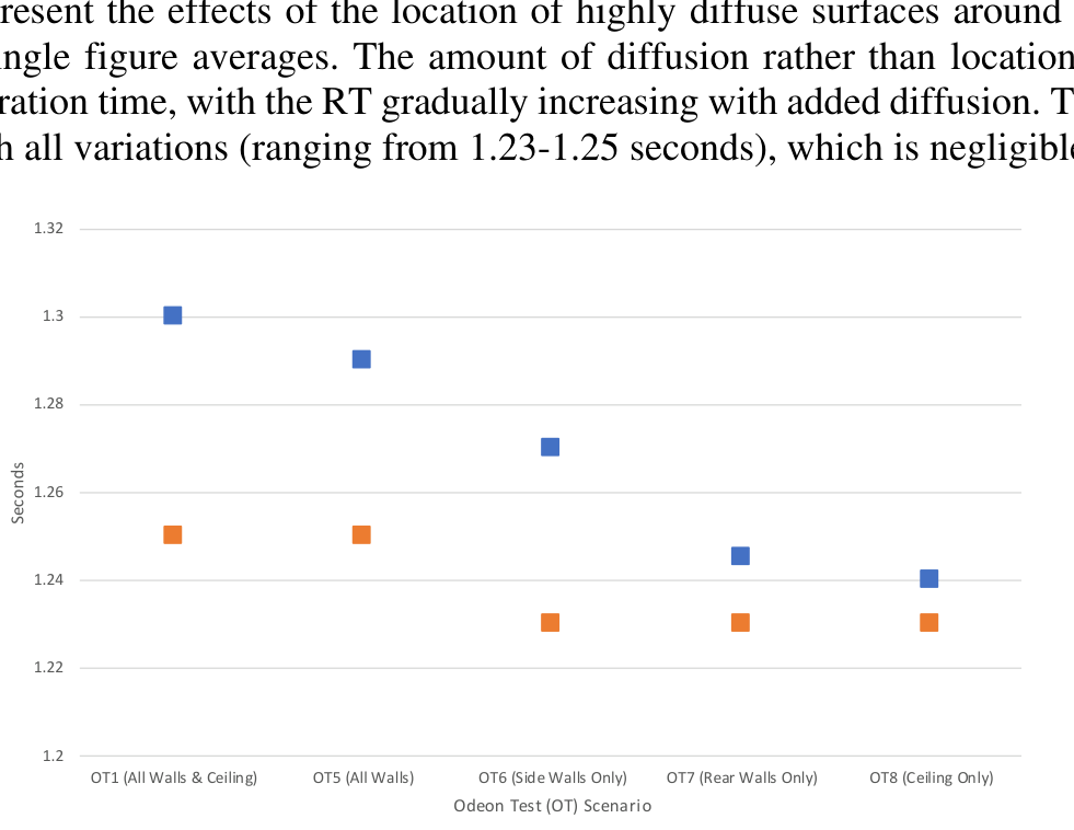A A A Volume : 44 Part : 2 USING NON-WAVE BASED MODELLING TO EXPLORE HOW MUCH ACOUSTIC DIFFUSION IS TOO MUCH IN A CONCERT HALL Michael Fort 1 London South Bank University 103 Borough Rd, London SE1 0AAABSTRACT This report explores the relationship between acoustic surface diffusion and acoustical character inconcert halls by using non-waved based modelling. Measurements were undertaken in a small con-cert hall to use as a baseline, which is then transferred into ODEON to experiment with the acous-tic parameters further. Using the ODEON modelling results, the relationship between amount of diffusion vs scattering coefficient to achieve optimal objective parameters in a concert hall accord-ing were visualised. These trends were then tested on existing famous concert hall models, e.g.Musikvereinssaal. The experiments showed that when considering how much diffusion is too much in a concert hall, the statistical amount of diffusion is less of a factor, when compared to retaining strong early re- flections from side walls and ceilings and the amount of scattering provided by diffuse surfaces. Forexample, a hall with a high amount of diffusion, can still be a subjectively “good” hall, if it still hasstrong early reflections on the side walls and ceilings, when compared to a hall with geometry thatdoes not provide strong lateral reflections.1. INTRODUCTIONThis paper explores the relationship between acoustic surface diffusion and acoustical character in concert halls by using geometric modelling. Measurements were undertaken in a small concert hall to use as a baseline, which is then transferred into ODEON to experiment with the acoustic parameters further. Using the ODEON modelling results, the relationship between amount of diffusion vs scat- tering coefficient to achieve optimal objective parameters in a concert hall according were visualised. These trends were then tested on existing famous concert hall models. 2. EXISTING KNOWLEDGE2.1. Diffusion in Auditoria In concert halls and performance spaces, acoustic diffusion is an important aspect of the room. It will provide diffuse reflections across all angles, reducing unwanted strong reflections or focusing. How- ever, in modern concert hall design, there is more and more diffusion being added, with some new halls having almost all surfaces diffuse, such as the Elbphilharmonie in Hamburg. Recent research has shown that engaging concert hall acoustics are made up of temporal envelope preserving reflec- tions, which means that rooms are identified by the strong early reflections 1 . This relies on the early acoustic signature of the hall and less on the diffuse and reverberant sound field. Therefore, too much surface diffusion can reduce the effect of this early acoustic signature, which in turn can make the acoustics of the hall less engaging.1 fortm@lsbu.ac.ukworm 2022 Reflections from textured surfaces at least partly follow Lambert’s law of reflecting acoustic energy to all directions irrespective of angle of incidence. They therefore tend to “hold” acoustic energy close to the stage, as surfaces closer to the stage more strongly irradiate than surfaces further away 2 . When measuring in real halls however, a decrease in variation of reverberation time with increased diffusion is shown. Conversely, a higher variation in sound strength, relating to source-receiver distance, when there is an increase in diffuse surface texture. Measurements of both speech and sound were undertaken by Wettschurek in the 1970s, testing the perception thresholds of early reflections using a binaural virtual acoustics system 3 . Wettschurek’s research showed that when the perception threshold measurements were being undertaken, reflections at different delay times and directions had very different subjective effects 3 . Additionally, the overall listening level had an influence on the subjective quality, even when the reflection level was close to the perception threshold 4 . An example of this is during a musical crescendo, the side reflections are more perceivable than the frontal or rear reflections. Therefore, this research is consistent with the listening experience, and that concert halls lacking lateral reflections also typically exhibit poor dy- namic spatial responsiveness 4 . This is a prime example of too much diffusion in a concert hall being a negative feature, as the early reflections will not be as strong as the reverberant and diffuse sound field. On the other hand, in Mike Barron’s research he states that overall, the diffuse sound field with a suitable reverberation time is likely to offer good acoustics 5 . However, subjective diffusion (i.e., envelopment in the listeners position) and good values for strength and clarity can be achieved in other ways, without need the space to be physically highly diffuse 5 . 2.2 Simulating Diffusion in Computer Models In order to easily predict and design a hall with regards to diffusion, computer models can be used. Computer models have been used in this research using data based on physical measurements taken in the small concert hall. Ray-based methods such as ray tracing and radiosity are considerably faster and less computationally expensive than wave-based methods. However, the negatives include the loss of accuracy in low frequencies and the wave nature of sound demonstrated in phenomena (e.g., diffraction) not being considered 6 . The ray tracing method uses a large number of particles, which are emitted in various directions from a source point. These particles are then traced across a room, and lose energy at each reflection, dependent of the absorption coefficient of each surface 7.2. 2.1 ODEON modelling The ODEON computer model for acoustics in auditoria is intended for use both in design (by quickly predicting room acoustical indices) and in research (by forming the bases of an auralisation system and promoting the study of various phenomena in room acoustics). Both conflicting deman