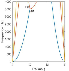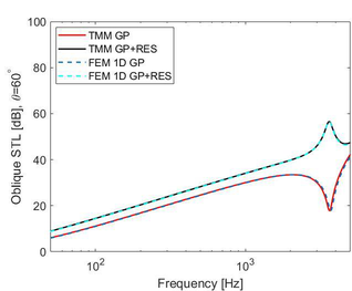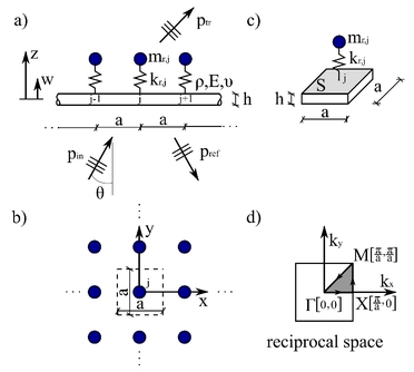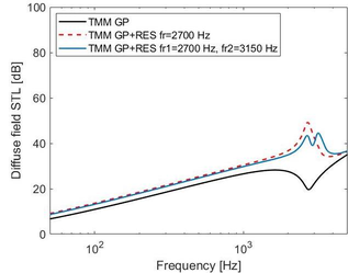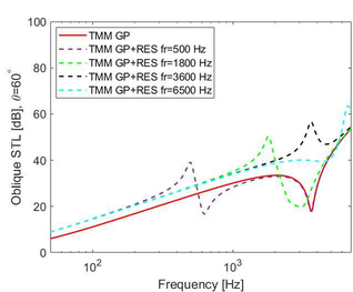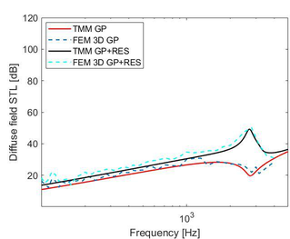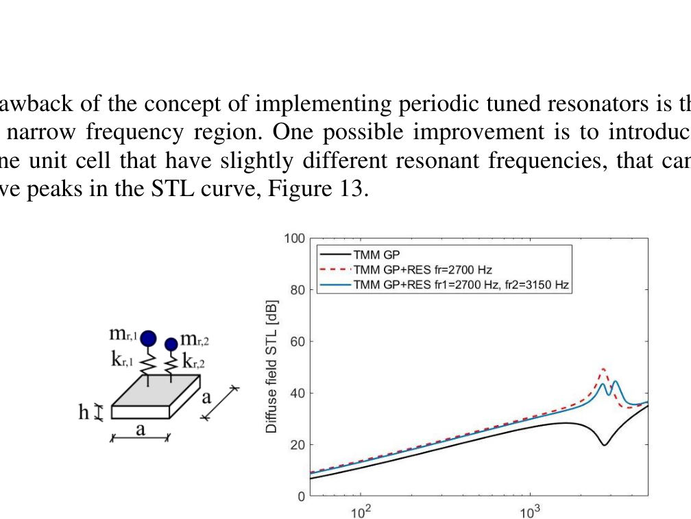 A A A Volume : 44 Part : 2 Numerical investigation of sound transmission through single and double walls with periodic arrays of resonators Milica Jovanoska 1 Faculty of Civil Engineering Ss. Cyril and Methodius University Blvd. Partizanski Odredi 24, Skopje, N. Macedonia Todorka Samardzioska 2 Faculty of Civil Engineering Ss. Cyril and Methodius University Blvd. Partizanski Odredi 24, Skopje, N. MacedoniaABSTRACT Lightweight partition walls are widely used in buildings, especially nowadays when sustainability is of a major interest. At the same time noise pollution is becoming a growing problem across the globe, as a result of the life dynamics. All this implies the need to find possible solutions for sound insulation enhancement of the lightweight partitions. This paper is focused on exploring the possibilities of exploiting the dynamic effects of periodic subwavelength arrays of resonators for sound insulation improvements. It can be shown that the resonance mode of the resonators couples with the plate vibration in the way of breaking the mass law and overcoming some phenomena like coincidence effect, mass-air-mass resonance, etc. In order to improve the sound transmission loss in a specific frequency region, periodic resonant units are tuned and introduced to single and double panels. The investigation of considered panels under acoustic field excitation is conducted using different methods. Sound transmission loss curves and dispersion diagrams are calculated. Finite element method is employed for this purpose, but also the theory of elasticity and well-known transfer matrix method (TMM). Several designs of resonators are proposed.1. INTRODUCTIONAcoustic resonant metamaterials have recently become very popular among the researchers for the purpose of sound wave control [1],[2],[3]. One can define them as artificial periodic structures with unique acoustic wave manipulation properties, owing to the dynamic influence of their local resonant units. Z. Liu et al., [4], have fabricated periodic structure with silicone rubber coated lead sphere as unit cell and experimentally prove the existence of such local resonance band gap. The drawback of this concept is that this interesting power for wave manipulation, works only in specific narrow frequency band associated with the resonant frequency of the resonant units, [5]. Nevertheless, from the extensive research in the last decade in the field of acoustic resonant metamaterials, it can be concluded that their application for sound insulation treatment is feasible, but there are still many1 m.jovanoska@gf.ukim.edu.mk 2 samardzioska@gf.ukim.edu.mk challenges for the researchers. Different design ideas are already explored for possible improvements in the region of coincidence [6], [7], [8], [9], mass-air-mass resonance [10], [11], [12] ring frequency [13], low-mid frequencies [14], [15], [16] etc.The interest of this paper is to investigate the possibilities of using periodically attached resonant units to suppress the wave motion of a panel that is exposed to acoustic excitation and to enhance its sound transmission loss. Single and double gypsum panels are selected as host structures. Oblique and diffuse incidence is considered. The dynamic effect of the resonators is implemented in the transfer matrix method and finite element method through the effective mass density, from which the sound transmission loss is calculated. Finite element method is also used to calculate the dispersion diagrams and investigate the band gap creation for different designs of resonators.2. METAMATERIAL MODELLING2.1. Effective mass density method (EM)Figure 1: Metamaterial model: a) infinite thin plate with periodic resonators, b) periodic arrangement of the resonators, c) unit cell, d) reciprocal space, irreducible Brillouin zone Г X M-Г.For elastic host plate with periodically attached single degree of freedom mass-spring units with periodicity constant much smaller than the wavelength of the motion in the plate, effective mass density representation is possible, [6]. This concept allows the use of equations derived for the host plate simply by replacing the mass density term with a frequency dependent effective mass density that incorporate the dynamic influence of the resonant units:𝜌 𝑟,𝑗(1)𝜌 𝑒𝑓𝑓 = 𝜌+1 − 𝜔 22 (1+𝑖𝜂𝑟,𝑗)𝜔𝑟,𝑗where ω r,j is the resonance frequency of the j-th resonator, damping is introduced by complex spring constant k r,j (1+iη r,j ) , η r,j is the loss factor.2.2. Transfer matrix method (TMM) For modelling the unbounded multi-layered systems, transfer matrix method is used. Based on the theory of elasticity and Biot’s theory, 4x4 transfer matrix for elastic-solid layer and 6x6 transfer matrix for elastic-porous layers are given in [17], and for orthotropic solid layer is 6x6, [18],[19]. The transfer matrix for stationary fluid layer is 4x4. The transfer matrices relate the variables V thatee reciprocal space describes the acoustic field of the medium on both sides of a layer considering plane wave propagation:𝑉(𝑀) = [𝑇]𝑉(𝑀 ′ ) (2)Where M and M’ are points near the forward and backward face of each layer. The continuity conditions between adjacent layers are used to build the global transfer matrix. The fluids on both sides of the partition are semi-infinite. From this matrix, the reflection and transmission coefficient can be easily calculated hence the sound transmission loss.For diffuse sound field, where the waves are incident from all direction with equal probability, the sound transmission coefficient can be obtained through integration:∫ [∫ 𝜏(𝜃,𝜙)𝑠𝑖𝑛𝜃𝑐𝑜𝑠𝜃𝑑𝜃]𝑑𝜙 𝜋/2 0 2𝜋 0∫ [∫ 𝑠𝑖𝑛𝜃𝑐𝑜𝑠𝜃𝑑𝜃]𝑑𝜙 𝜋/2 0 2𝜋 0 (3)𝑆𝑇𝐿 𝑑 = −10𝑙𝑜𝑔 102.3. Finite element method (FEM) Finite element method will be used for calculation of the sound transmission loss (STL) 