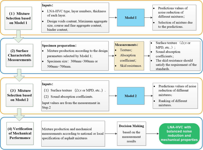 A A A Volume : 44 Part : 2 Design method of asphalt mixture with balanced noise reduction and mechanical properties Mingliang Li 1 , Minmin Yuan 2 , Jun Li 3 Research Institute of Highway Ministry of Transport Xitucheng Road No.8, Beijing, P. R. China Yingtao Li 4 , Wei Zhou 5 , Yaqun Zu 6 Jiangsu Expressway Maintenance Engineering Technology Co., Ltd. Tianyuan West Road No.168, Nanjing, P. R. ChinaABSTRACT A design method of asphalt mixture is proposed for reducing the tyre/road noise while possessing good mechanical properties. Firstly, the target air voids contents are obtained by comparing the simulated sound absorption coefficient curve with noise-frequency curve from practical road surface. Then, models predicting the texture level and sound absorption coefficient based on the given mixture properties, such as porosity, gradation, particle size, asphalt content, etc. as inputs parameters, are applied to preliminarily select the design parameters of the mixture. Test samples are made according to these selected design parameters in the lab, while test vales of the texture level, sound absorption coefficient and the skid resistance of the mixtures are obtained from laboratory measurements. These measurement values are used for predicting the attenuation of the tyre/road levels by means of statistical models. Mixtures possessing superior-predicted noise reducing properties are selected for mechanical performance validation. Mixture design presenting the promising noise reducing properties and satisfying the mechanical performance requirement is considered as the optimal one, and is suggested to be used as the road surface. Road surface designed from this method can both meet the needs of traffic load and the function of noise reducing. 1. INTRODUCTIONNoise pollution, especially road traffic noise, is seriously affecting the physical and mental health, also the life quality of both the drivers and residents in the vicinity. Low noise pavements are widely used in European countries such as the Netherlands, where porous asphalt is adopted for noise reducing on more than 93% of the expressways. With the increased requirement for a better living environment, the impact of road traffic noise has attracted the attention in China year by year,1 ml.li@rioh.cn 2 ccmmyuan@qq.com 3 Jun.li@ rioh.cn 4 21741667@qq.com 5 lygzhouw@126.com 6 1571052345@qq.com21-24 auGUST Scortsi event Cas La inter.noise | ee 2022 especially in the construction of highways and urban roads adjacent to residential areas. Environmental noise is taken as an important evaluation indicator for the design and acceptance of highway engineering. At the same time, the latest version of the Law of China on Prevention and Control of Pollution from Environmental Noise , also clearly states the governmental advocacy and encouragement for innovative work on noise reducing.In existing pavement design specifications, requirements of mechanical properties on the pavement and asphalt mixture are particularly clarified, but the methods of noise reducing design are not given. Considerable methods have been proposed by researchers for designing low-noise pavements, including the adoption of SPERoN and HyRoNE hybrid models for predicting noise reducing in asphalt pavements [1], or based on a number of indoor simulations from large equipment in acoustic chambers or normal sound level meters [2-6]. The predominant type of low-noise pavement is generally a porous asphalt pavement with an air voids content greater than 18% or a fine graded thin overlay [7, 8]. In order to effectively improve the noise reducing performance of the pavement, a separate procedure needs to be considered while designing the pavements. The effect of noise reducing is to be optimized or improved by reasonable structural combination, mixture design, application of new materials, etc..The paper presents a design method towards the balance of noise reducing function and mechanical performance of pavements constructed with low-noise asphalt mixture with high voids contents (LNA-HVC) in China. The method is developed based on years of field investigations and data analyses, and the combination with existing asphalt pavement design methods, which guides the design of low-noise pavements in actual projects and serves as the tool for highway designers.2. TERMS AND DEFINITIONSThe void connectivity is more than 0.5 when the designed voids content of the mixture reaches higher than 14% [9], and when the designed voids content is less than 14%, the proportion of connected voids is relatively small. Besides, the internal pores of the mixture are mainly closed, performing poor noise absorption. In this paper, LNA-HVC is defined as the open-graded or semi-open-graded asphalt mixtures with a skeleton-void structure formed by coarse aggregate, whose designed voids content is 14% or more after compaction.In China, the following types of LNA-HVC pavement are commonly used: (1) Single layer LNA-HVC: whose surface layer thickness is generally between 40 and 50mm, and maximum particle size of the coarse aggregate is not greater than 13mm;(2) Two-layer LNA-HVC: a double-layer structure consisting of an upper LNA-HVC layer with a small maximum aggregate size and a lower layer with a large aggregate size. The thickness of the upper layer is between 20 and 40mm, and that of the lower layer is between 35 and 60mm. The maximum particle size of coarse aggregate in the upper layer of the mixture is no larger than 13mm and the connected void ratio of both upper and lower layers is not less than 14%;(3) Thin layer LNA-HVC: whose thickness is between 25 and 40mm, and maximum particle size of the coarse aggregate is not greater than 10mm;(4) Ultra-thin layer LNA-HVC: whose thickness is between 15mm and 40mm, and the maximum particle size of the coarse aggregate of the mixture is not greater than 10mm. 3. STRUCTURE DESIGN3.1 Measurement and analysis of tyre/road noise Before designing, the in-situ environ