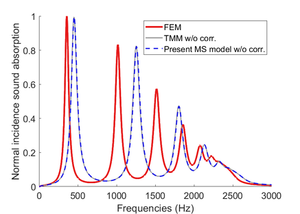 A A A Volume : 44 Part : 2 A mass-spring analogy for modeling the acoustic behaviour of a met- amaterial Maël Lopez 1 , Thomas Dupont 2 Department of Mechanical Engineering, École de Technologie Supérieure 1100, rue Notre-Dame Ouest, Montréal, QC, H3C 1K3, Canada Raymond Panneton 3 Department of Mechanical Engineering, Université de Sherbrooke, CRASH-UdeS 2500 boul. de l'Université, Sherbrooke, Québec, J1K 2R1, CanadaABSTRACT Absorbing sound almost completely at specific frequencies with conventional acoustic materials whose thickness is much smaller than the wavelength is a challenge, particularly at low fre- quencies. For this purpose, acoustic metamaterials are of great interest. The metamaterial stud- ied in this research is called multi-pancake cavities. It is composed of a main pore with a repe- tition of thin annular cavities (pancake cavities). Previous research has shown that this repeti- tion increases the effective compressibility of the main pore. This increase makes it possible to decrease the effective sound speed in the material and, consequently, the main pore resonance frequencies. At these resonances, the metamaterial presents absorption peaks, the first one can have a wavelength to material thickness ratio of more than dozens of times (subwavelength material). To complete the analysis and prediction of absorption peaks (especially secondary peaks) of these metamaterials, this study proposes to adapt a conventional mass-spring model to this metamaterial. Due to the small cavity length-to-diameter ratios, radial propagation is considered inside the annular cavities. This model shows a good agreement with results ob- tained by finite element method and impedance tube measurements. Finally, comparisons with previous theoretical approaches are presented and discussed. 1 INTRODUCTIONAcoustic metamaterials are of great interest to handle low frequency problems. Among them, perfo- rated material with dead-end periodic structure presents several absorption peaks for wavelength higher than their thickness [1]–[6]. Leclaire et al. [1] have studied a metamaterial composed of a main pore with periodically spaced side branch resonators. They have shown that the periodic structure is responsible for decreasing the material effective compressibility. This decrease leads to a diminution1 mael.lopez.1@ens.etsmtl.ca2 thomas.dupont@etsmtl.ca3 raymond.panneton@usherbrooke.caworm 2022 of the effective celerity and consequently a diminution of the material resonance frequencies. To optimize the acoustic effect, Dupont et al. [4] have replaced side branch resonators by thin annular cavities, called pancake cavities, as shown in Figure 1 (a-b). The very small thickness (compared to the diameter) of the cavity imposes that radial propagation dominates inside [7]. Transfer matrix method (TMM) [4], [8] has been previously used to characterize theoretically such metamaterial. Also to describe this metamaterial more precisely a hybrid model (numerical-TMM) has been devel- oped by Kone et al. [6]. Brooke et al. [9] have proposed a model for the effective properties, density and bulk modulus, in linear and nonlinear (high sound pressure level) regimes. Here, we proposed a simplified model in order to better understand the acoustic behaviour of the metamaterial and to estimate the resonance frequencies by solving an eigenvalue problem. This model is based on a mass-spring analogy. Mass-spring analogy has already been used to model metamate- rials [9]–[11]. Viscous and thermal losses are taken into account in the model by considering effective fluid in the main pore and in the pancake cavity with effective fluid method (Johnson-Champoux- Allard model [12]). Necks (pores between two pancake cavities) are identified by masses and the pancake cavities by springs. The radial propagation in the annular pancake cavity imposes that the stiffness (springs) depends on Hankel functions and thus on the frequency. 2 MATERIAL AND MODELworm 20222.1 Material The studied metamaterial is shown in Figure 1 [4]. It is composed of a repetition of identical neck and thin annular air cavity. The neck thickness is ℎ 𝑛 = 1 mm and its radius is 𝑟 𝑛 = 2 mm. The cavity thickness is ℎ 𝑐 = 1 mm and its radius is 𝑟 𝑐 = 21 mm. The sample radius is 𝑅 𝑠𝑎𝑚𝑝𝑙𝑒 = 22.22 mm and the number of periodic unit cell (PUC) is 𝑁= 15 .Bed Reampte(c)(b)(a)Figure 1 : The metamaterial sample, (a) full, (b) half geometry and (c) a schema of a periodic unit cell (PUC).2.2 Mass-spring model Due to the periodic arrangement of the cell, a PUC is first studied. The PUC is composed of a neck backed by a pancake cavity. The cavity is here decomposed in two parts, the first one is an annular dead-end volume (for 𝑟∈[𝑟 𝑛 ; 𝑟 𝑐 ] ) and the second one is the junction (for 𝑟∈[0 ; 𝑟 𝑛 ] ) as shown in Figure 1 (c). For the proposed equivalent mass-spring model, each neck is identified by an equivalent mass and each cavity by an equivalent stiffness. The walls are motionless and perfectly reflective to sound. The thermal and viscous losses are considered by effective fluid media for the necks and the annular pancake cavities. Mass and stiffness are then made complex. The Johnson-Champoux-Allard (JCA) parameters are given in TABLE I with necks identified as circular cross-section pores and the annular pancake cavities as slits. The equivalent mass is equal to𝑀= 𝜌 𝑛 𝐴 𝑛 ℎ 𝑛 , (1)2 the neck cross-section area. Now by looking at the stiffness, because the cavities are thin, only radial propagation is considered inside the cavity. This implies that the stiffness depends on the frequencies and Hankel functions. The acoustic surface impedance, 𝑍 𝑆,𝑑𝑒 , at the interface between the annular dead-end volume and the junction is [7]where 𝜌 𝑛 is the neck effective density and 𝐴 𝑛 = 𝜋𝑟 𝑛(2)ሺ1ሻ ሺ 𝑘 𝑑𝑒 𝑟 𝑛 ሻ −𝐻 1ሺ1ሻ 