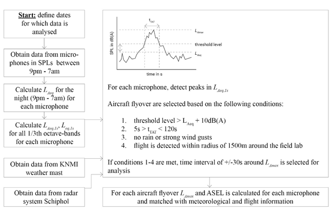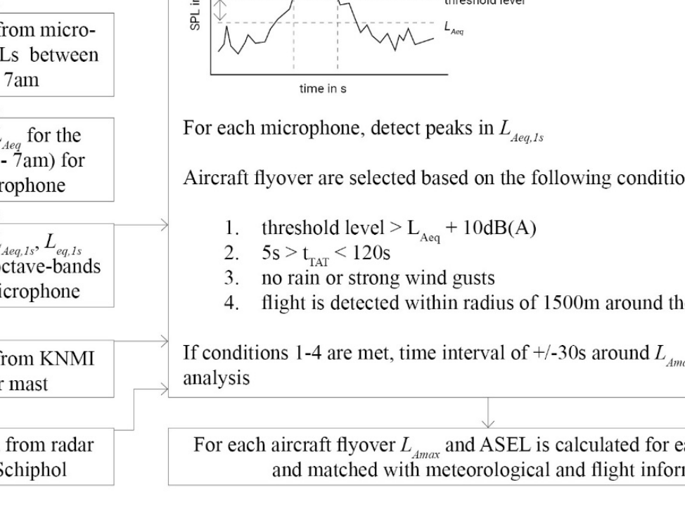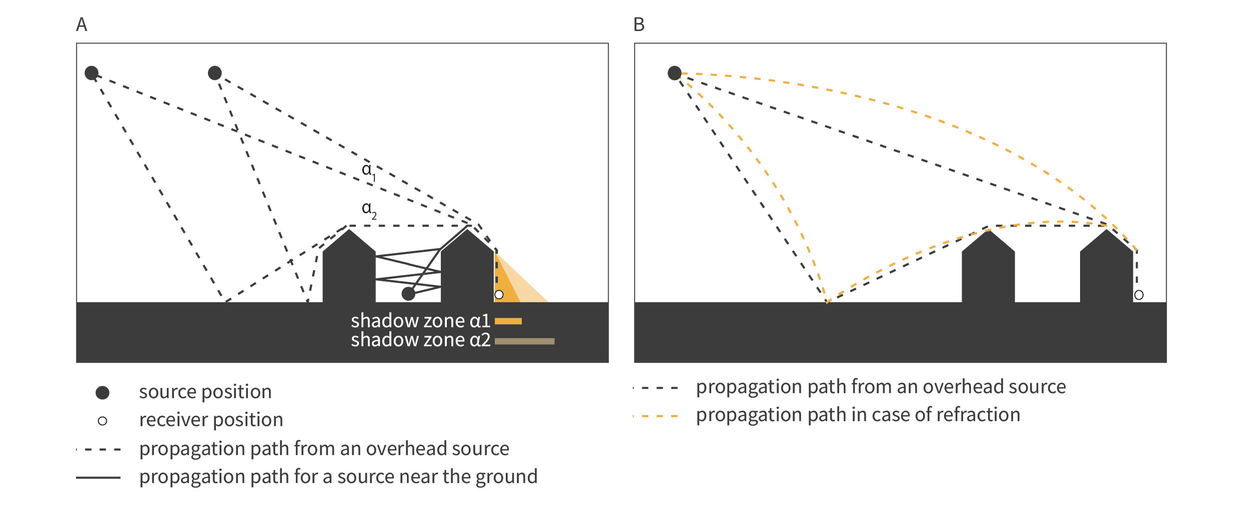 A A A Volume : 44 Part : 2 Assessing the influence of street canyon shape on aircraft noise: results from measurements in courtyards near Amsterdam Schiphol Airport.Martijn Lugten 1 21 Department of Architectural Engineering + Technology, Delft University of Technology, The Netherlands; E-Mail: m.c.lugten@tudelft.nl, P .O. Box 5043, 2600 GA Delft, The Netherlands 2 Amsterdam Institute for Advanced Metropolitan Solutions, Amsterdam, The NetherlandsABSTRACTAircraft noise prediction models traditionally omit buildings to optimize speed. Buildings and vertical surfaces scatter and reflect incident sound, affecting sound levels around buildings and within streets. Previous studies showed the impact of buildings on aircraft noise, based on a small number of measurements. Based on additional numerical models, it was found that the shape of buildings, i.e. a slanted or overhanging roof, lead to lower sound levels compared to streets comprised of vertical and flat surfaces. To examine these findings, a full- scale field lab was built near Amsterdam Schiphol Airport, comprised of shipping containers. The experiment consists of three courtyards, in which ten microphones measure sound levels from aircraft flyovers, near facades facing towards and away from the sound source (airplanes). Measurements are matched with meteorological and radar data, which gives information about the position of aircraft and the local weather conditions. The measurements show substantial differences depending on the position, ranging between 8/9dB(A) for a courtyard with straight facades, up to 14dB(A) for facades in a courtyard with a slanted facade and a building inset. Results can be used to rethink the way areas near airports are designed.1 INTRODUCTIONAircraft noise causes stress-related complaints and has a negative impact on the well-being of residents living close to airports 1,2 . To protect people from excessive noise exposure, noise contours are a commonly used policy instrument, which restrict and regulate the expansion of urban areas where the noise levels exceed the legal thresholds 1 . Within the EU, contours are calculated on the basis of the European Noise Directive (END), which maintains that noise levels are based on the weighed equivalent sound levels ( L den and L night ) 3–5 . However, sound exposure does not automatically lead to annoyance, but rather is the consequence of reciprocal processes between exposure, context and response 6–9 .inter.noise 2-24 august scornsuevearcanmus )())D Figure 1 A) Two source positions with schematic sound paths: being reflected, diffracted around buildings. B) Schematized effect of refraction versus sound propagation without atmospheric refraction.Literature on the annoyance-reducing effects of quiet building sides show the importance of context for the level of noise annoyance. For road traffic noise, a quiet building side is defined as a facade without a direct line of sight to the noise source ( n LOS from now on), where the L Aeq is <45dB(A), or where the relative difference with the exposed facade (Δ L Aeq ) is >10dB(A) 10–15 .The shape and surface characteristics of buildings and streets can abate sound levels around or between buildings to meet the criteria for quiet facades (for example see e.g. 16–18 ). Roof shape, (green) cladding, urban density and building dimensions scatter, diffract or absorb sound, as the sound energy decays due to reflections and diffraction over ridges and protrusions.Since the noise reducing capacity of smart building designs are largely studied in relation to road and rail traffic, it is uncertain to what extent buildings can reduce aircraft noise as well. Theoretically, the position of aircraft means that sound is dispersed from above, limiting the sound abatement by building edges (see Figure 1) (see e.g. 26–28 ). Furthermore, the direction from which the source emits noise, in combination with refraction, changes the angle of incidence of the sound waves as they hit a building 29–31 . This can negate or greatly reduce the noise abating potential of buildings and tall barriers (see Figure 1b) 29,30,32 .For buildings close to the ground track of a flight path, buildings and streets scarcely attenuate any aircraft noise, which means that the sound level near d LOS and n LOS facades are almost equivallent 33–35 . For buildings at a greater distance from flight paths, buildings seem to act like tall barriers, which leads to a difference between n LOS and d LOS facades. However, the design of the street canyons around a façade may affect the sound levels. Reflections between buildings can amplify the sound level (i.e. L Amax levels) within streets with buildings on both sides 33,35 .This is different for sites at the flanks of a flight path, where the horizontal distance between the ground track of an aircraft flyover and a building is larger. For example, a computational study comparing twenty urban locations located less than 1000 metres from a flight path (altitude: 100-200ft) found differences up to 4.6dB between the individual locations 27 . In a different computational study, it was found that canyons with slanted facades and building insets yield a greater sound reduction near n LOS facades compared to canyons with straightshadow zone al shadow zone a2 source position --- propagation path from an overhead source © receiver position = =~ propagation path in case of refraction --- propagation path from an overhead source — propagation path for a source near the ground facades 36 . The results from both studies suggest that urban and architectural shape may reduce aircraft noise in such areas. The results are not backed by measurements or follow-up studies, and atmospheric effects were not, or only rudimentarily, considered. This raises the question as to what extent the design of street canyons influences aircraft noise based on measurements.This article presents the first results of a study which examines thi